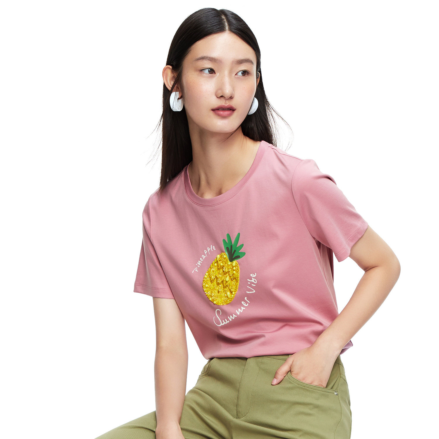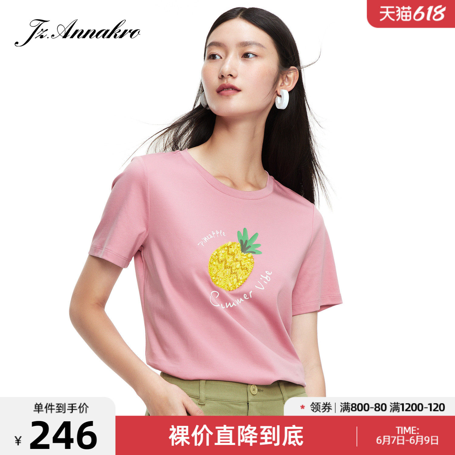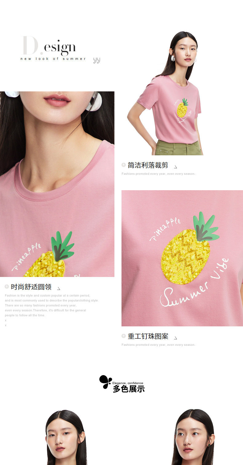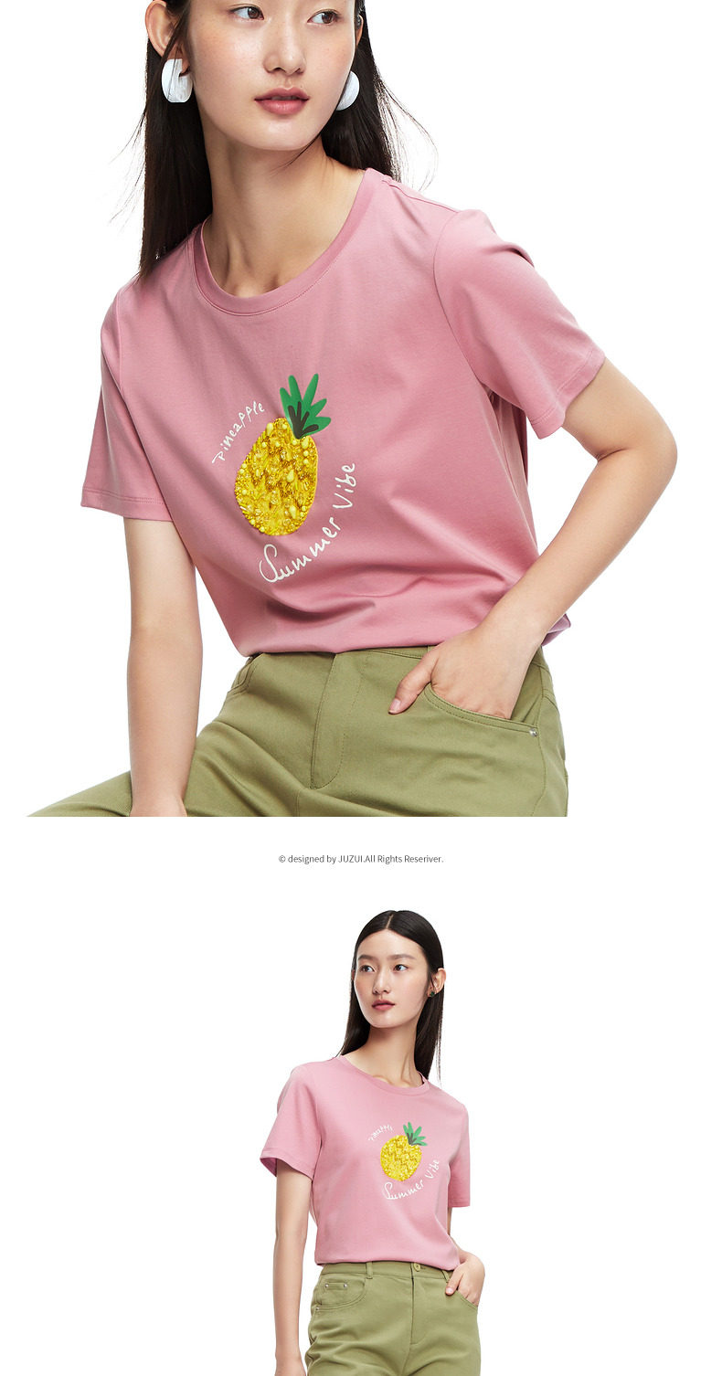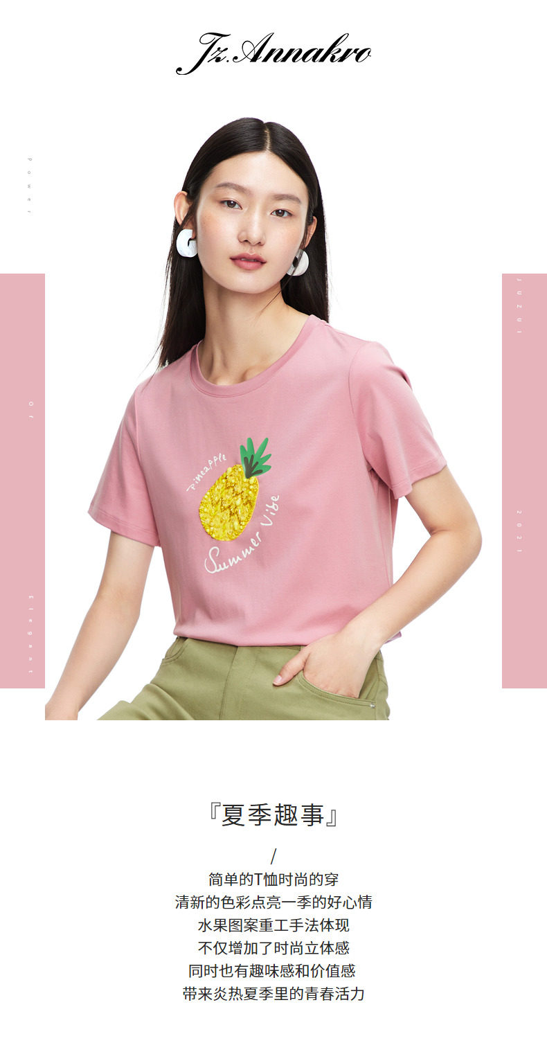 首页 > 玖姿专区 > 玖姿服饰 > 玖姿2021夏季新款安娜蔻系列纯色圆领热带水果串珠时尚女短袖T恤