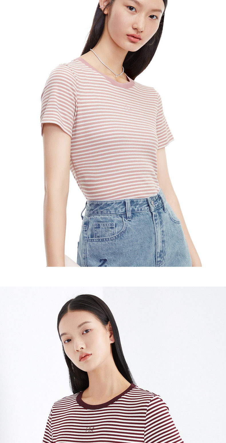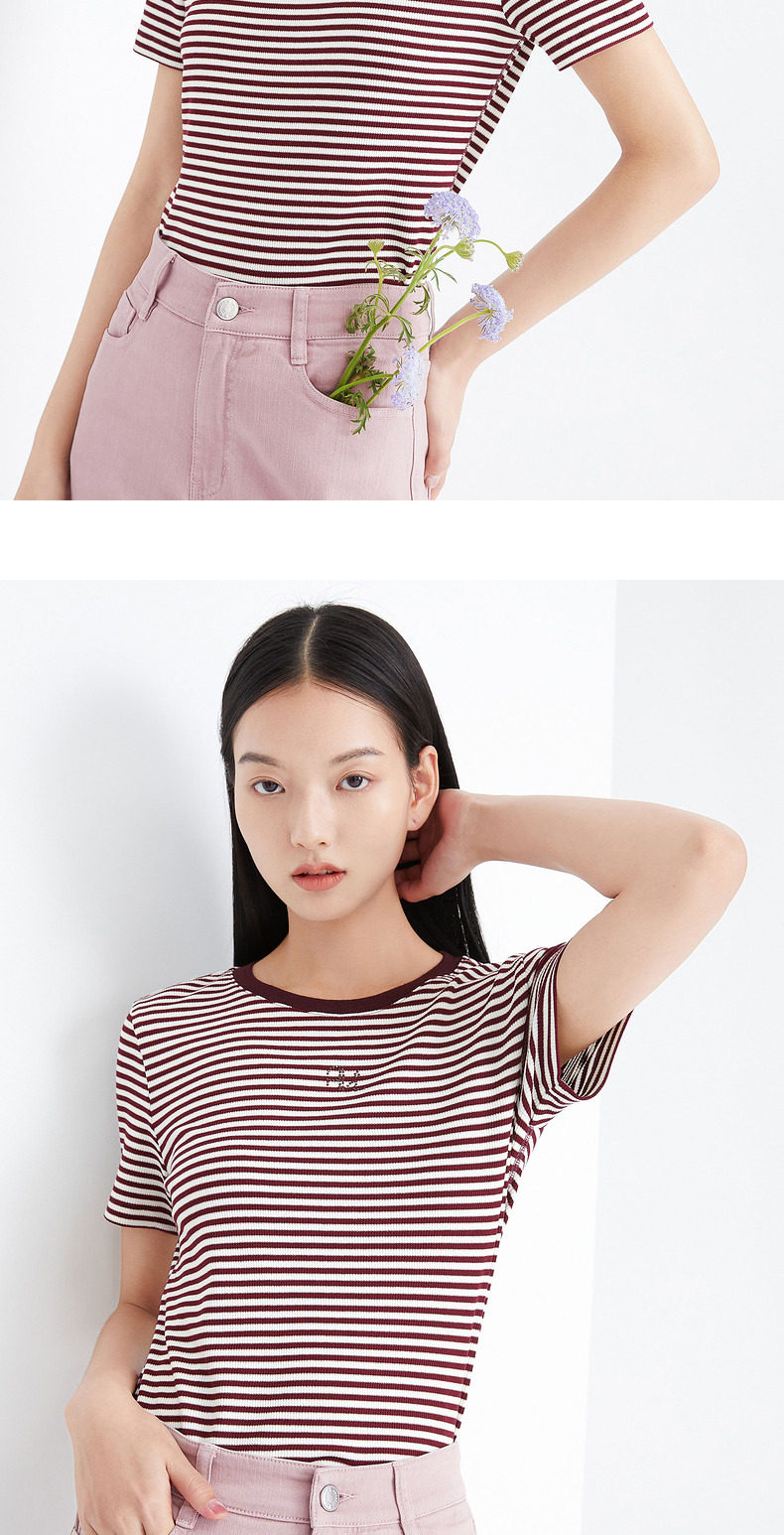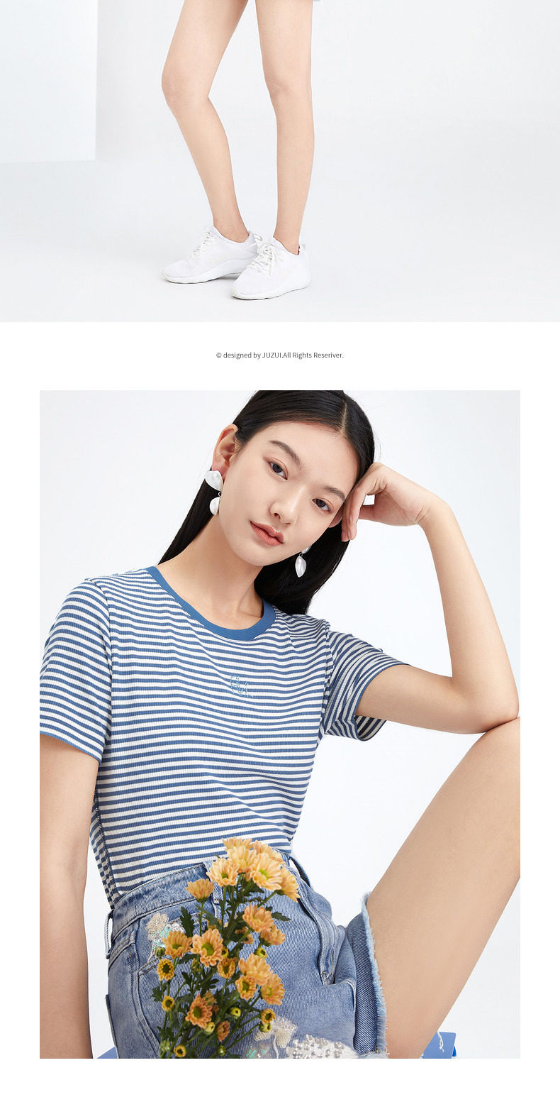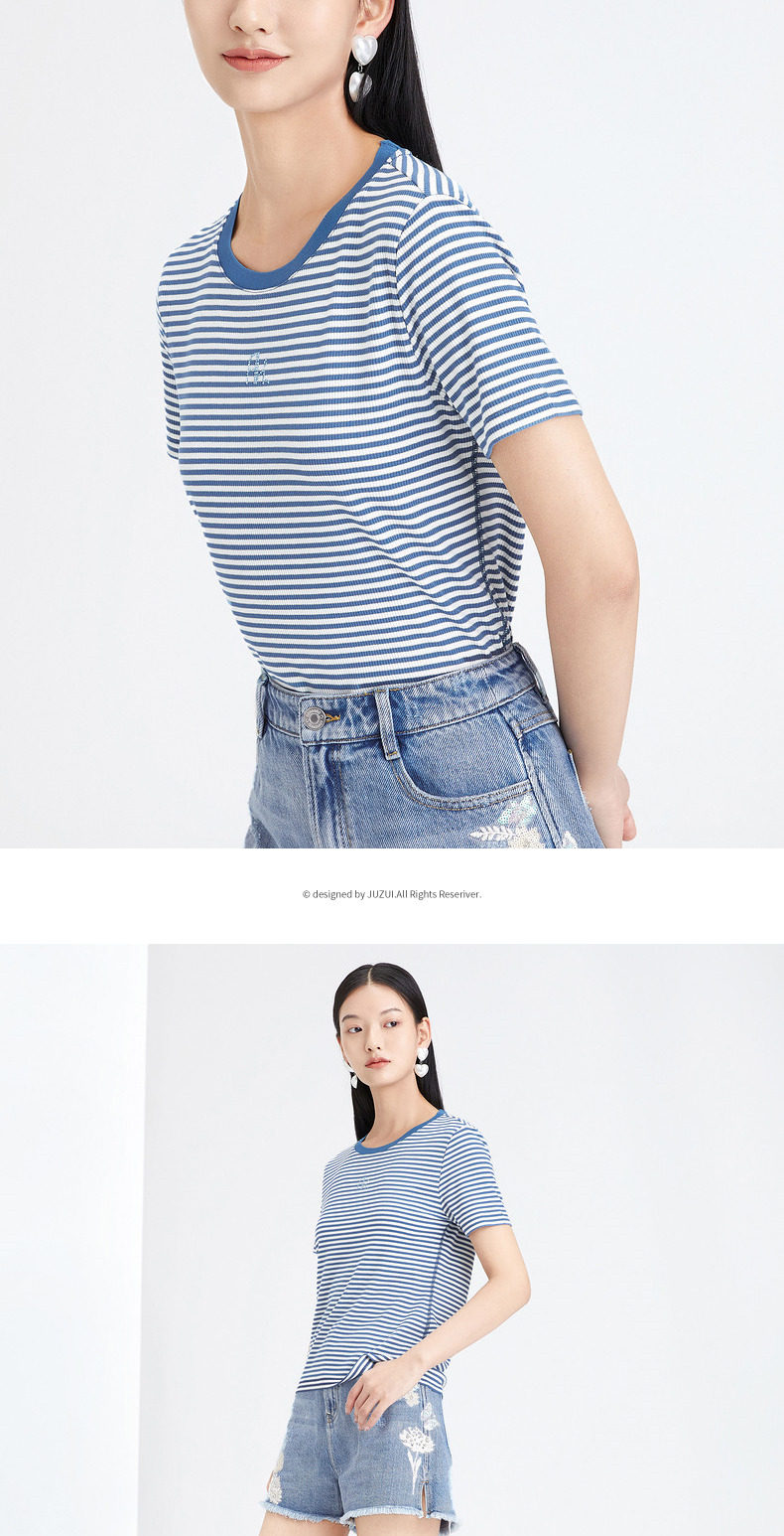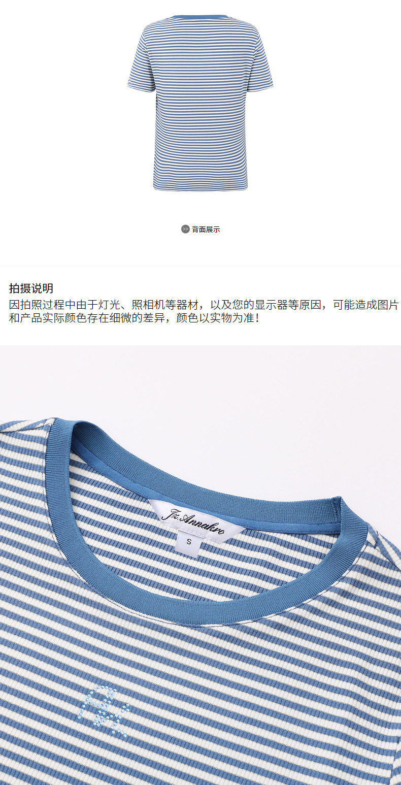首页 > 玖姿专区 > 玖姿服饰 > 玖姿2021夏季新款安娜蔻系列时尚条纹烫钻自然修身女短袖针织T恤