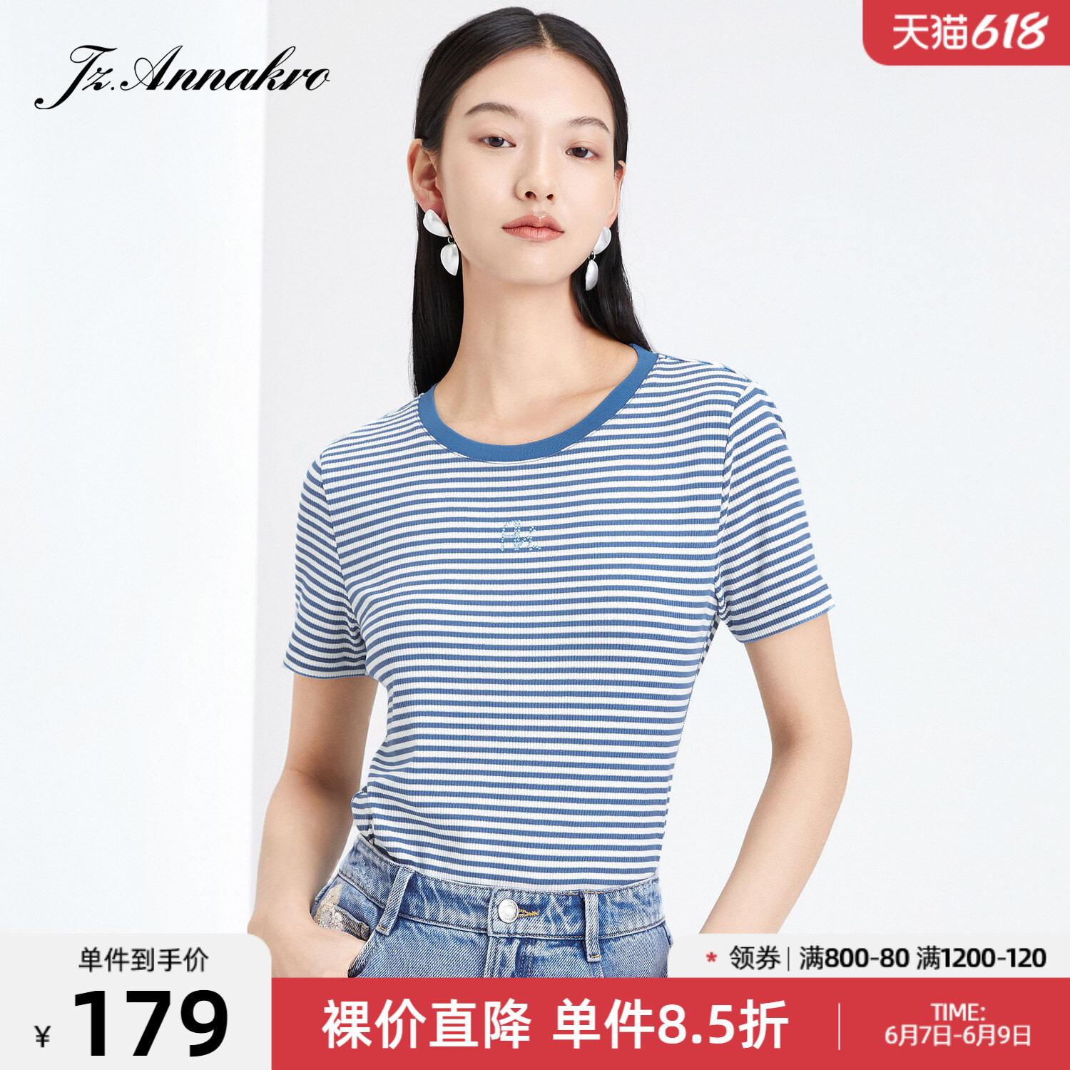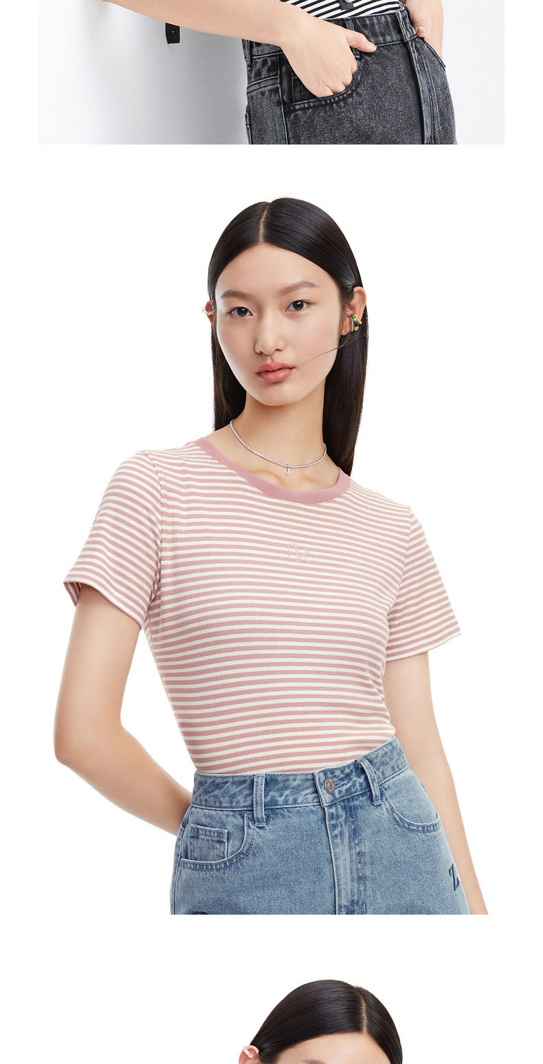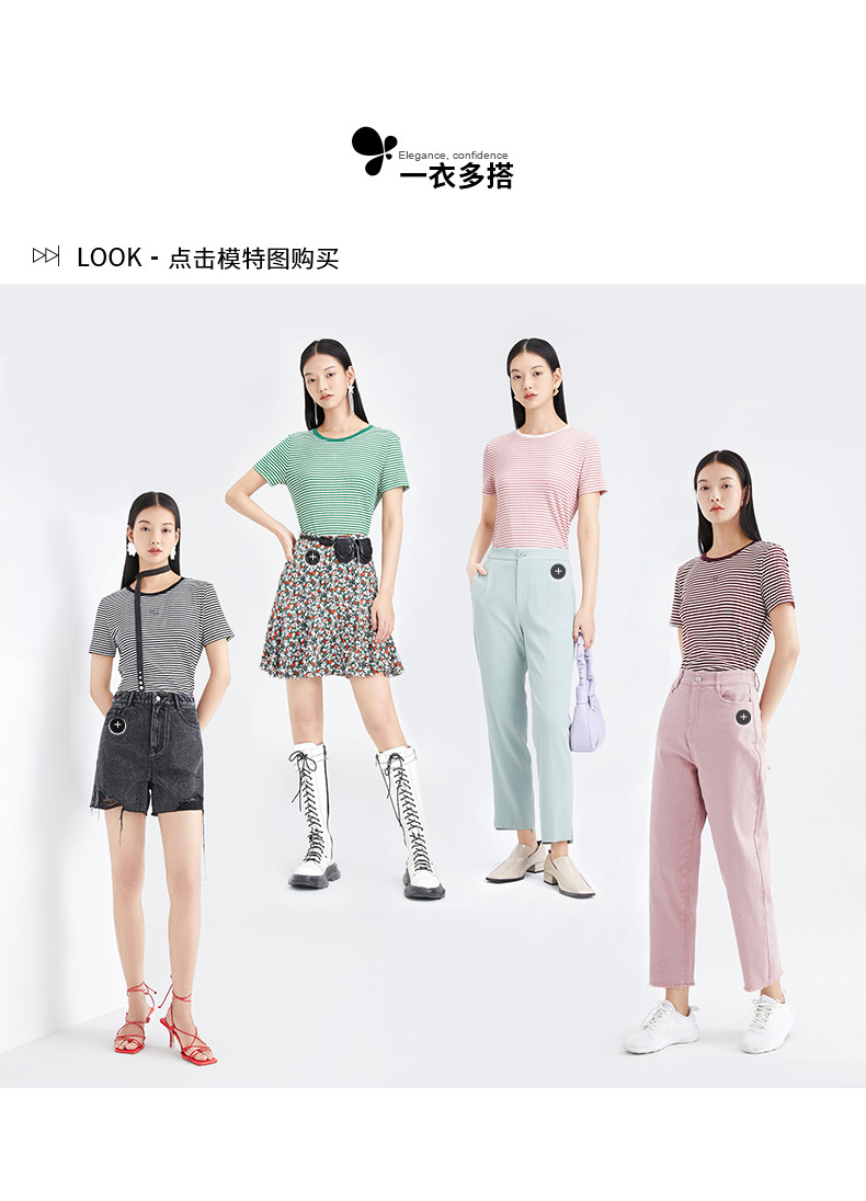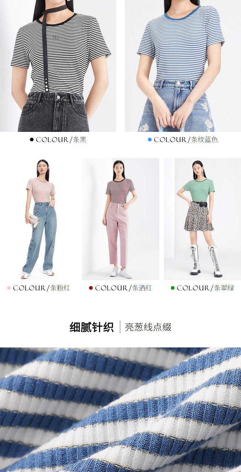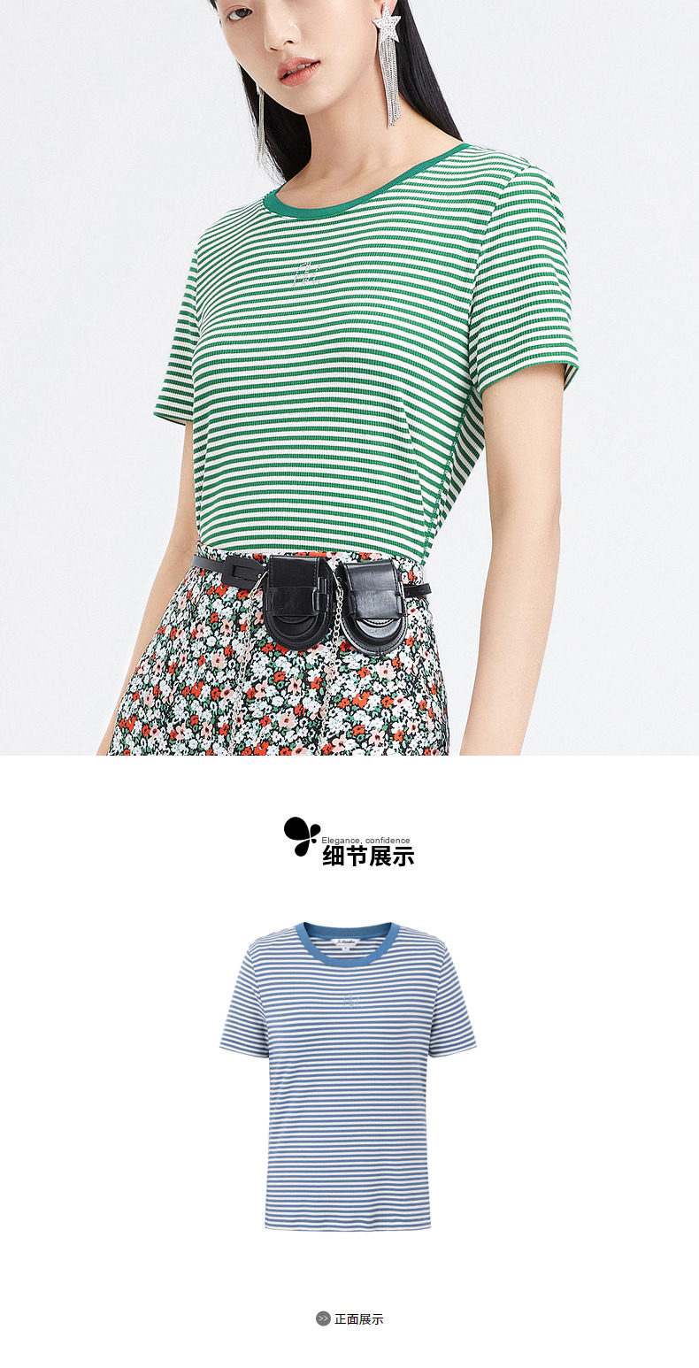 首页 > 玖姿专区 > 玖姿服饰 > 玖姿2021夏季新款安娜蔻系列时尚条纹烫钻自然修身女短袖针织T恤