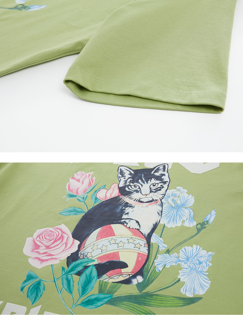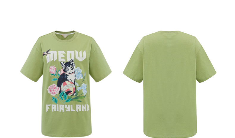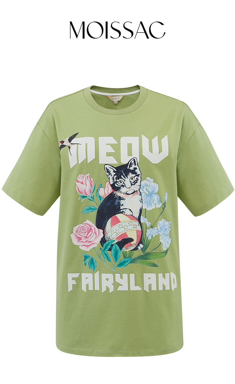 首页 > 玖姿专区 > 玖姿服饰 > MOISSAC/摩萨克2021夏季新款绿色宽松休闲猫咪印花短袖女时尚T恤