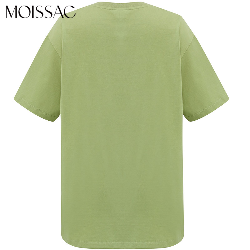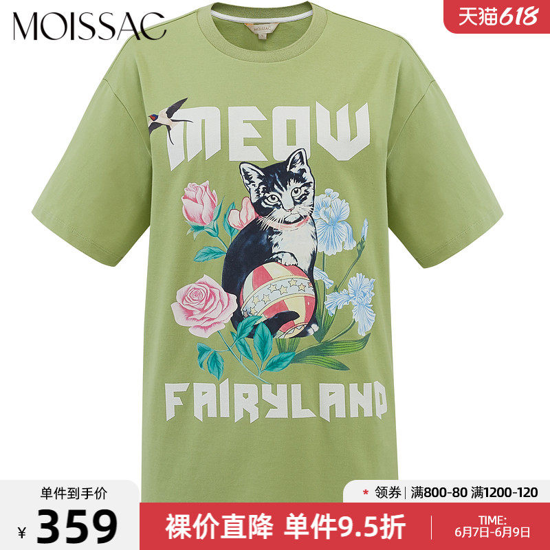 MOISSAC/摩萨克2021夏季新款绿色宽松休闲猫咪印花短袖女时尚T恤