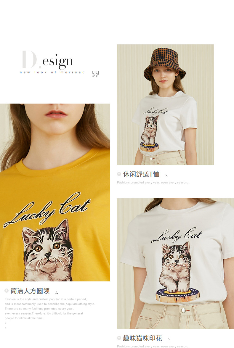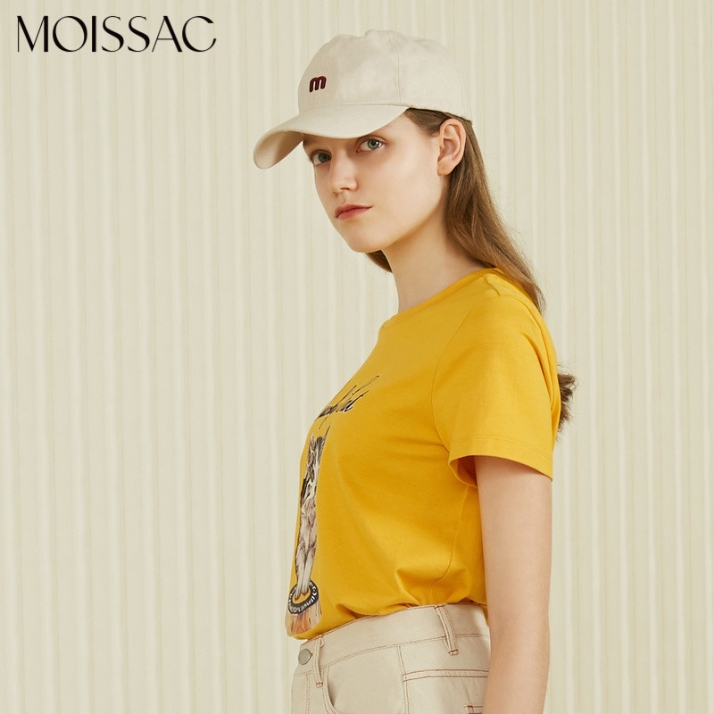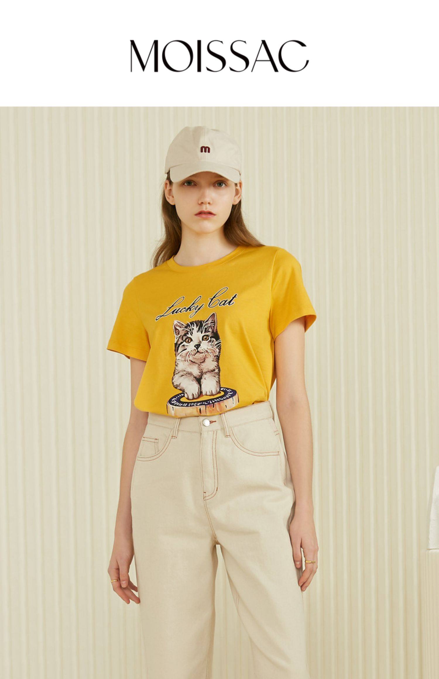 MOISSAC/摩萨克2021夏季新款纯色圆领休闲时尚猫咪印花短袖女T恤