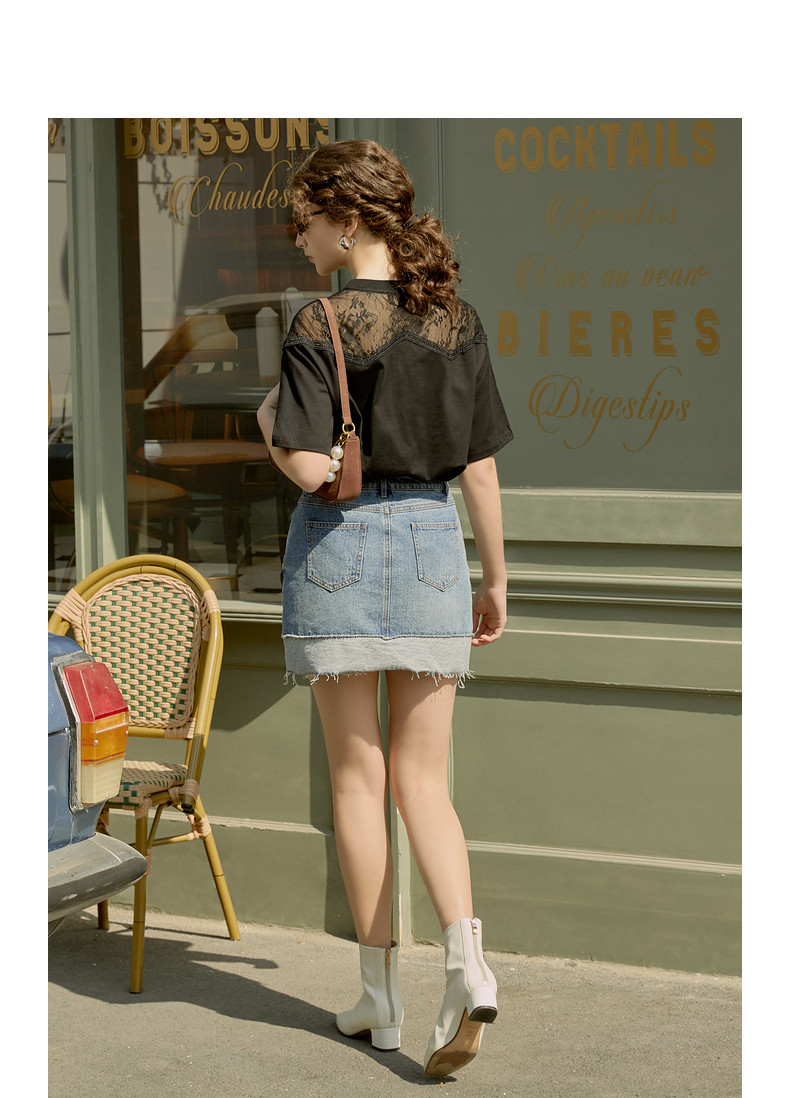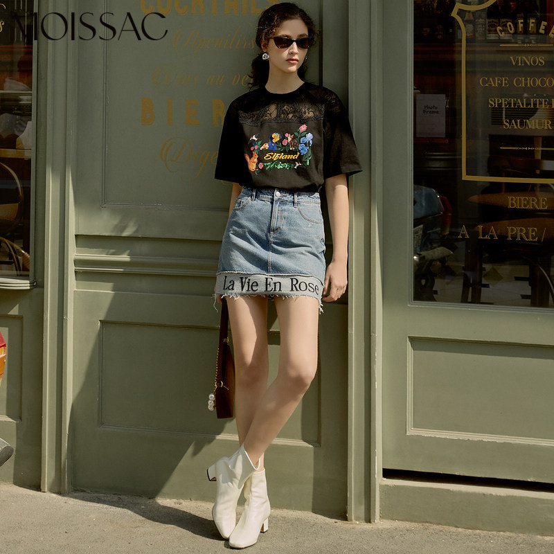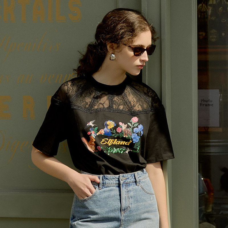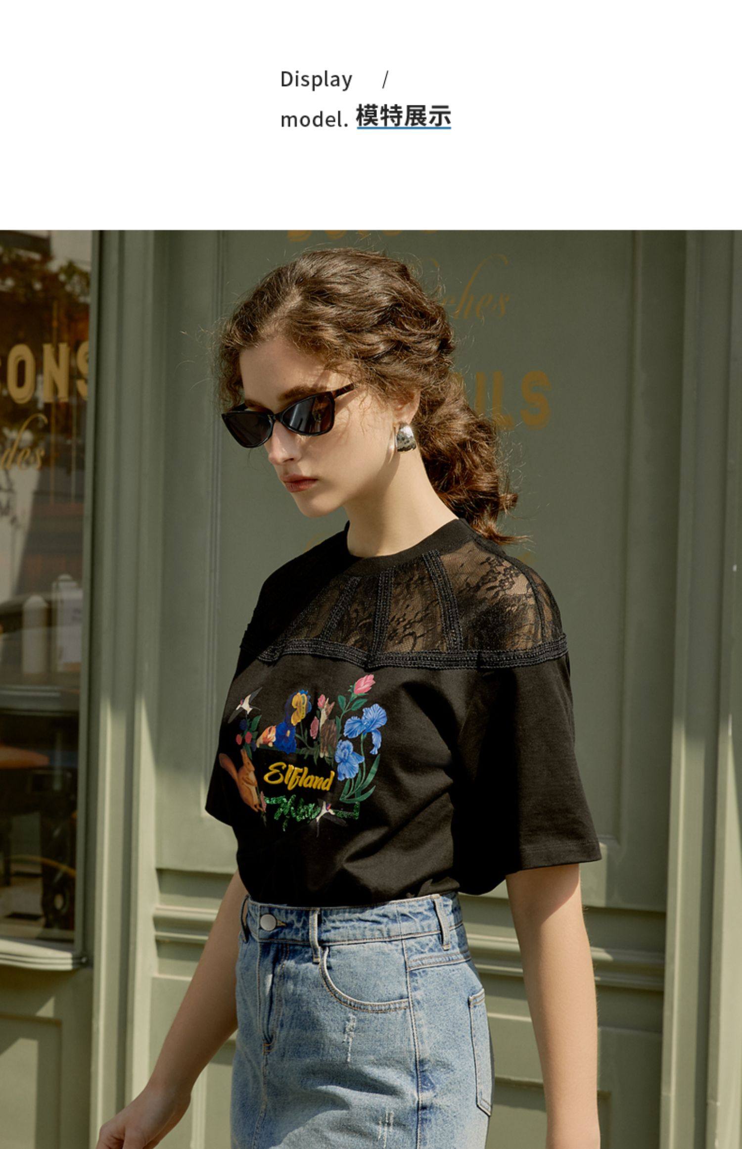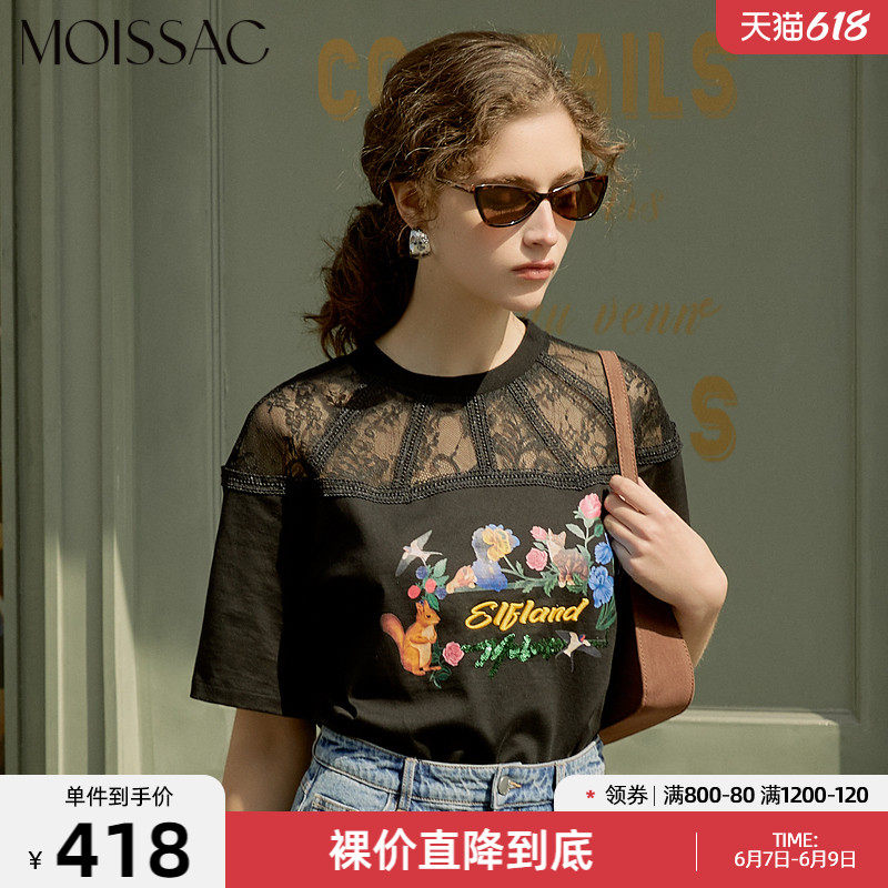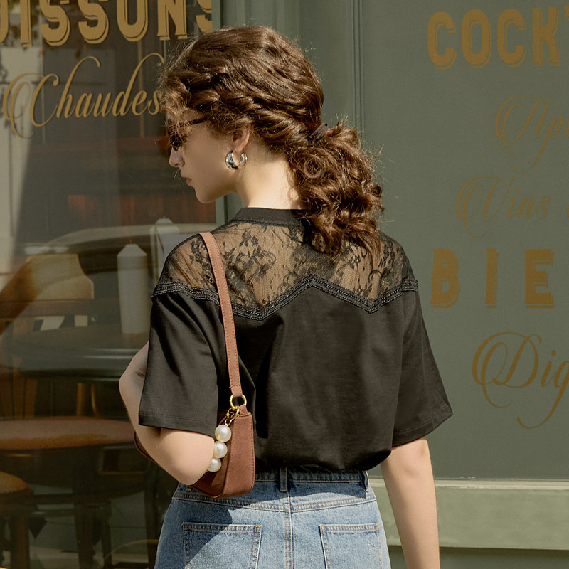 MOISSAC/摩萨克2021夏季新款黑色蕾丝拼接印花女人味女短袖T恤衫