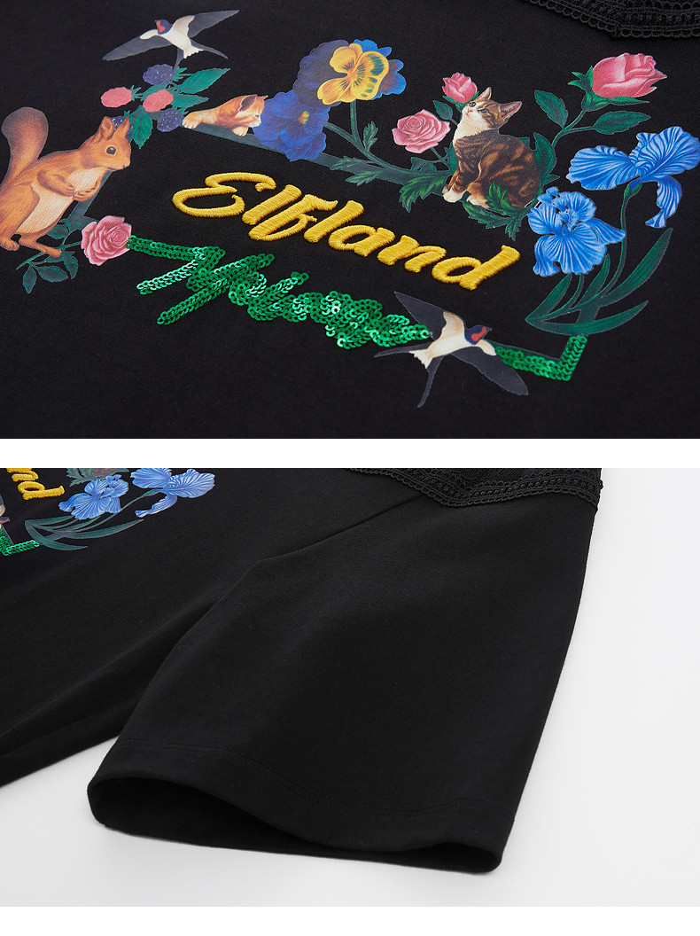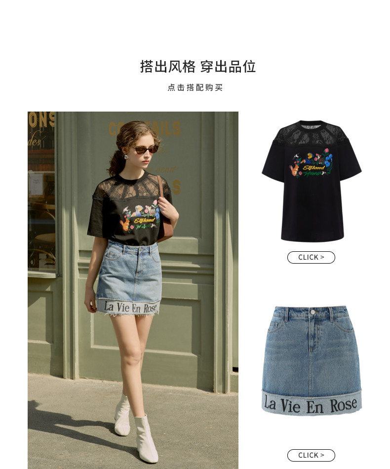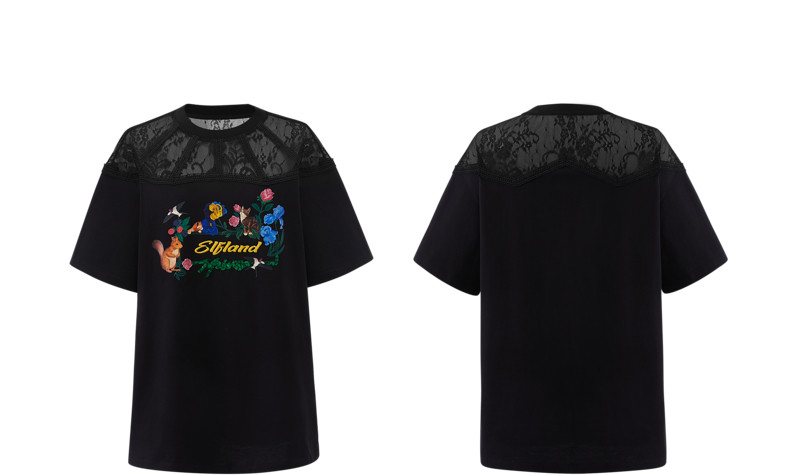 首页 > 玖姿专区 > 玖姿服饰 > MOISSAC/摩萨克2021夏季新款黑色蕾丝拼接印花女人味女短袖T恤衫