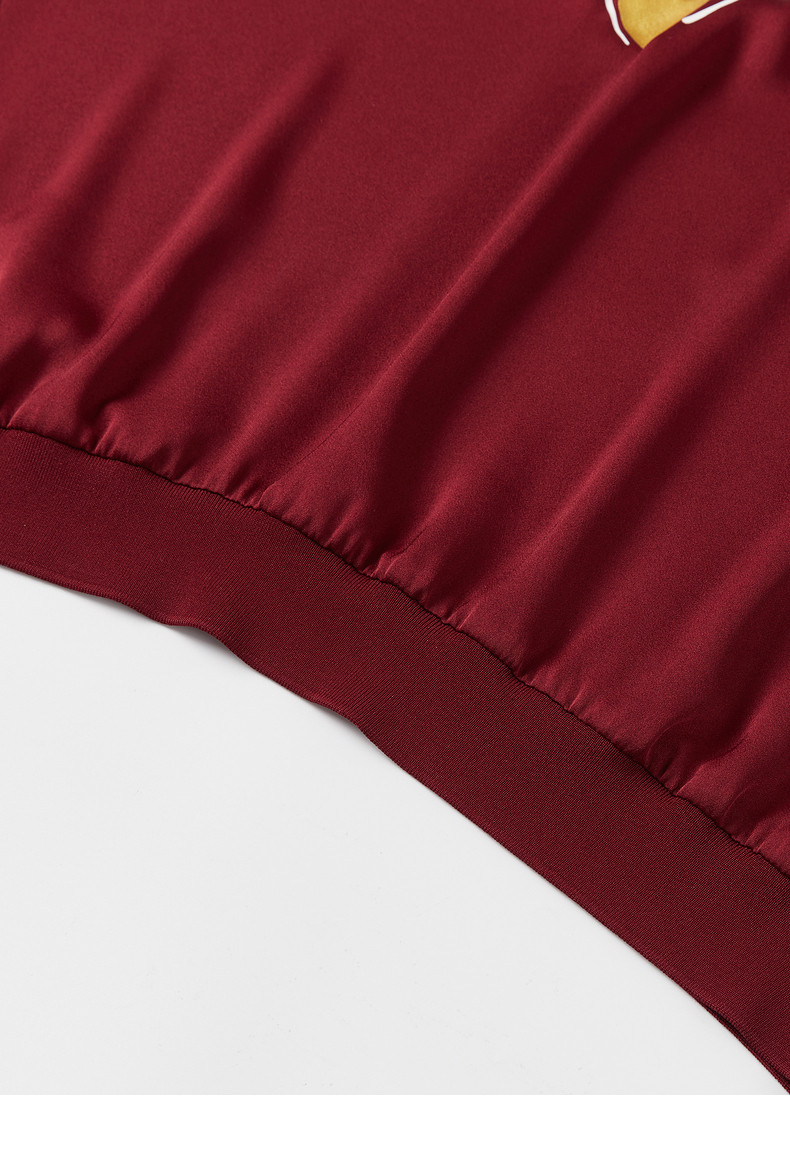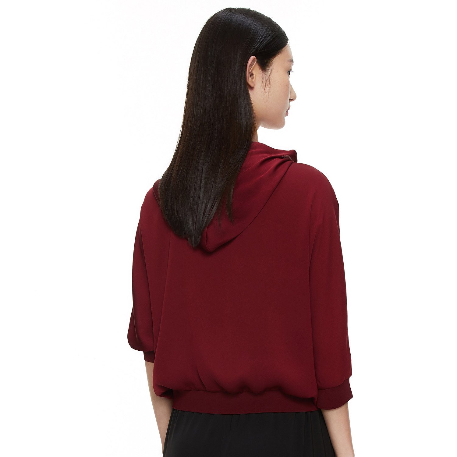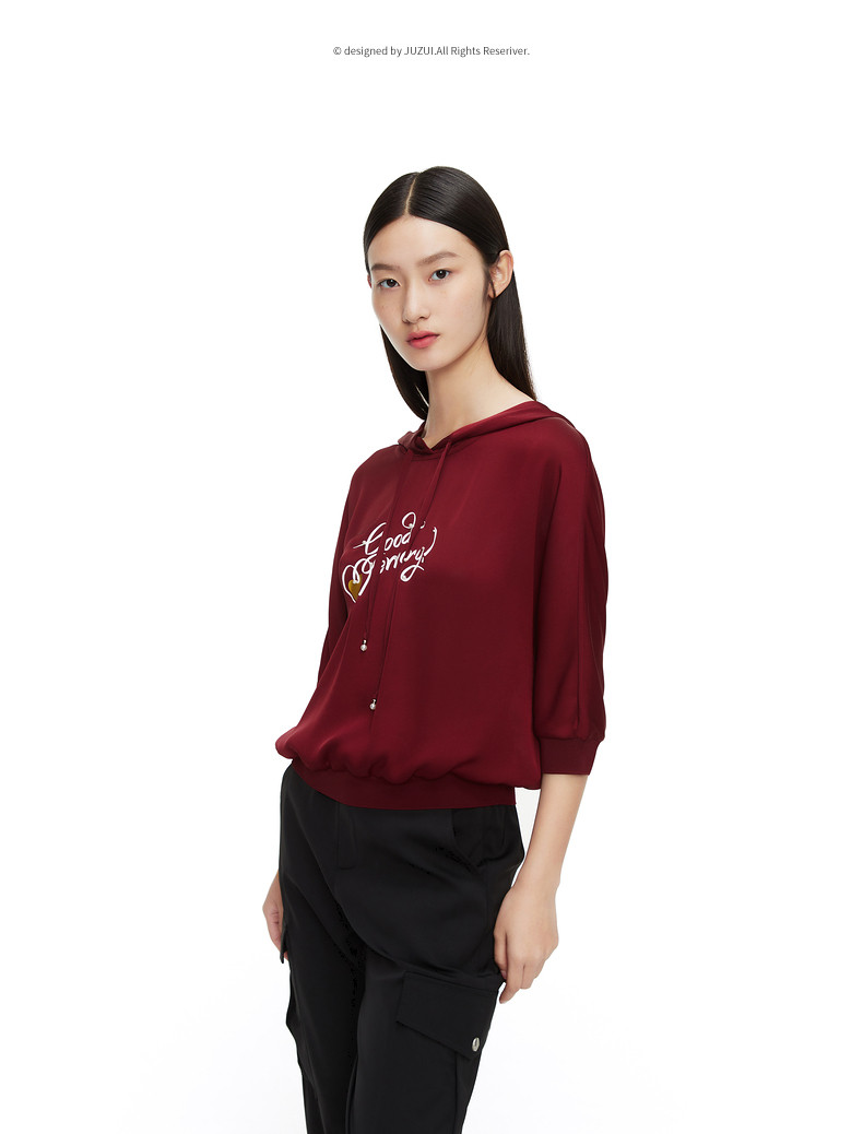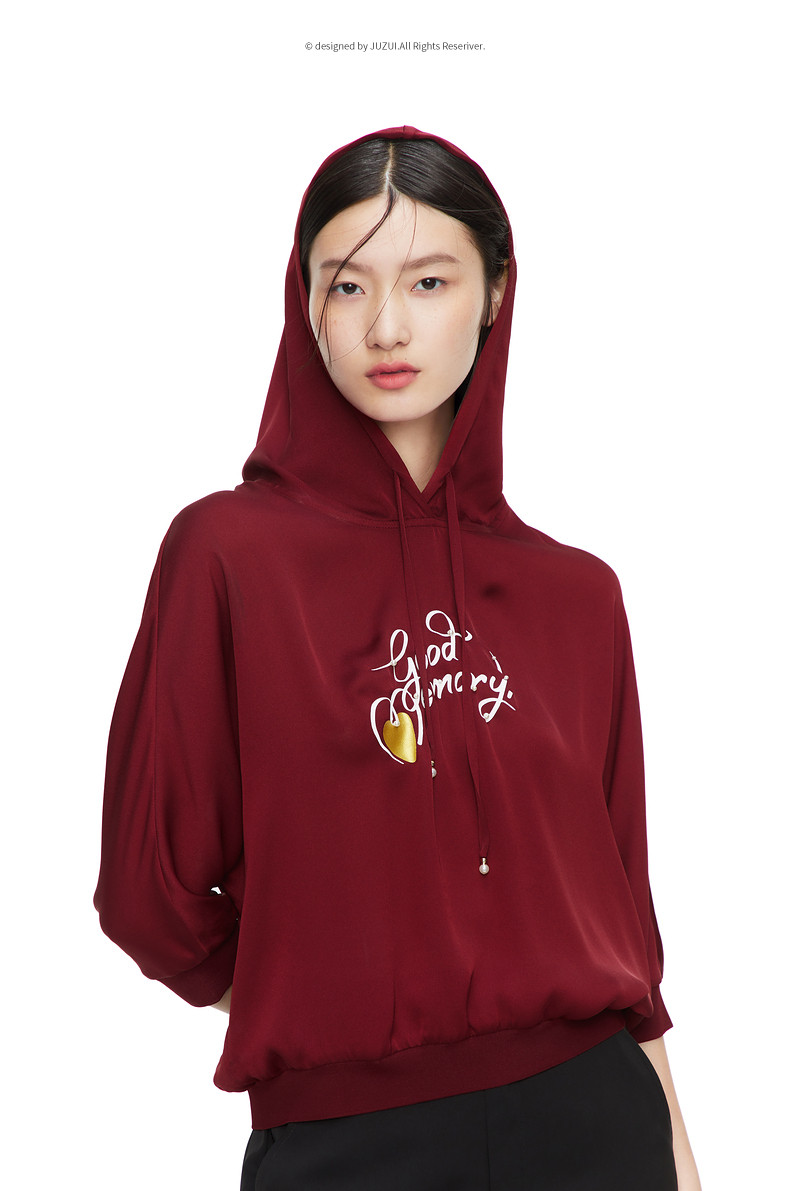 玖姿2021夏季新款安娜蔻系列酒红色休闲连帽印花休闲女轻盈雪纺衫