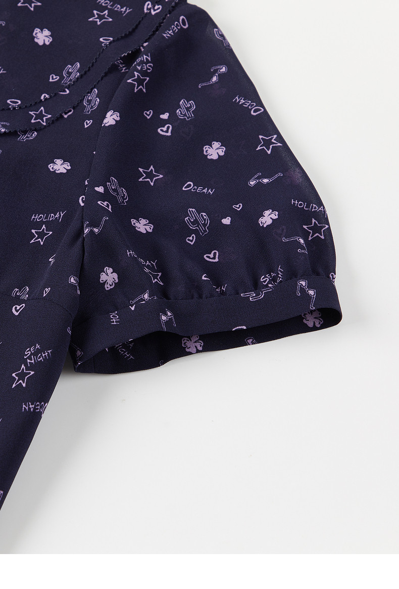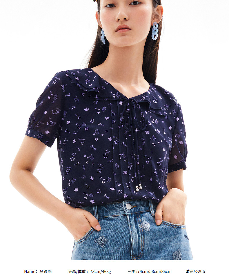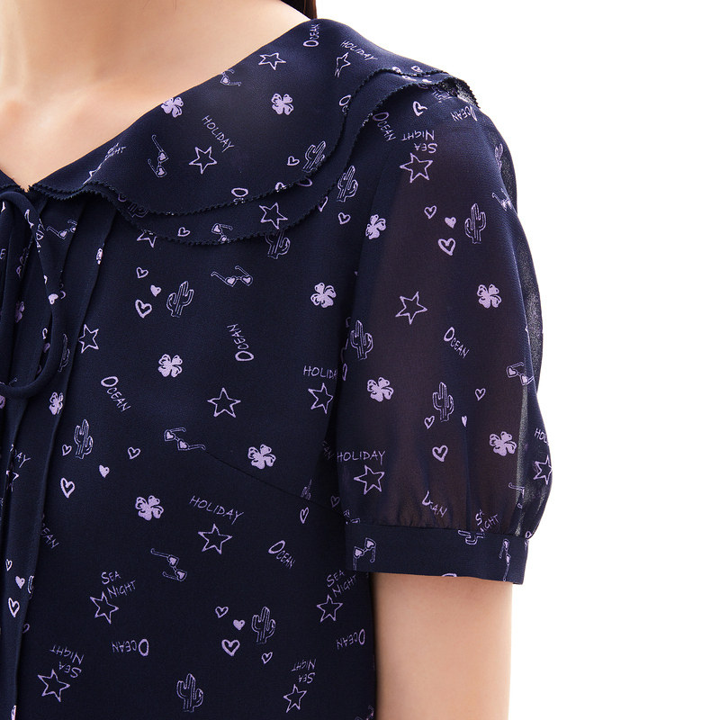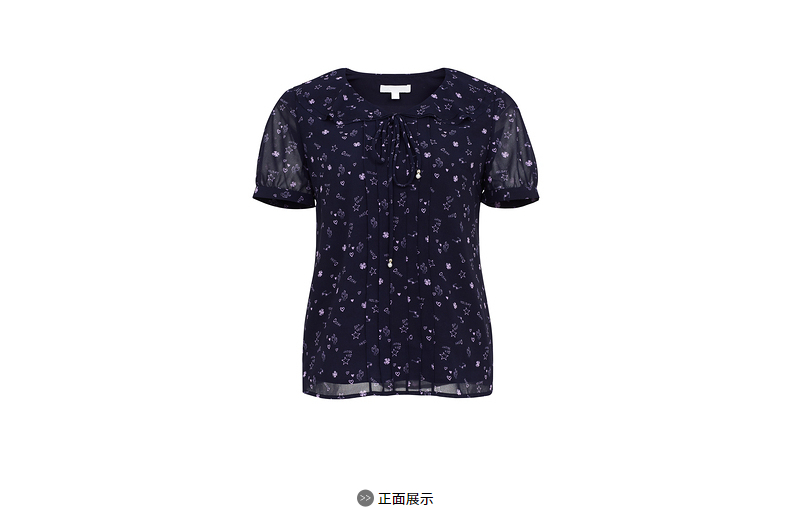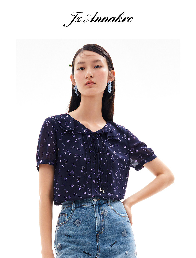首页 > 玖姿专区 > 玖姿服饰 > 玖姿2021夏季新款安娜蔻系列系带荷叶领印花休闲时尚女短袖雪纺衫