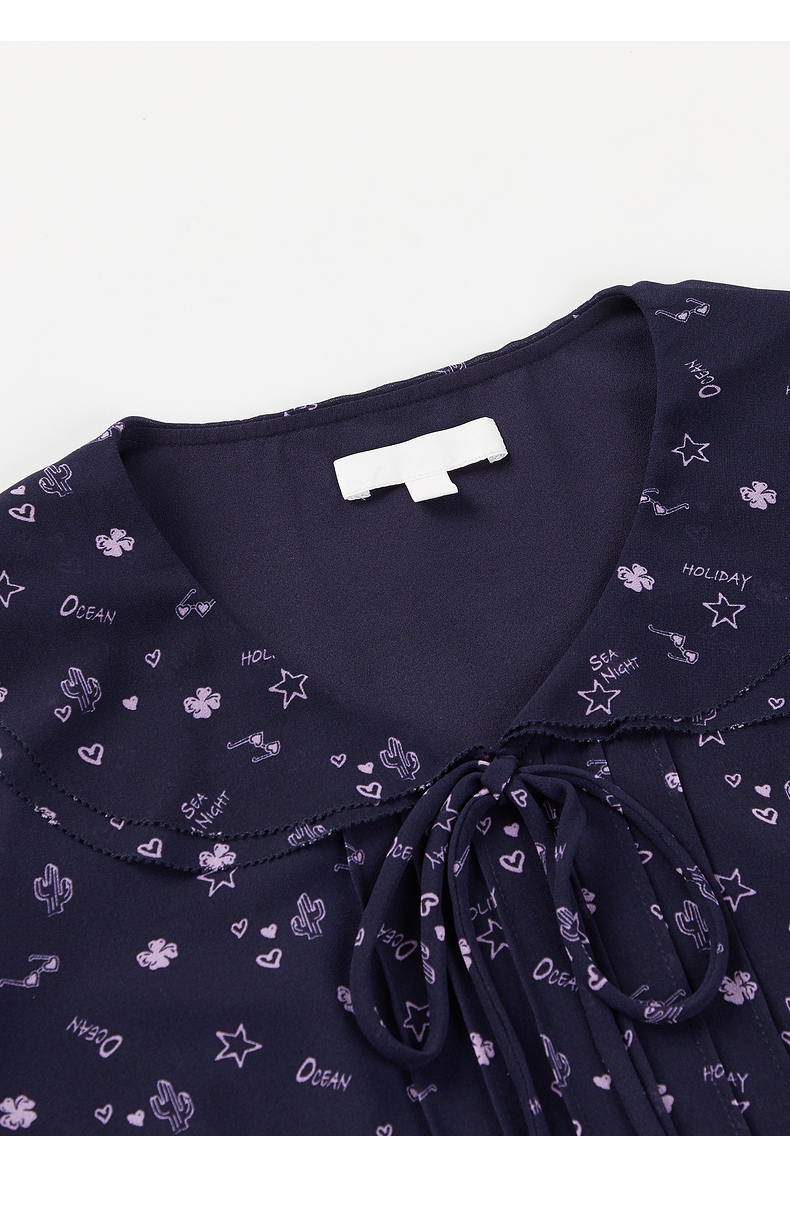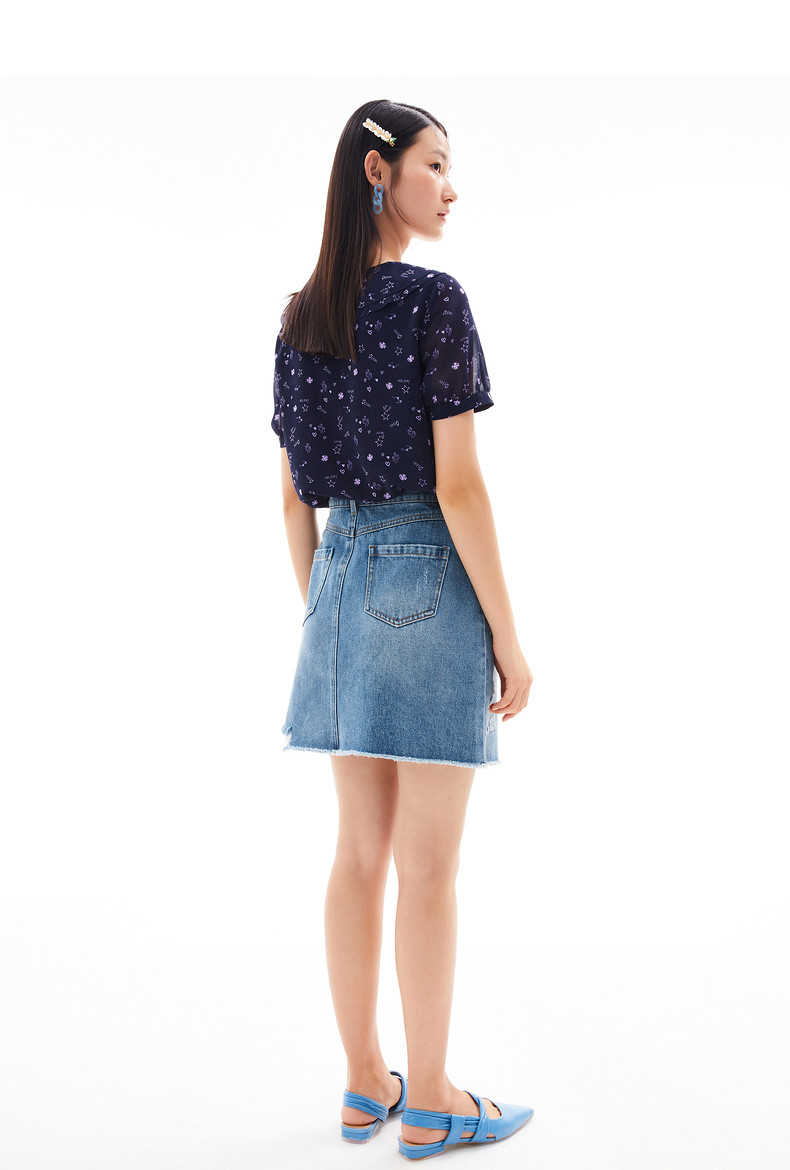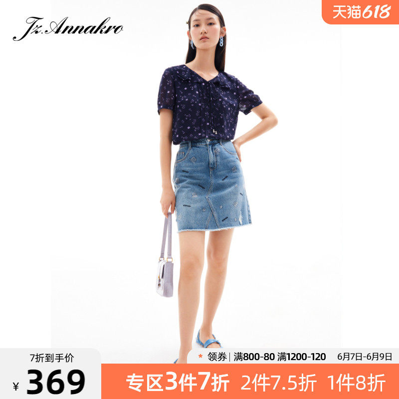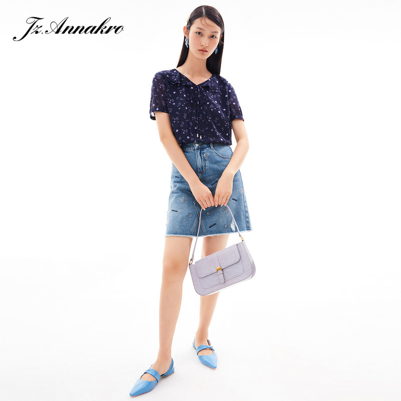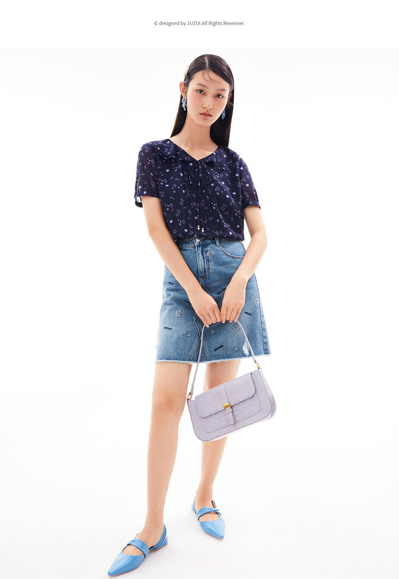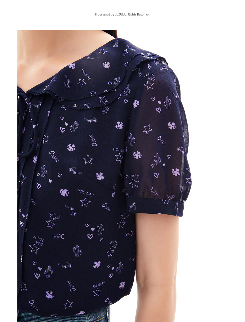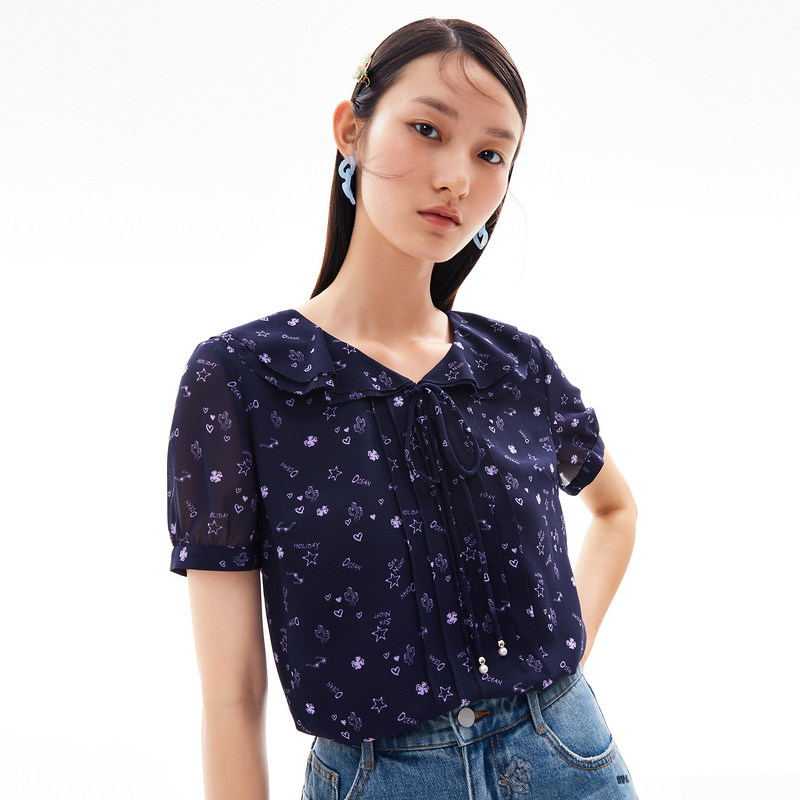玖姿2021夏季新款安娜蔻系列系带荷叶领印花休闲时尚女短袖雪纺衫
