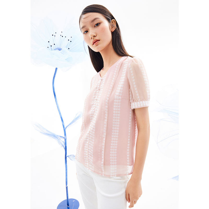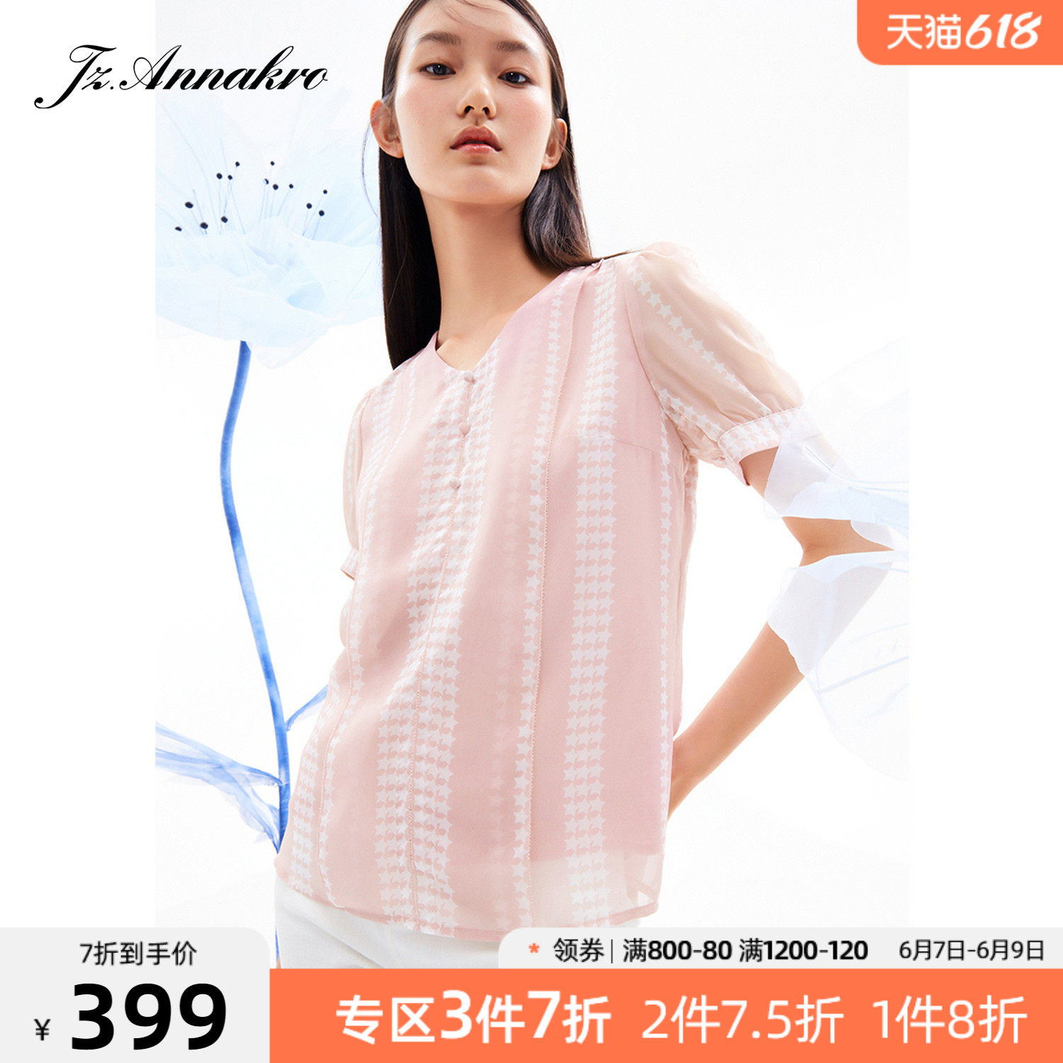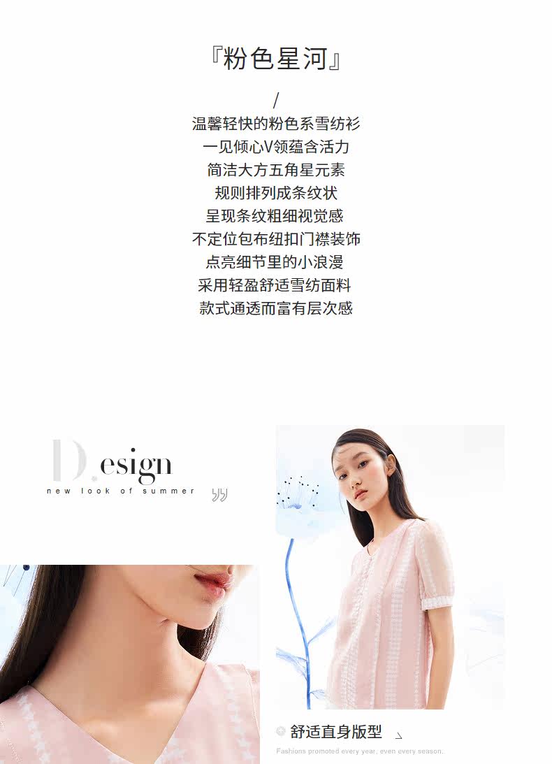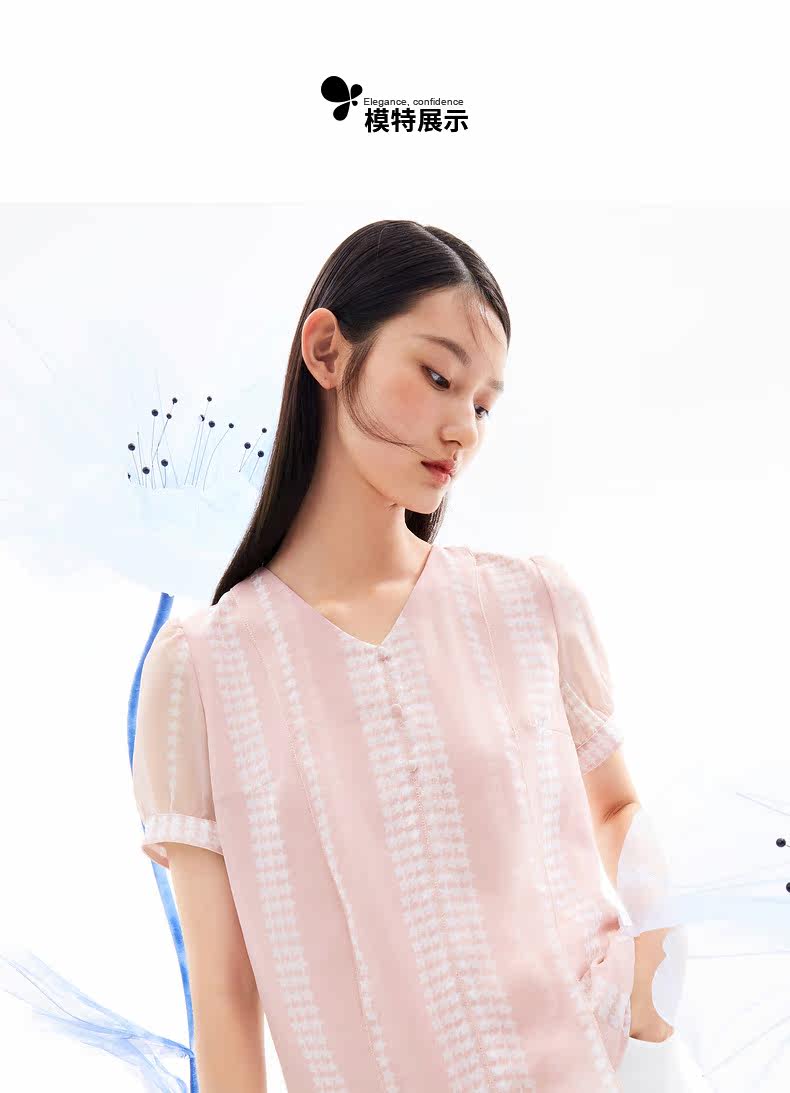 首页 > 玖姿专区 > 玖姿服饰 > 玖姿2021夏季新款安娜蔻系列甜美粉色V领短袖星星印花女雪纺衫