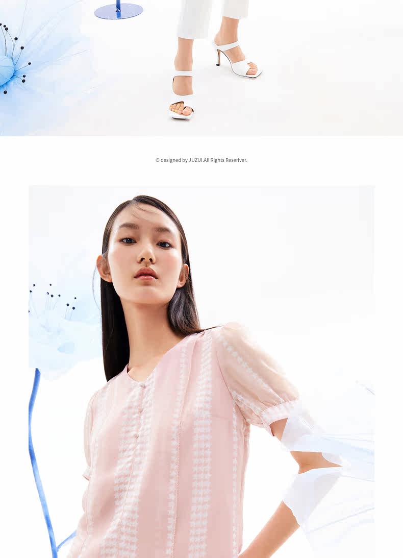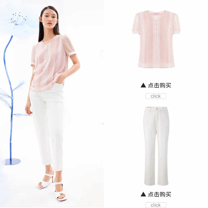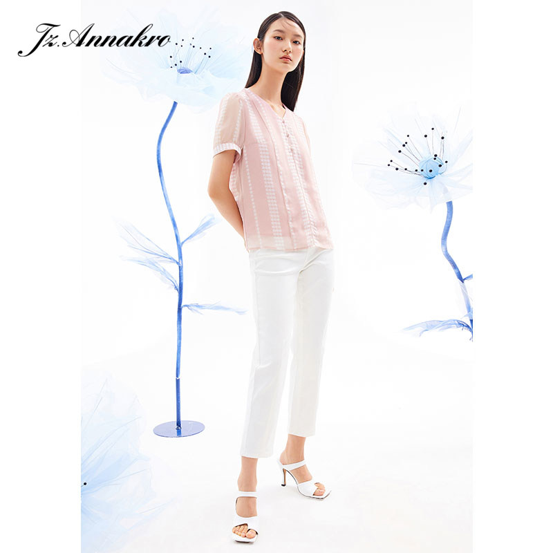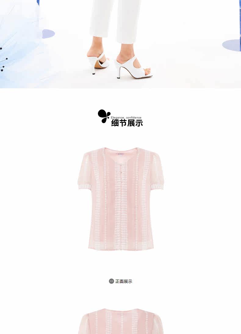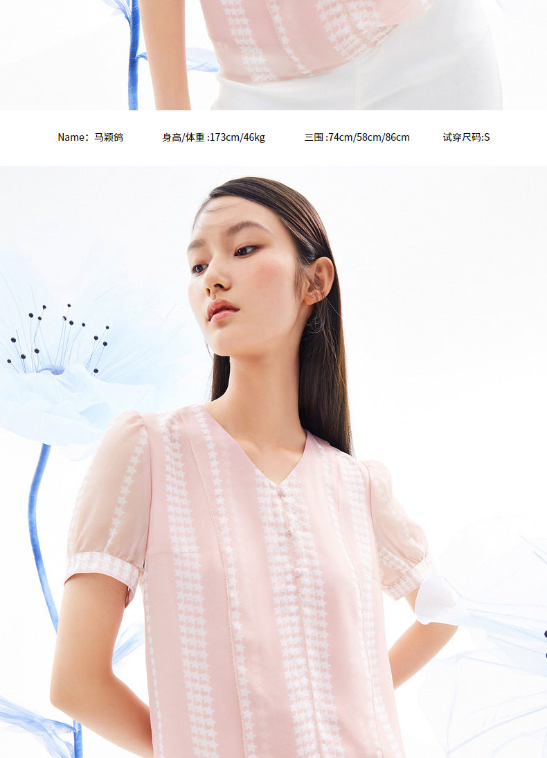 首页 > 玖姿专区 > 玖姿服饰 > 玖姿2021夏季新款安娜蔻系列甜美粉色V领短袖星星印花女雪纺衫