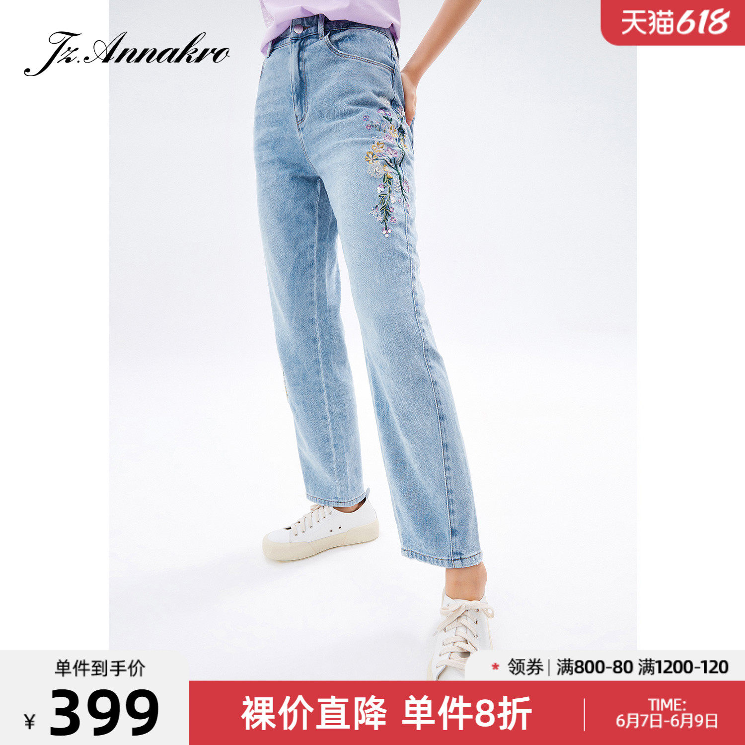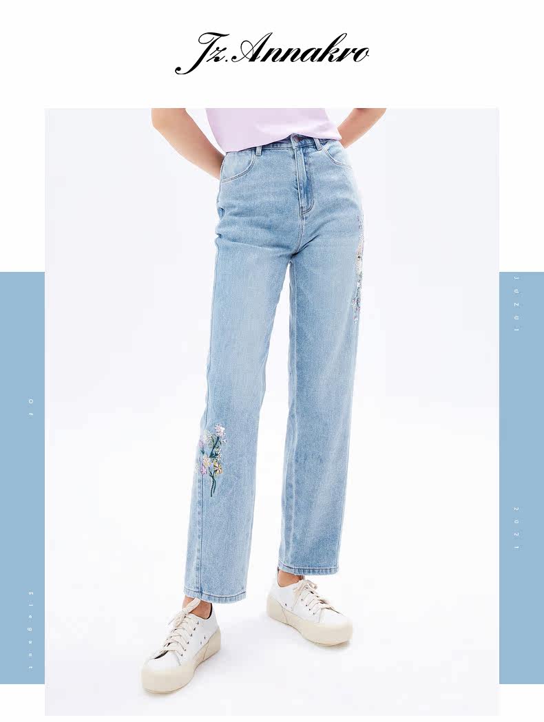 玖姿2021夏季新款安娜蔻系列蓝色水洗休闲显瘦花卉刺绣女牛仔裤