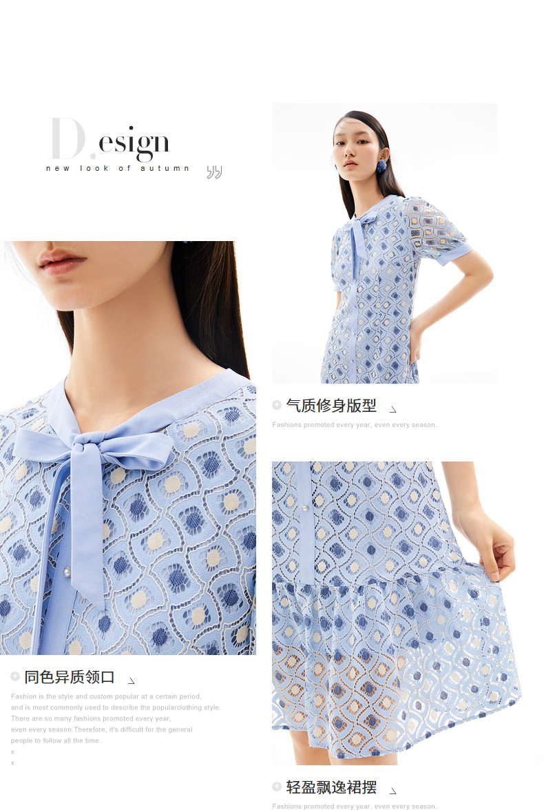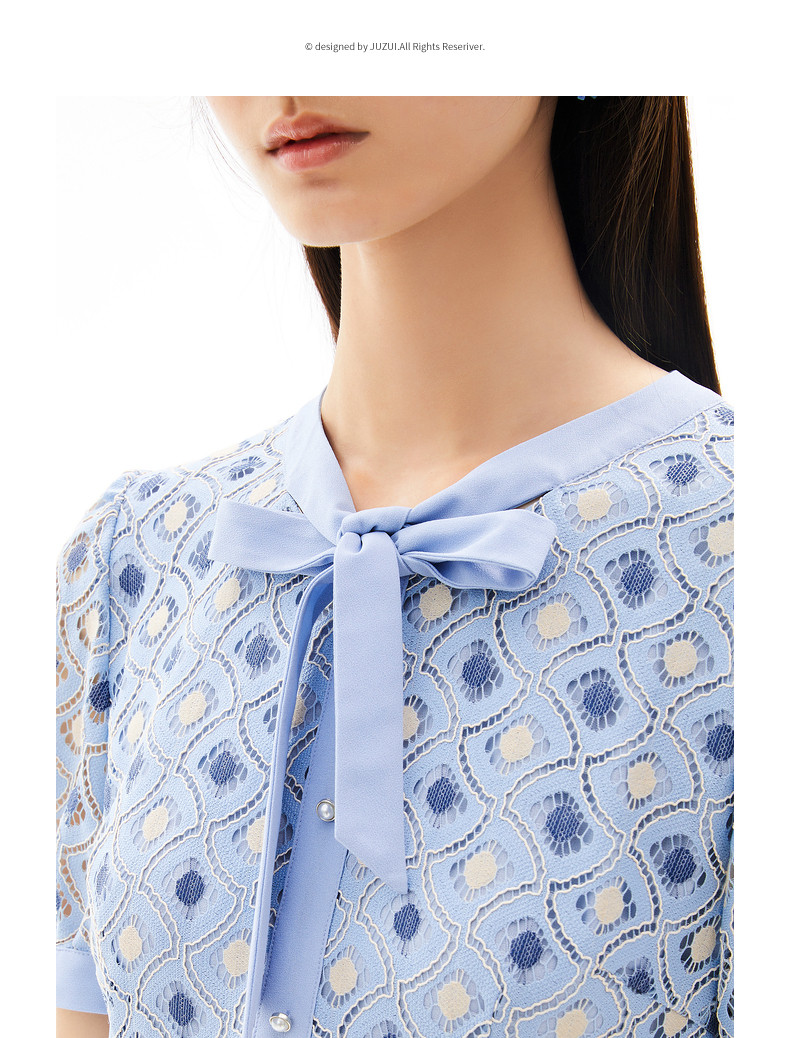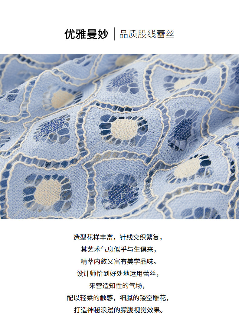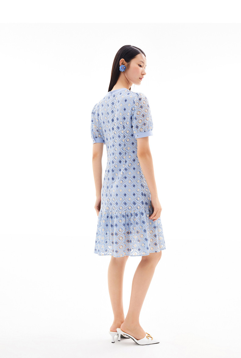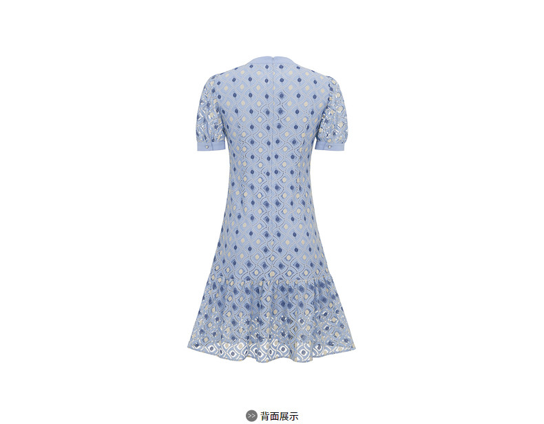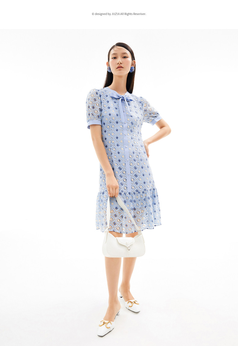 玖姿2021夏季新款安娜蔻系列蓝色蕾丝格纹甜美拼接女短袖连衣裙