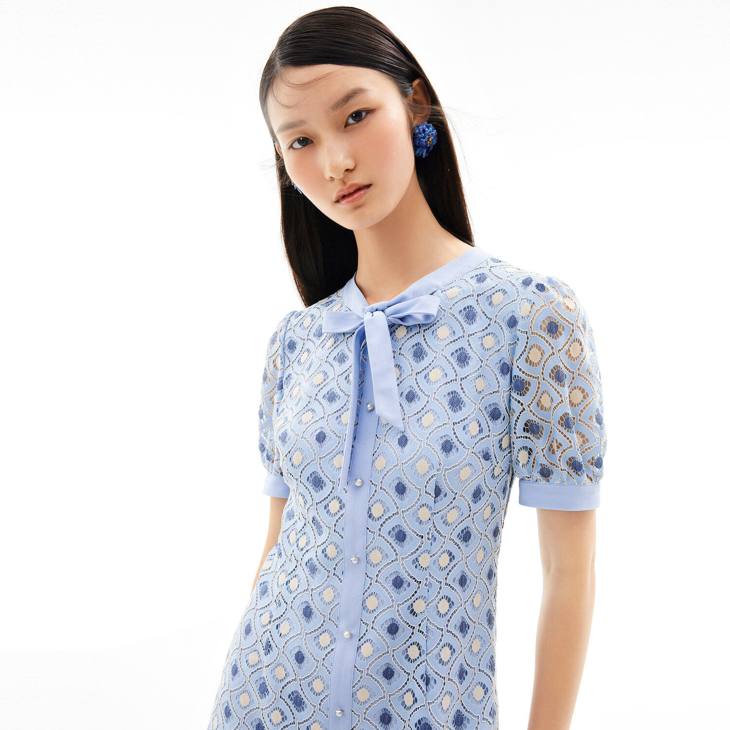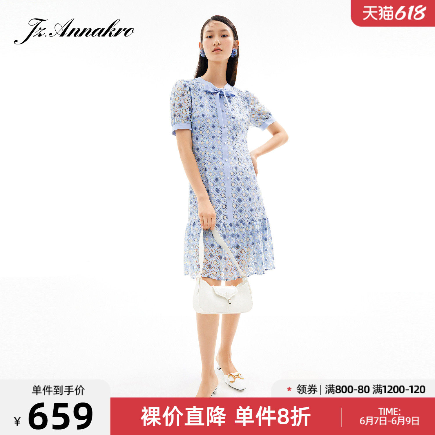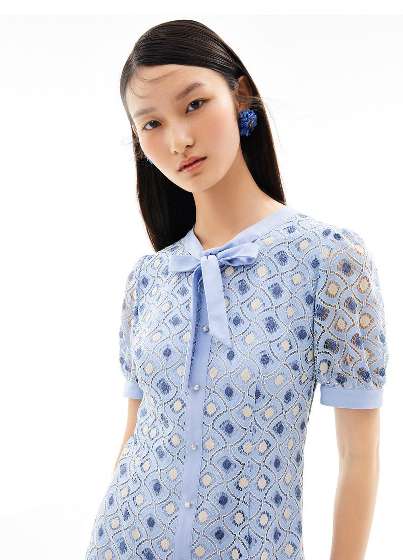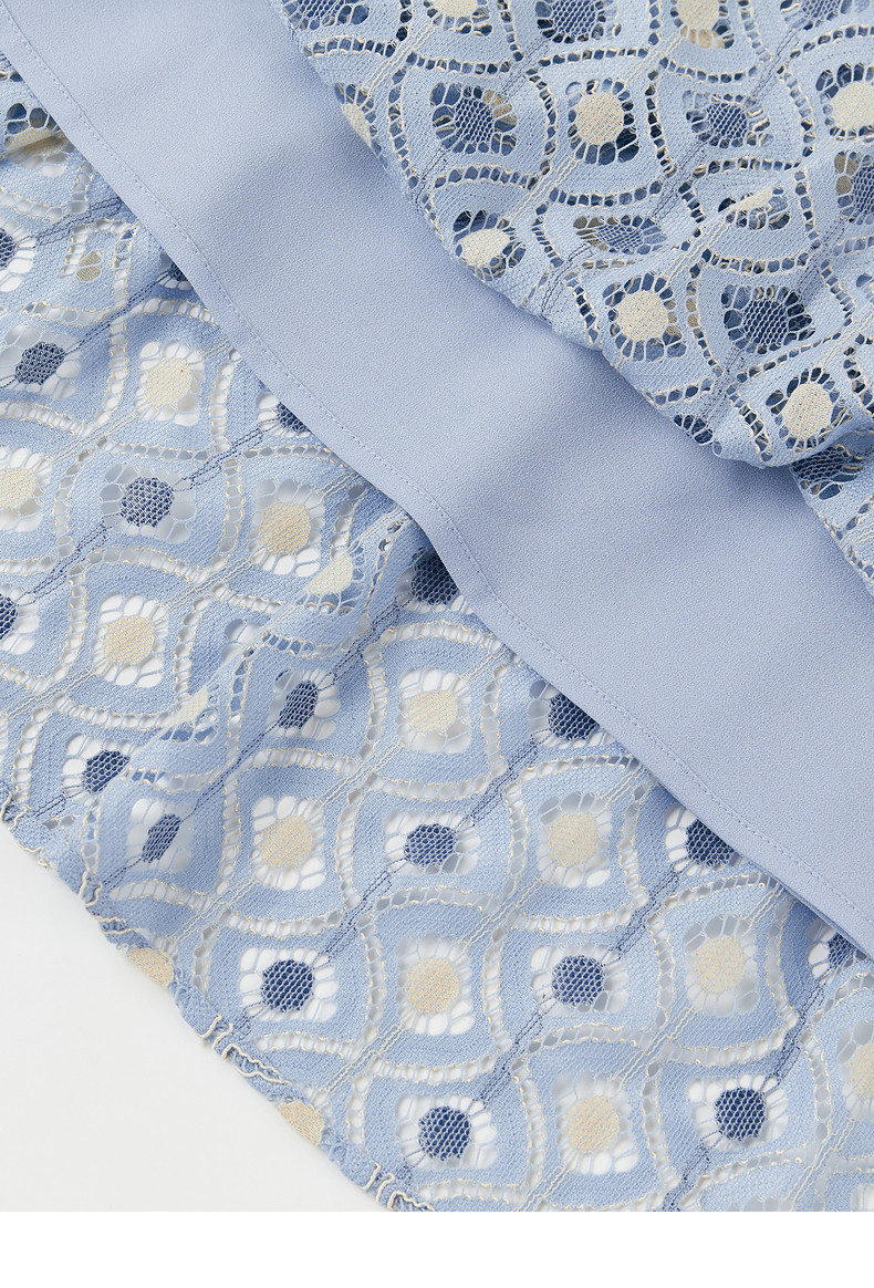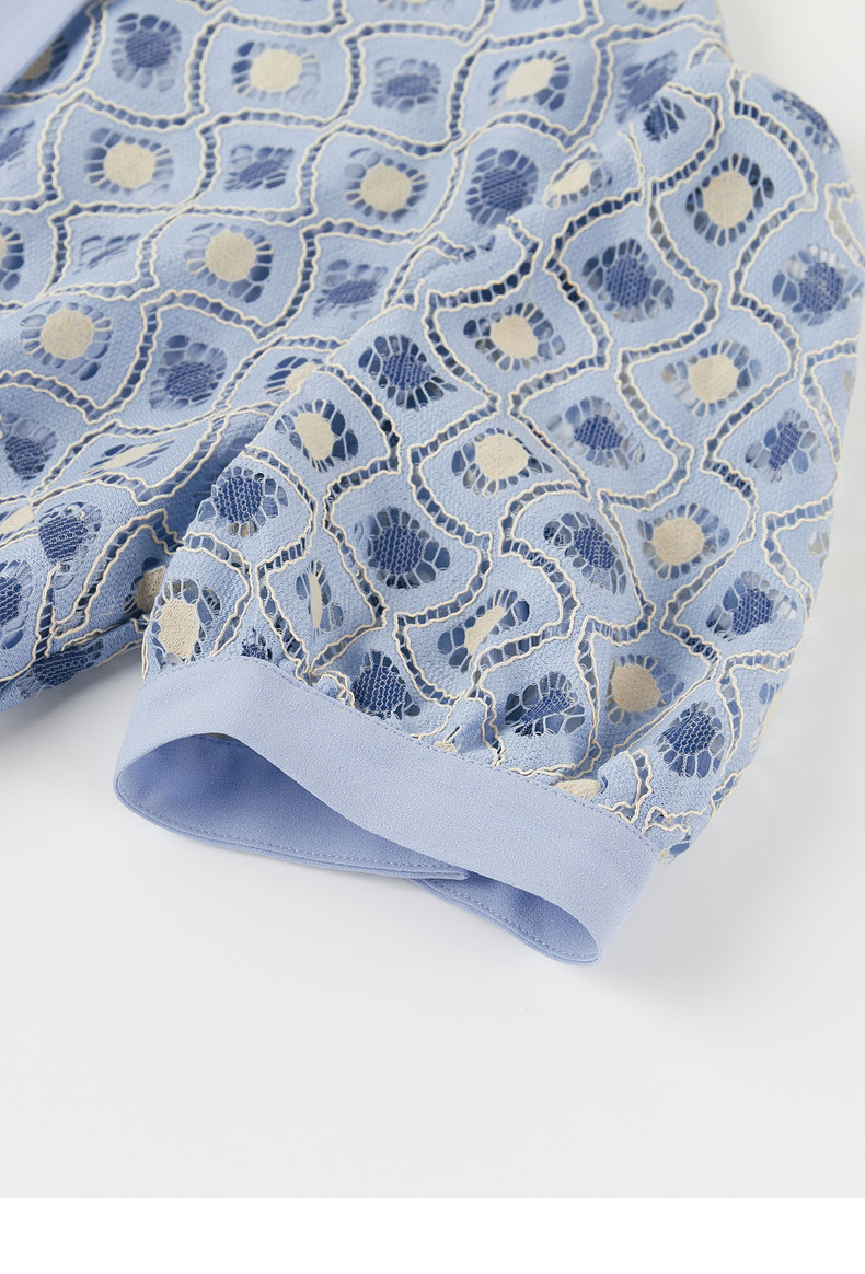 玖姿2021夏季新款安娜蔻系列蓝色蕾丝格纹甜美拼接女短袖连衣裙