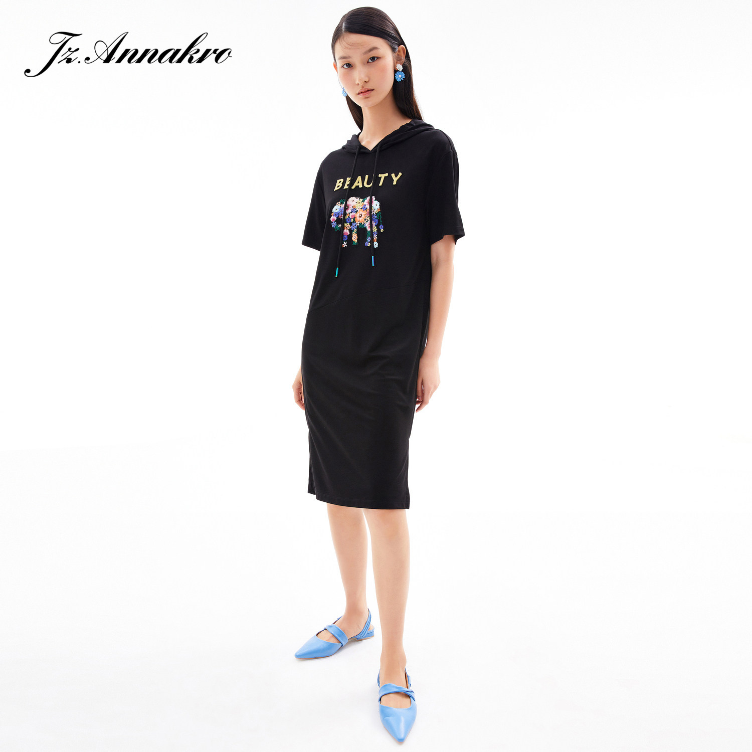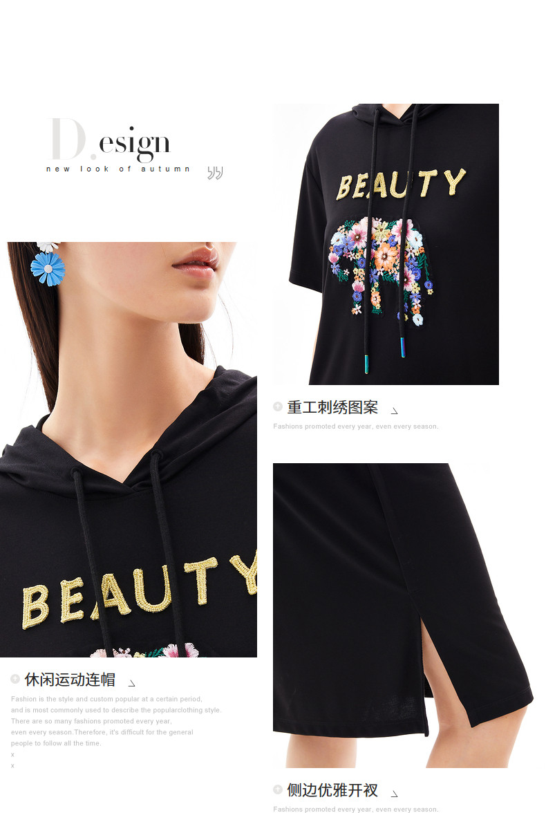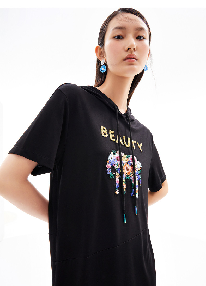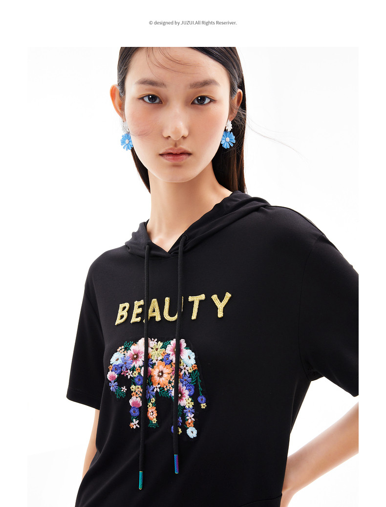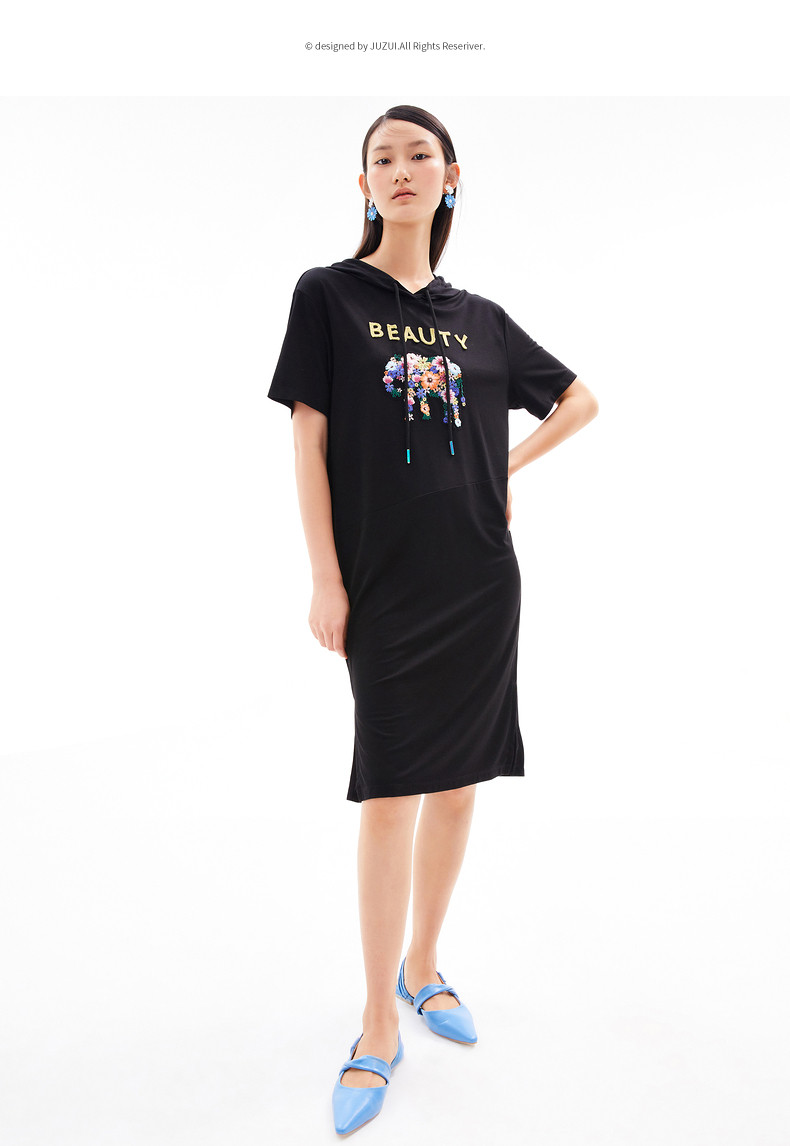 首页 > 玖姿专区 > 玖姿服饰 > 玖姿2021夏季新款安娜蔻系列黑色连帽重工刺绣趣味女直身连衣裙
