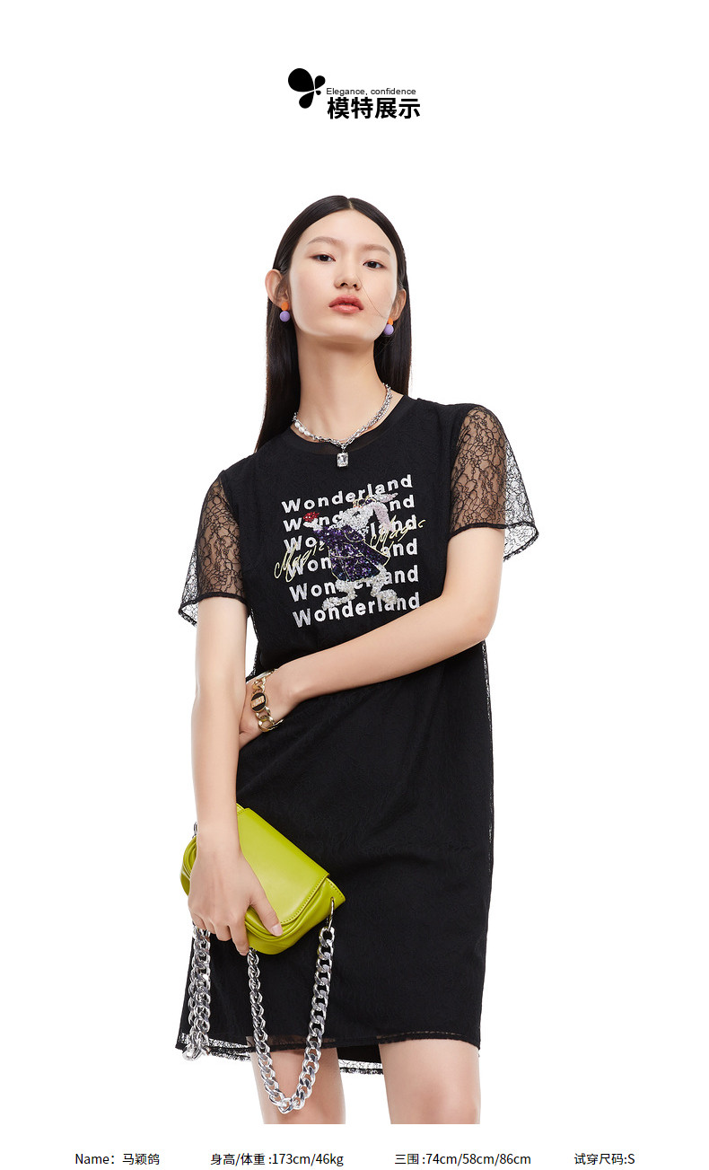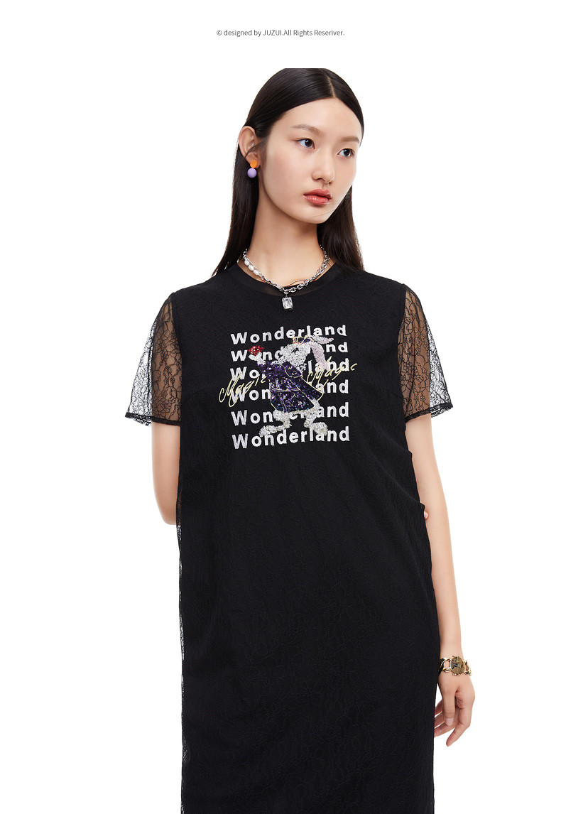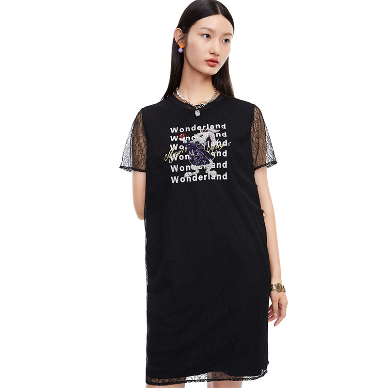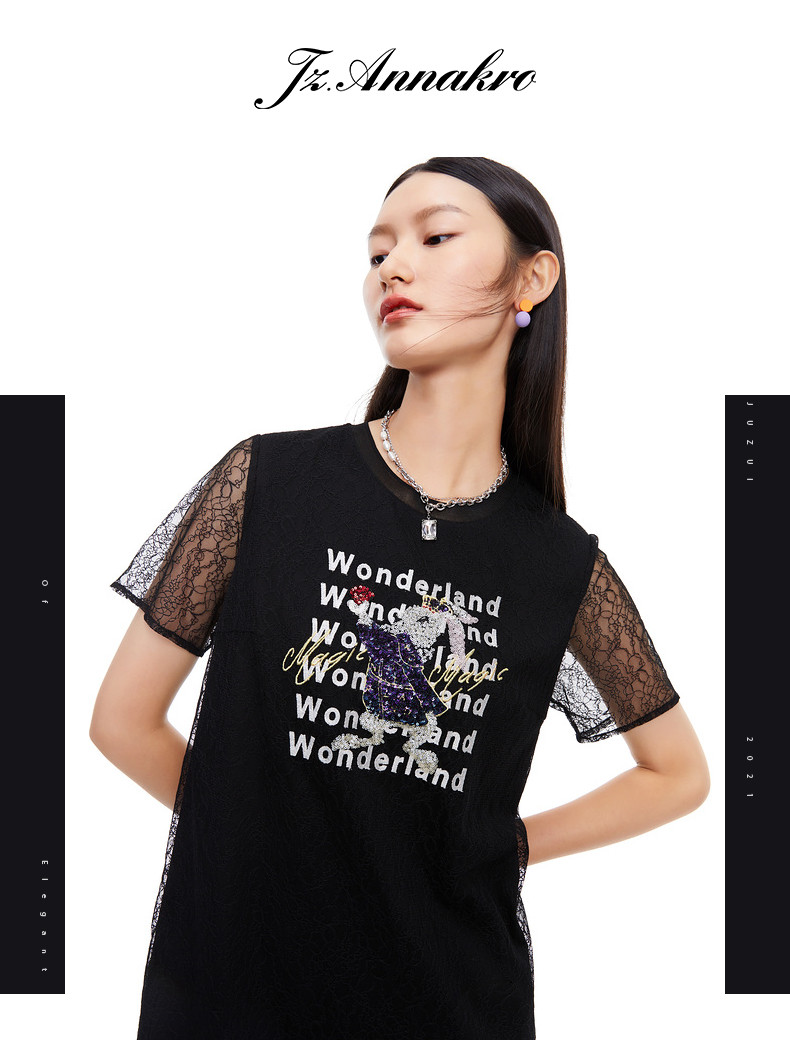 首页 > 玖姿专区 > 玖姿服饰 > 玖姿2021夏季新款安娜蔻系列黑色休闲蕾丝重工亮片小兔子女连衣裙