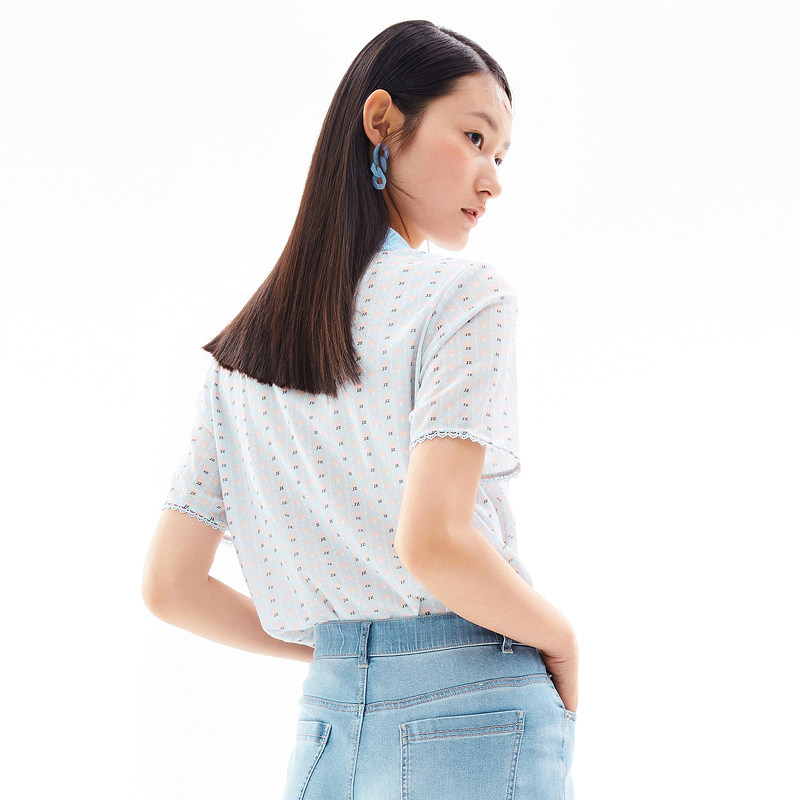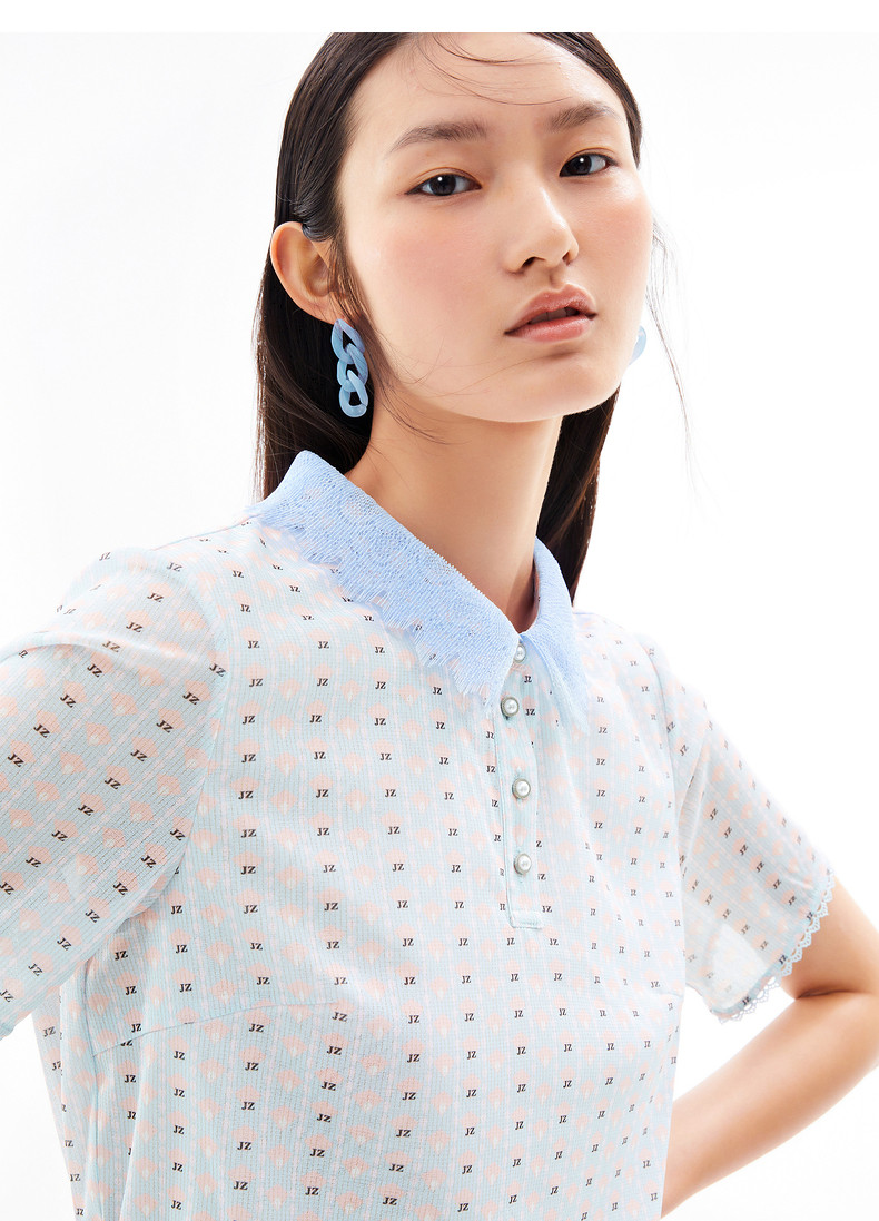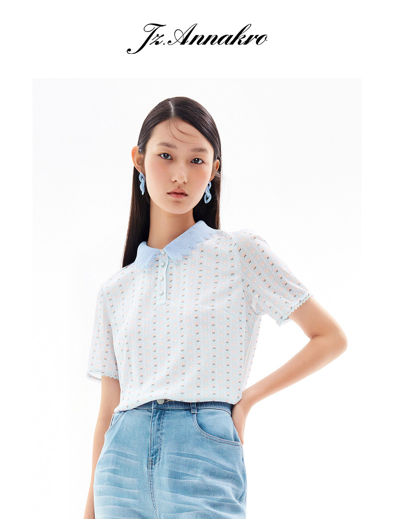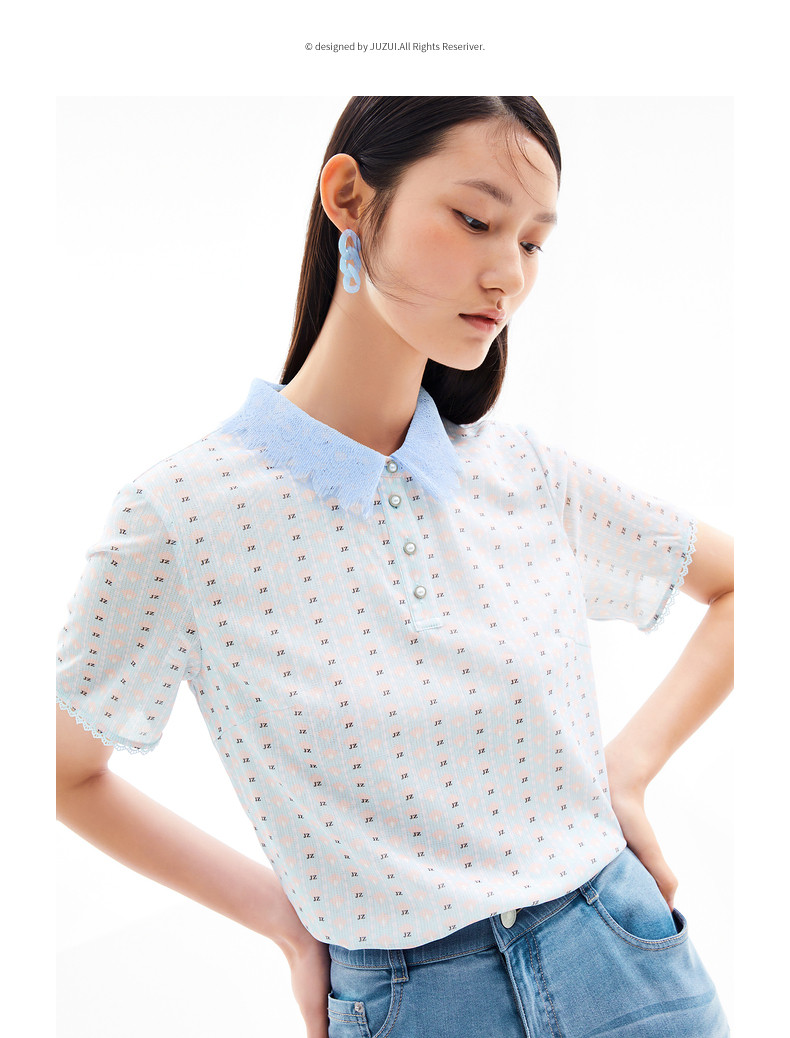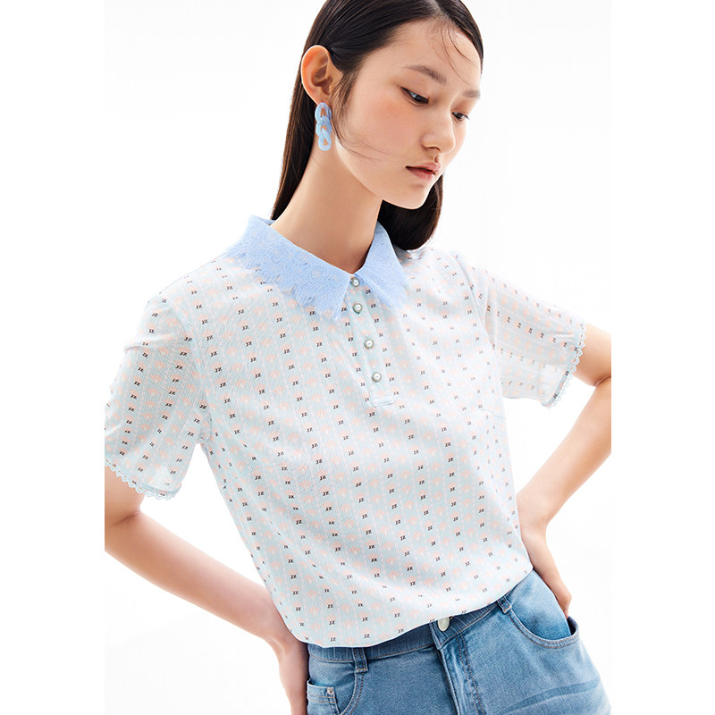 玖姿2021夏季新款安娜蔻系列清新字母亮丝混纺蕾丝翻领拼接女T恤