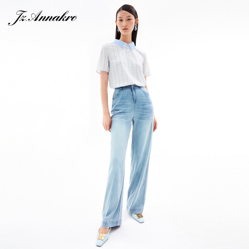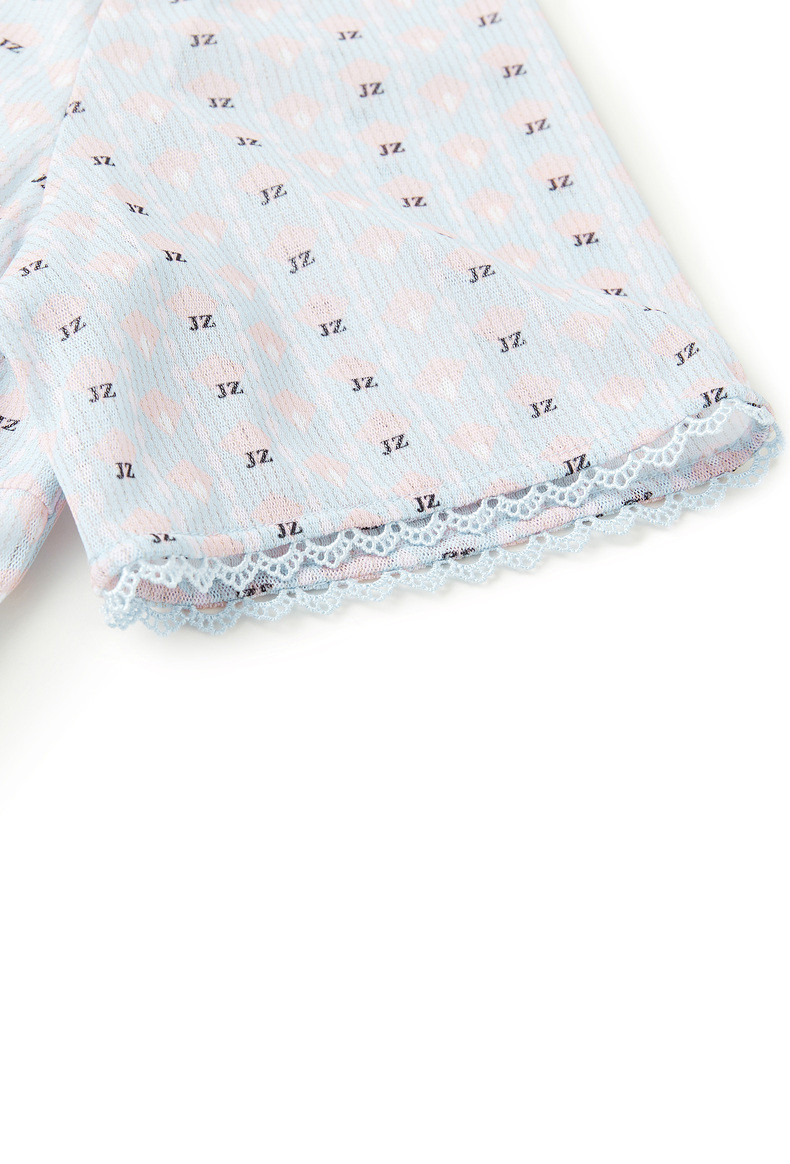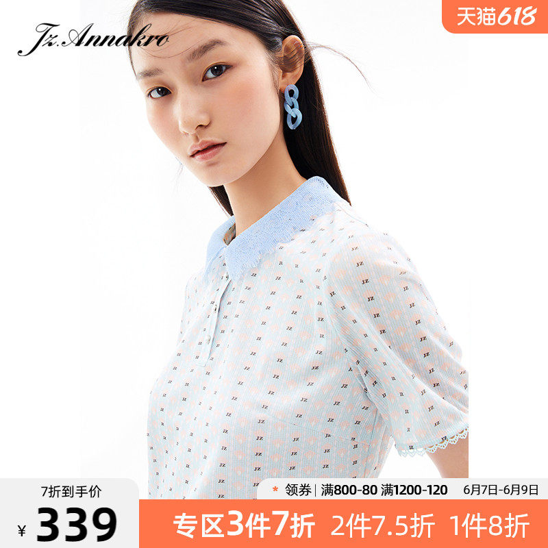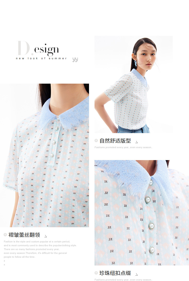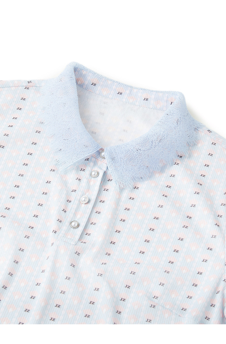 玖姿2021夏季新款安娜蔻系列清新字母亮丝混纺蕾丝翻领拼接女T恤
