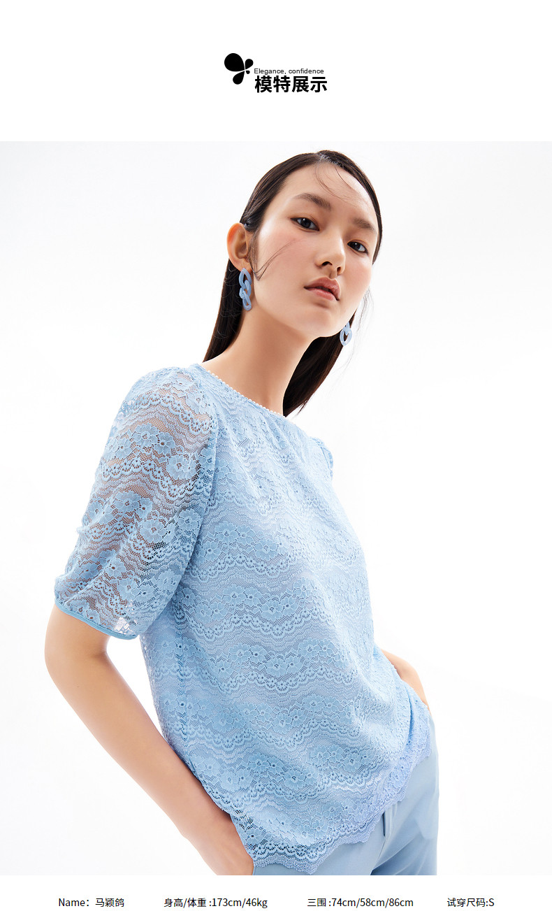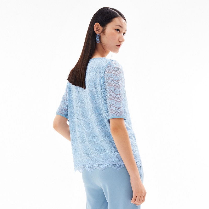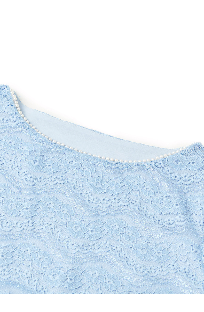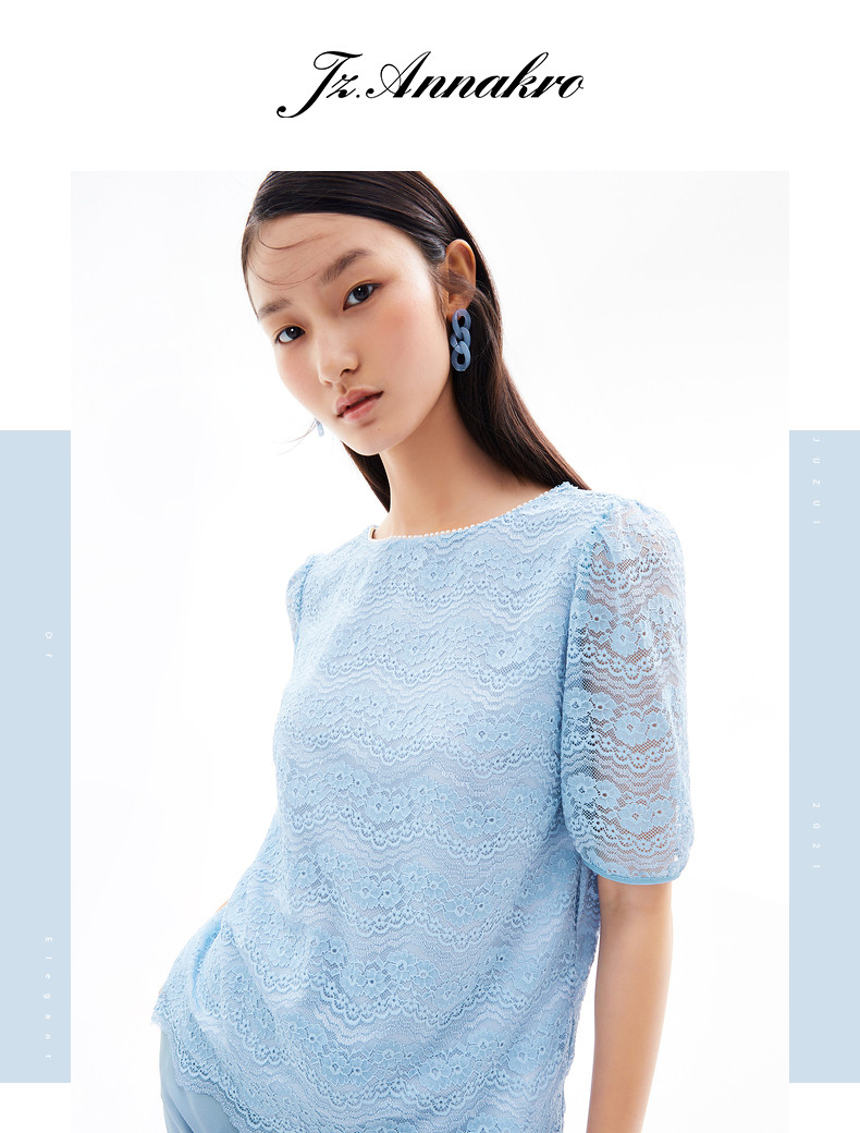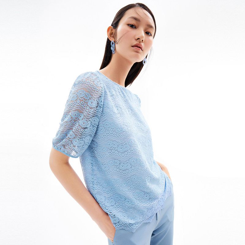 首页 > 玖姿专区 > 玖姿服饰 > 玖姿2021夏季新款安娜蔻系列蓝色圆领水波纹小清新约会女蕾丝衫