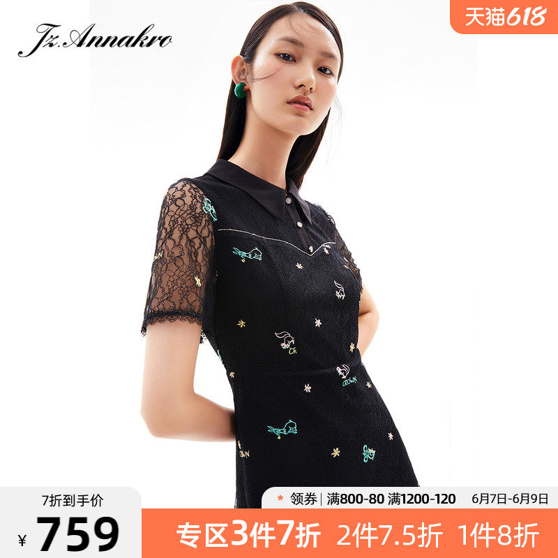 玖姿2021夏季新款安娜蔻系列黑色蕾丝绣花收腰中长女修身连衣裙