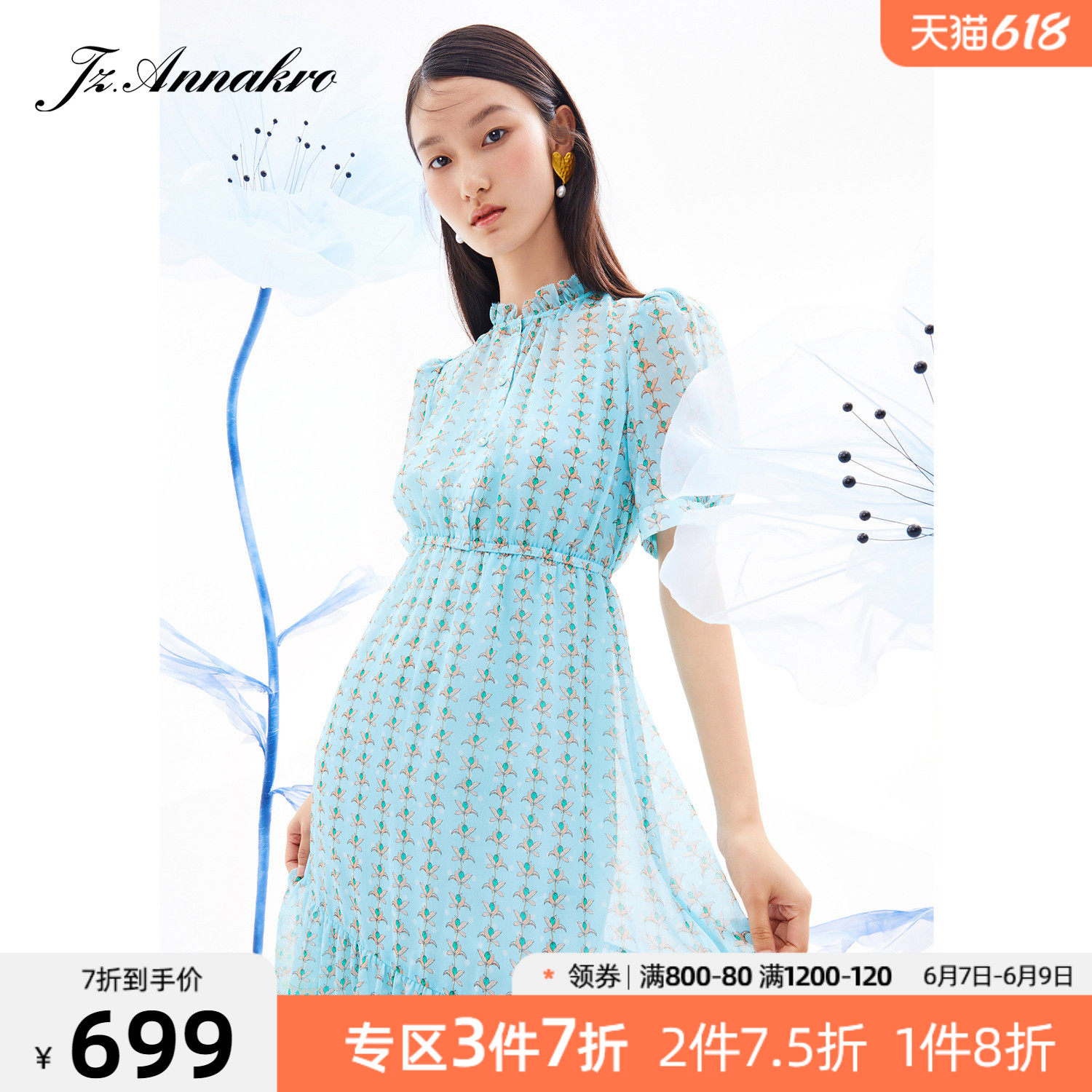 玖姿2021夏季新款安娜蔻系列蓝色度假风异域民族收腰女雪纺连衣裙