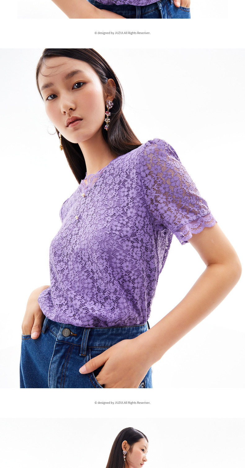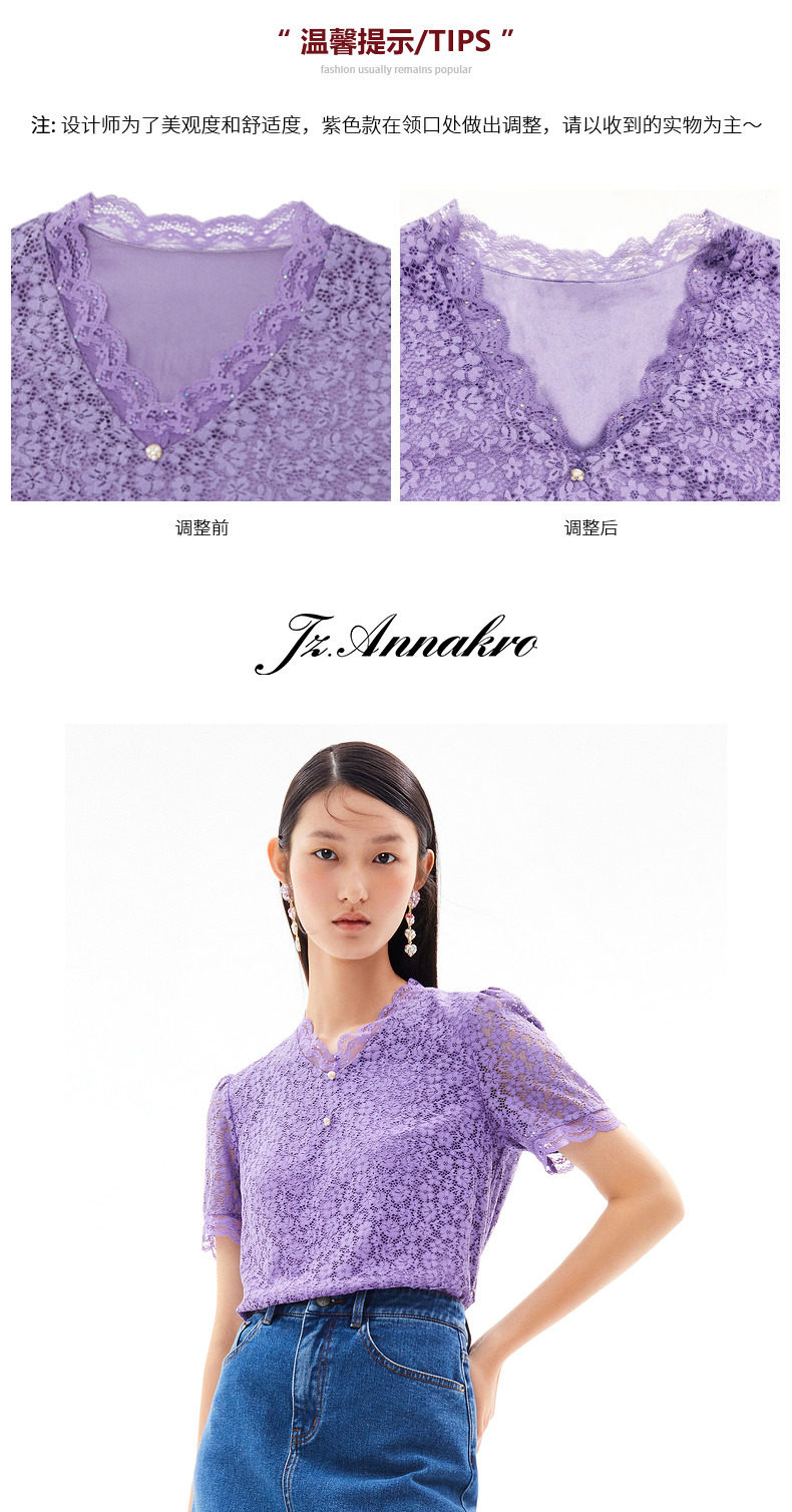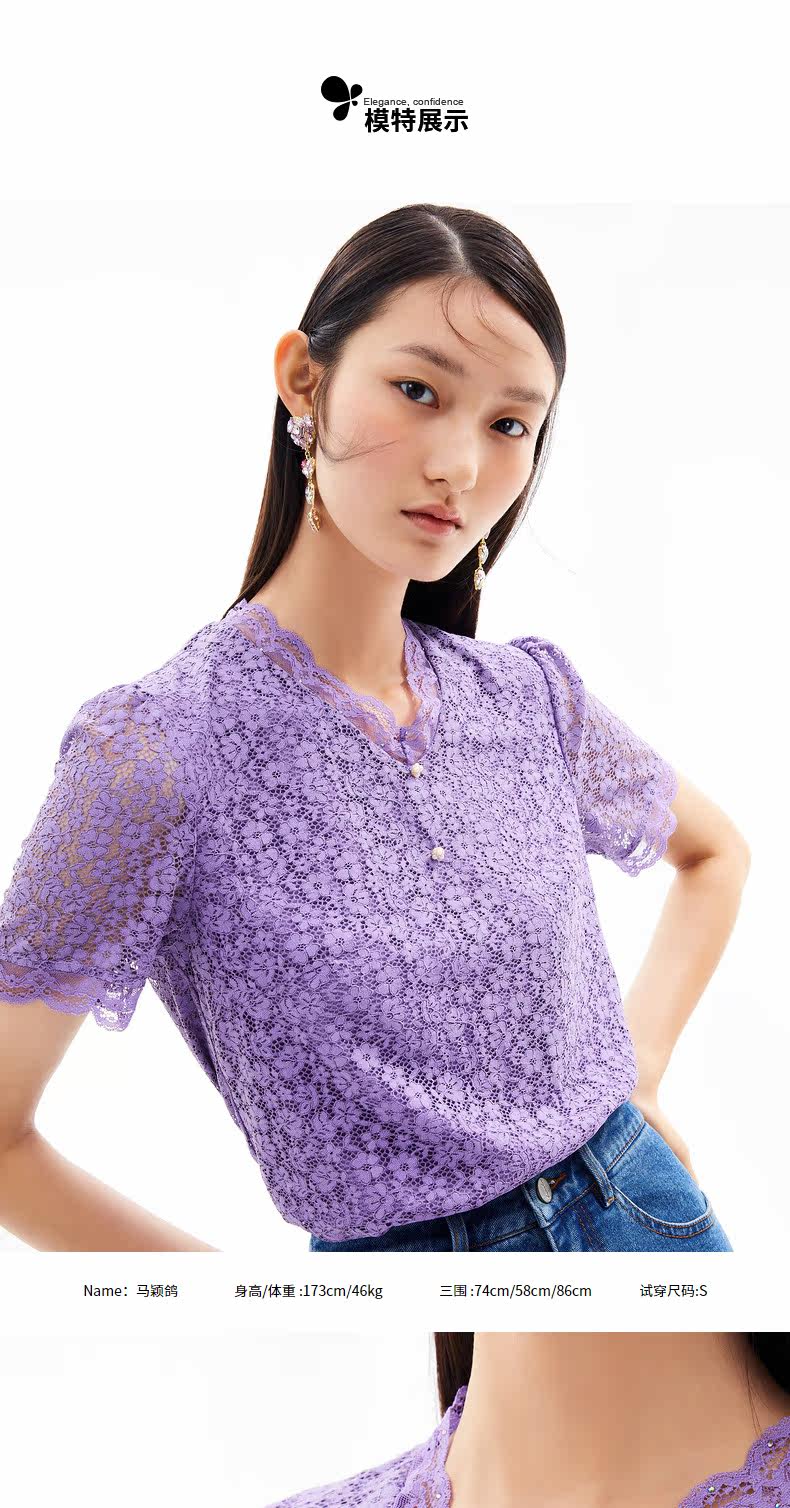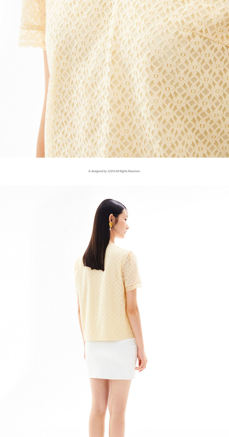 首页 > 玖姿专区 > 玖姿服饰 > 玖姿2021夏季新款安娜蔻系列纯色优雅气质款约会短袖花边女蕾丝衫