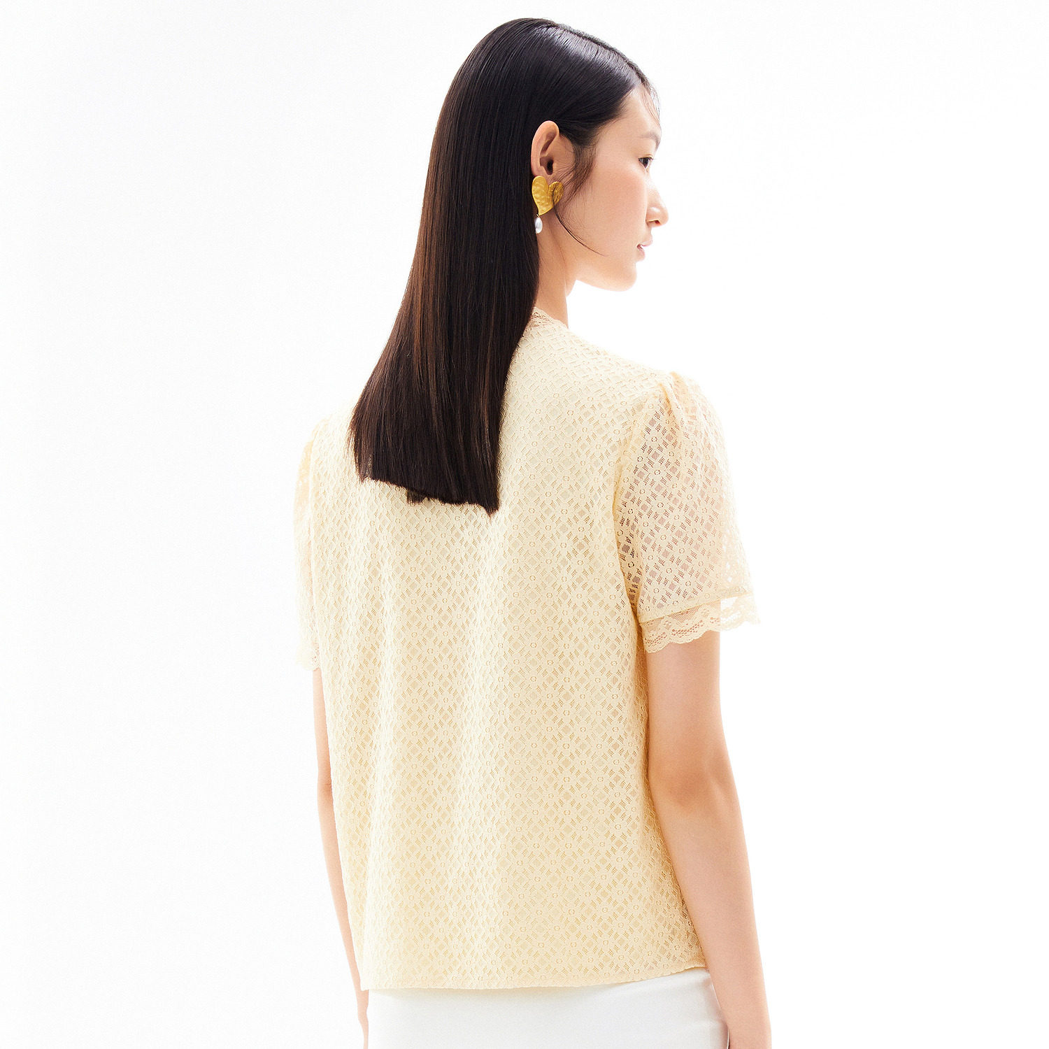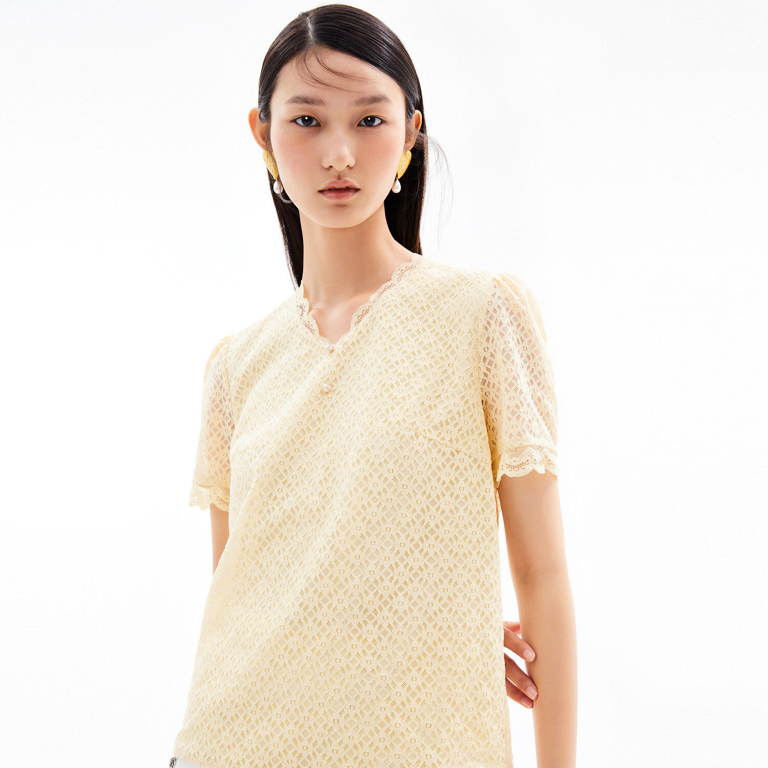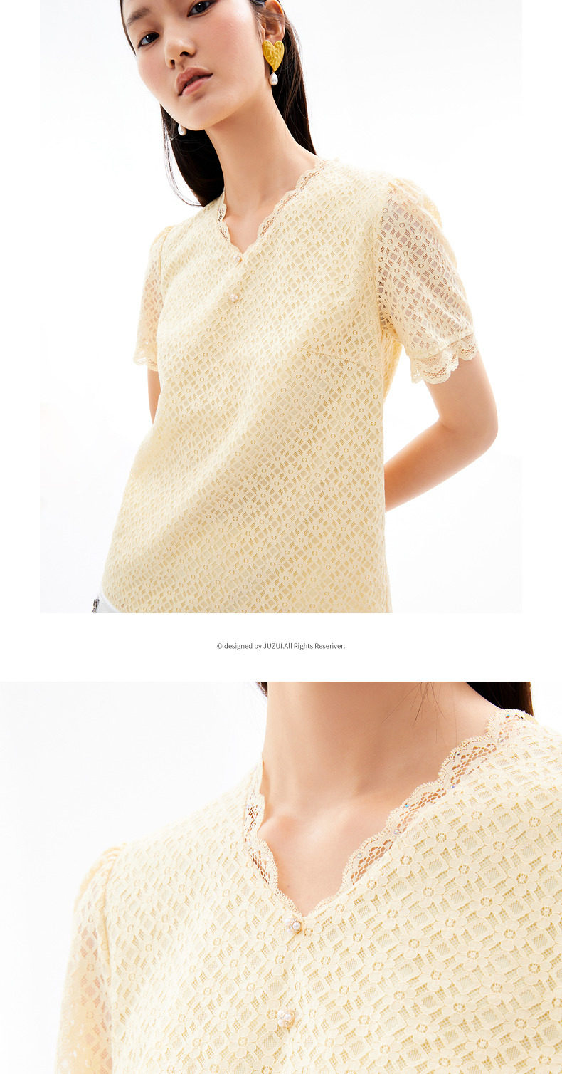 玖姿2021夏季新款安娜蔻系列纯色优雅气质款约会短袖花边女蕾丝衫