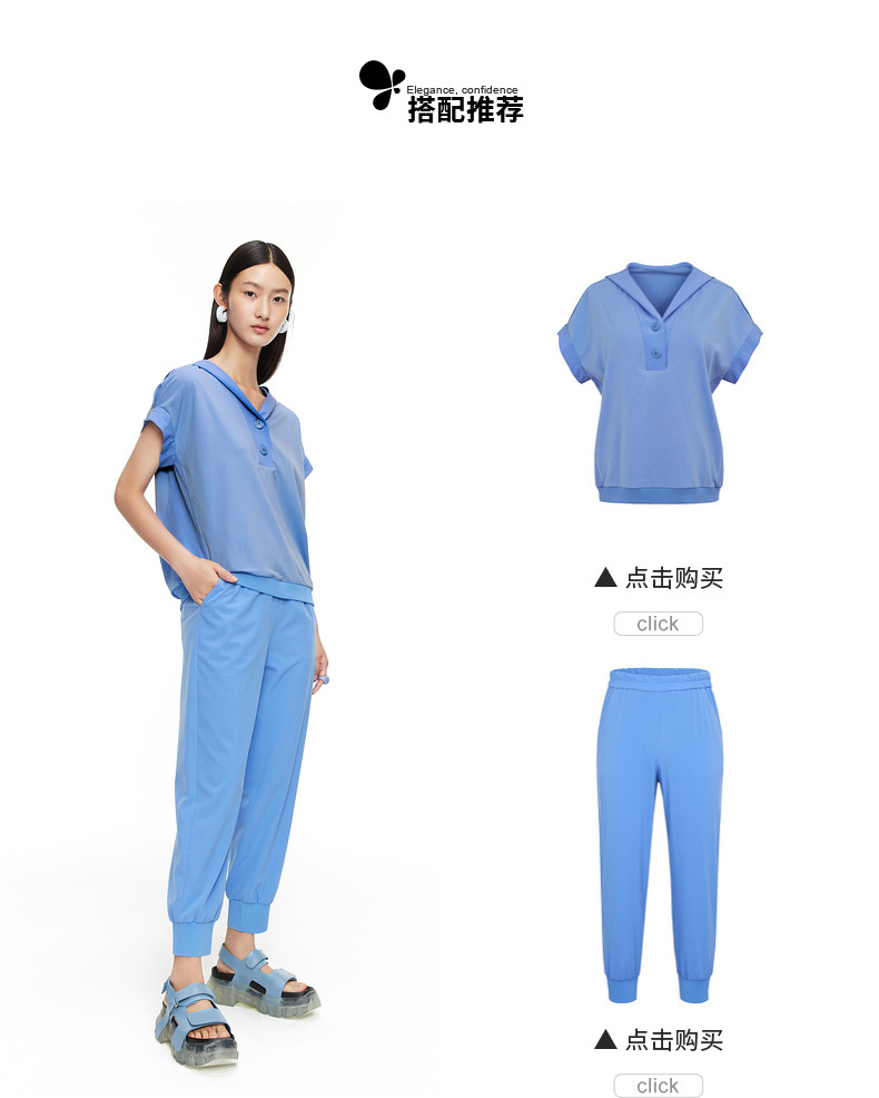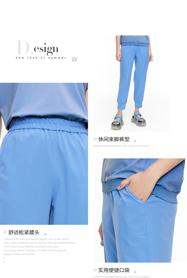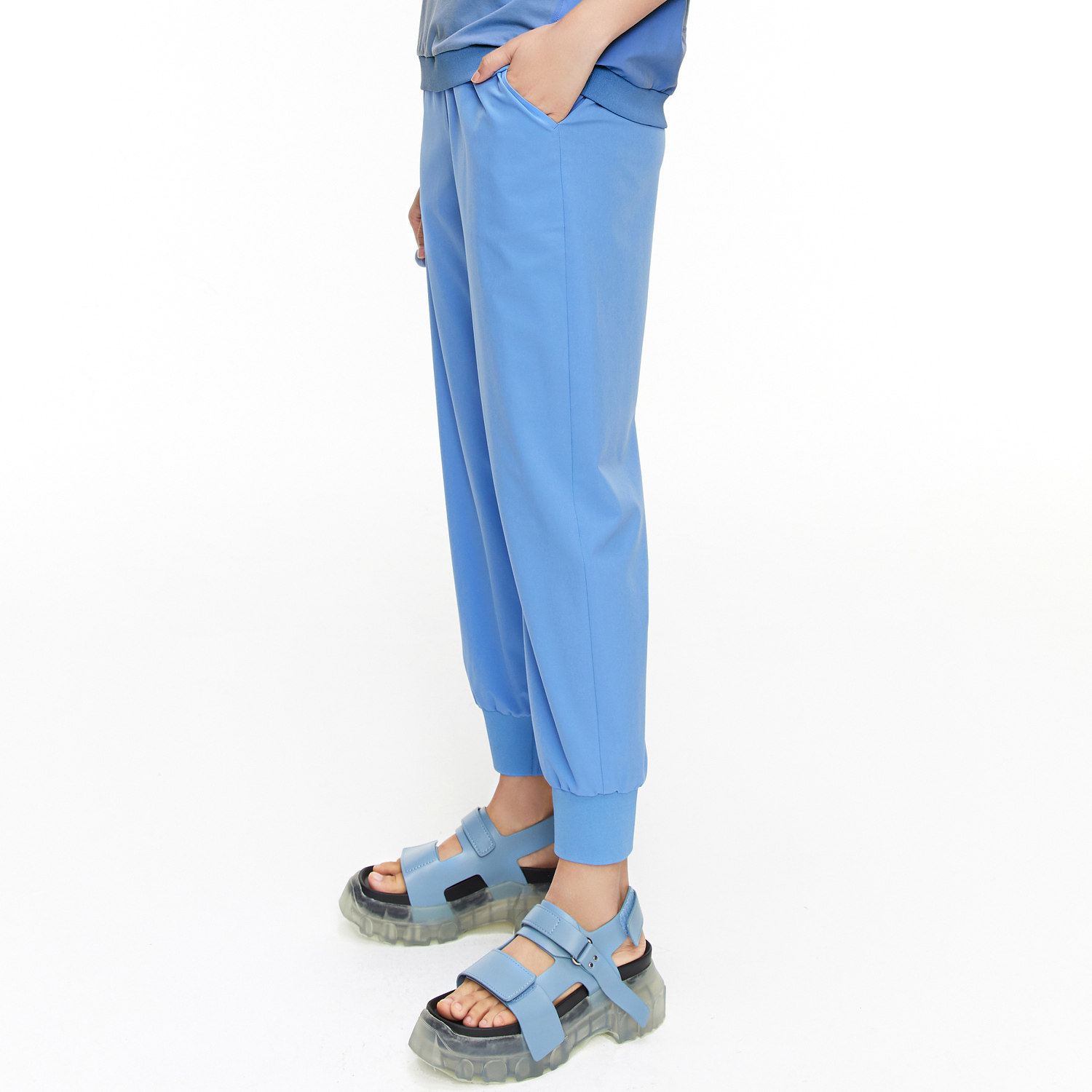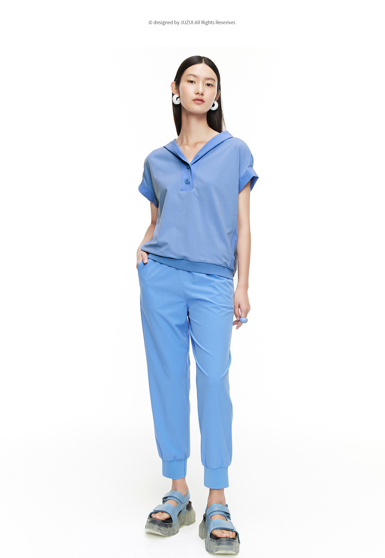 首页 > 玖姿专区 > 玖姿服饰 > 玖姿2021夏季新款安娜蔻系列蓝色松紧腰运动风休闲女显瘦束脚裤