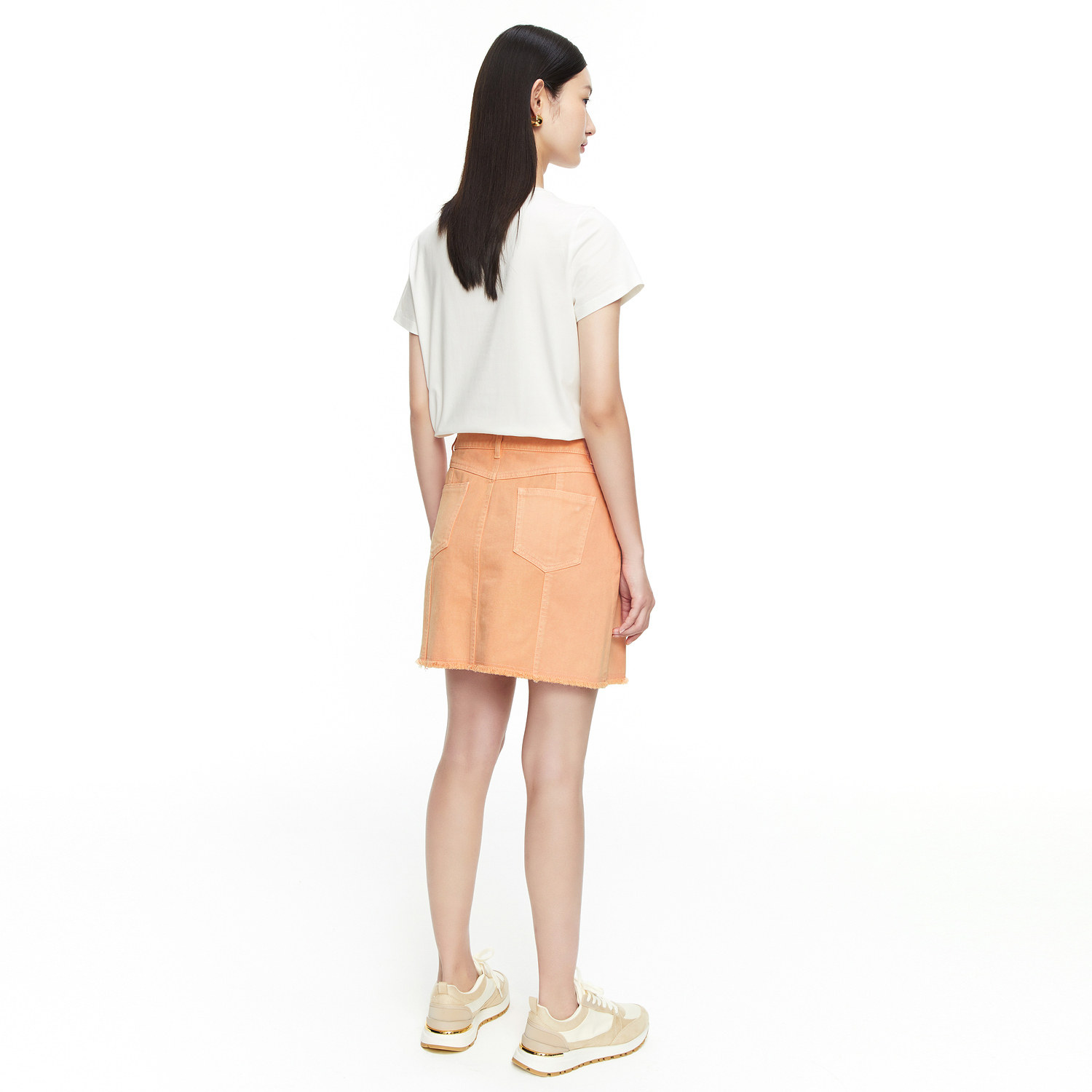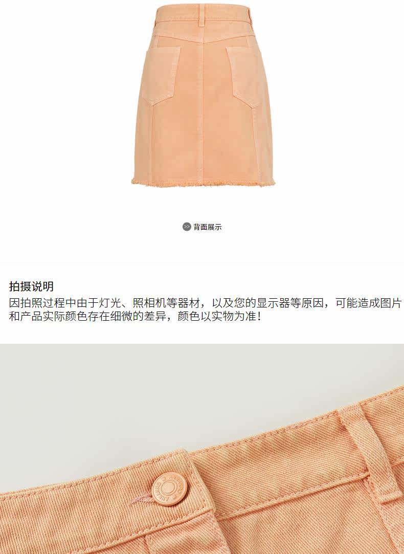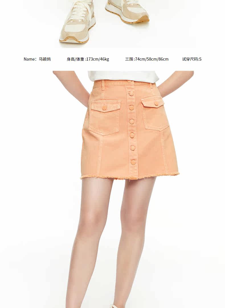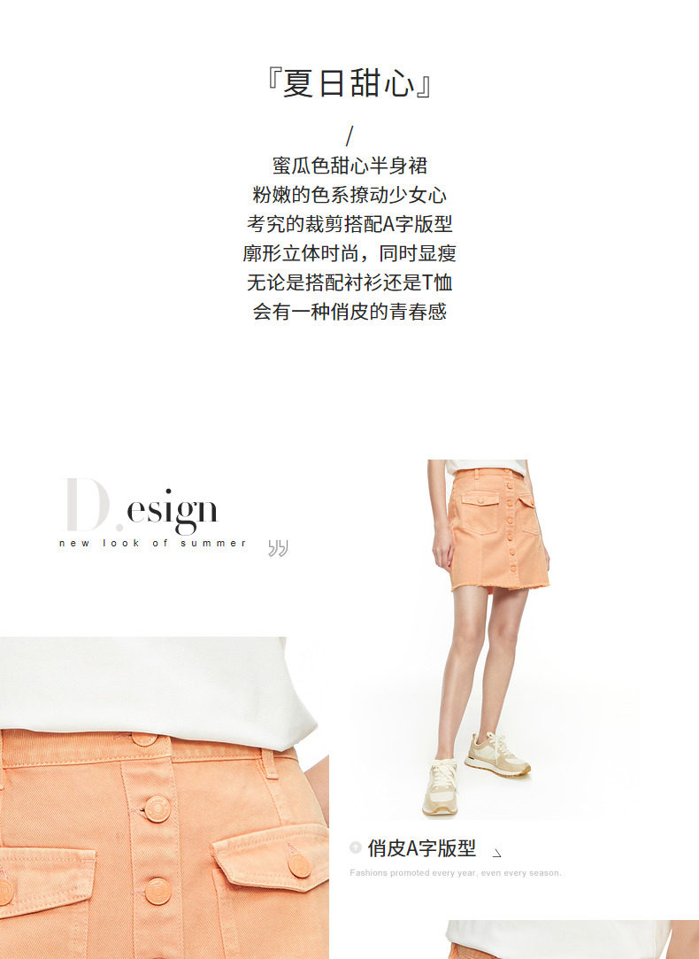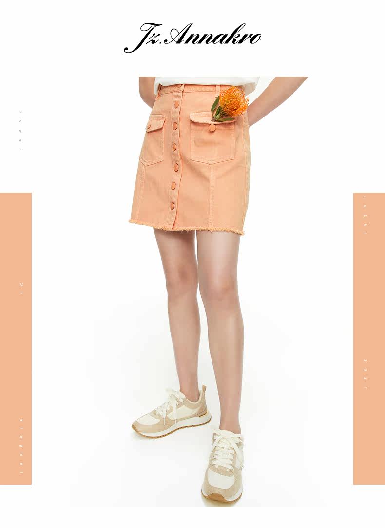 首页 > 玖姿专区 > 玖姿服饰 > 玖姿2021夏季新款安娜蔻系列蜜瓜橘粉色A字时尚显瘦女牛仔半身裙