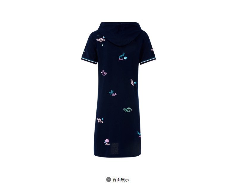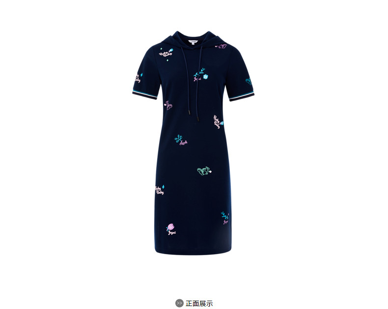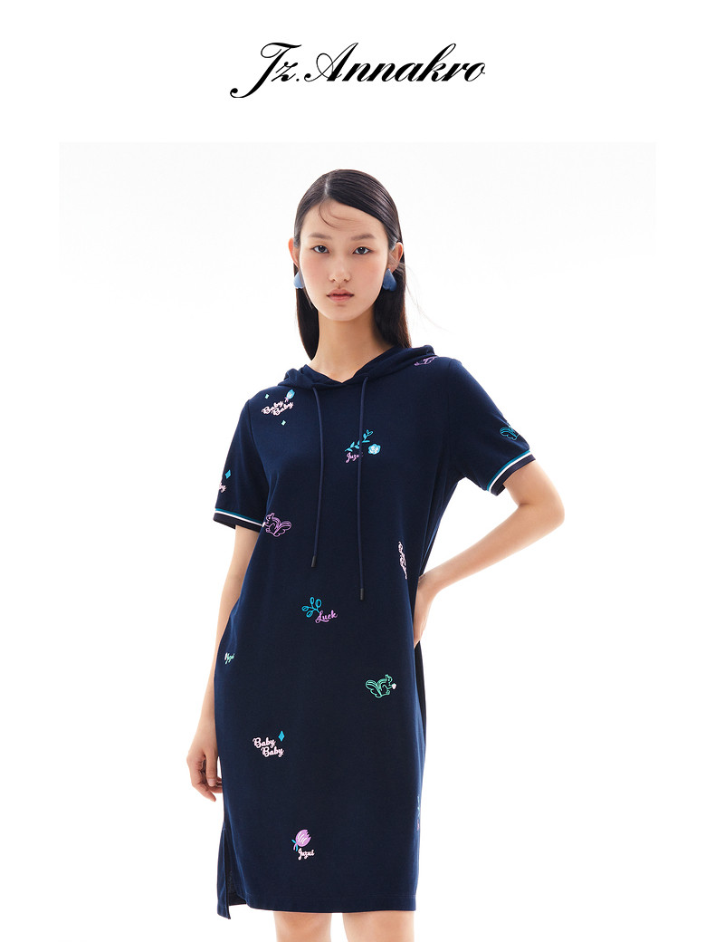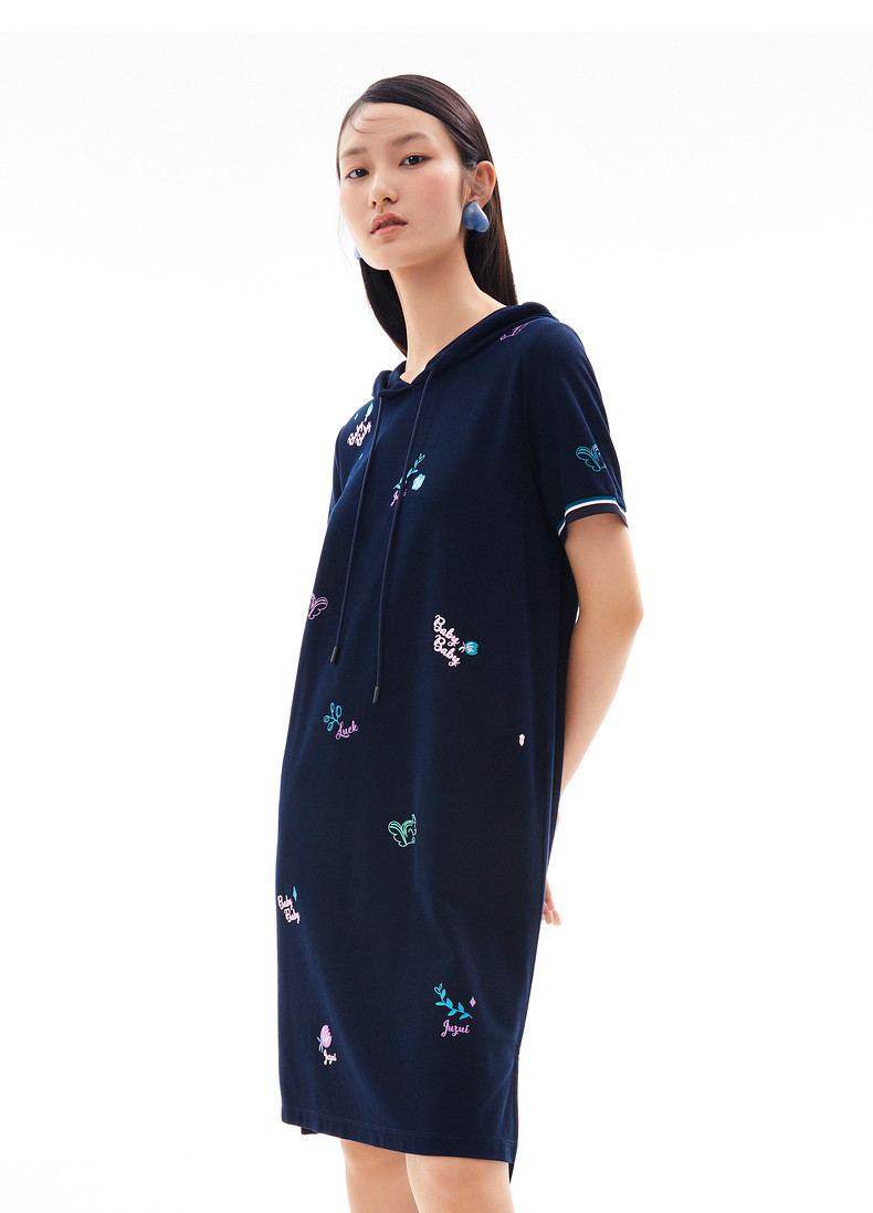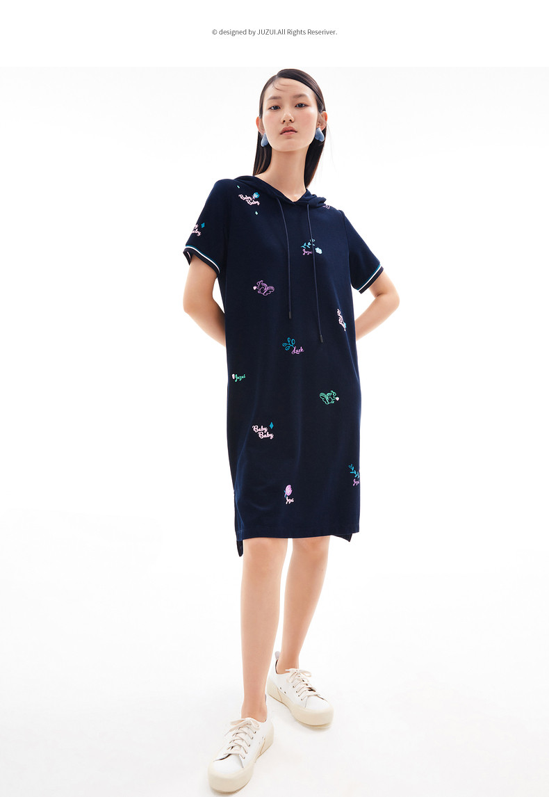 首页 > 玖姿专区 > 玖姿服饰 > 玖姿2021夏季新款安娜蔻系列休闲风趣味连帽直身印花女T恤连衣裙