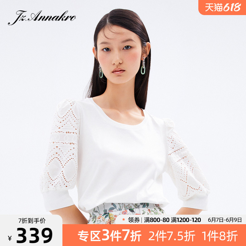 玖姿2021夏季新款安娜蔻系列纯色圆领简约气质款镂空休闲女T恤