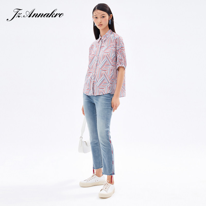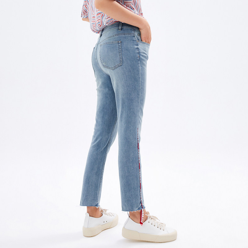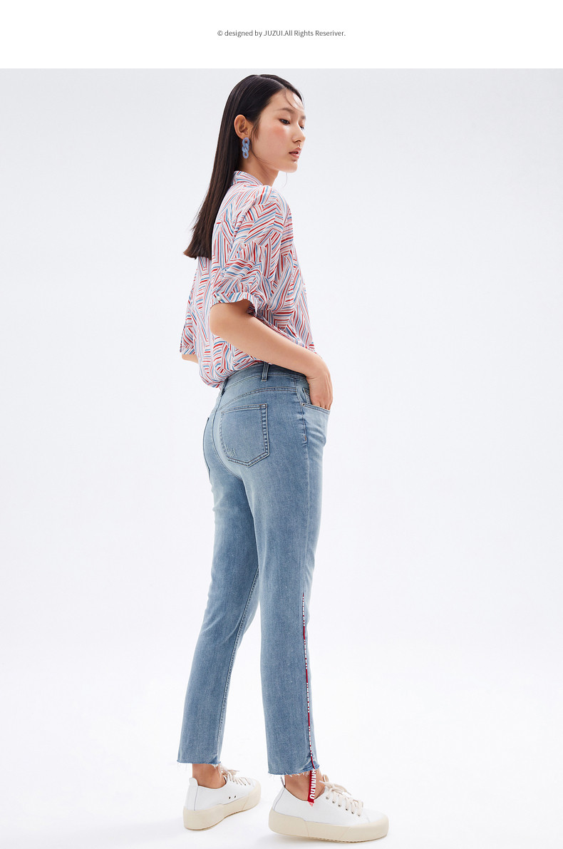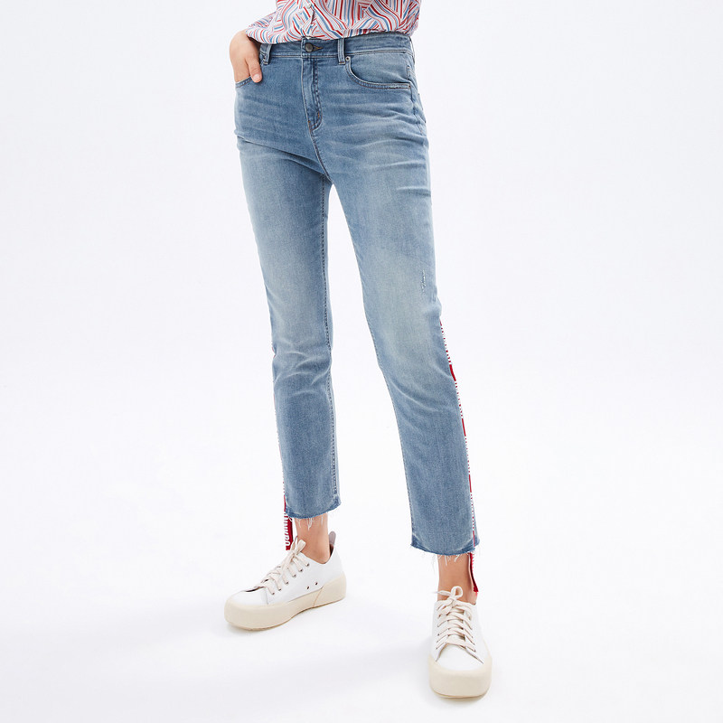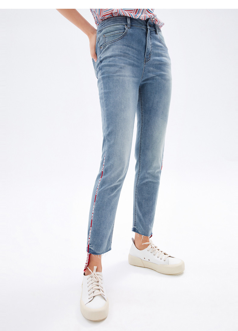 首页 > 玖姿专区 > 玖姿服饰 > 玖姿2021夏季新款安娜蔻系列水洗蓝色撞色织带拼接九分裤女牛仔裤