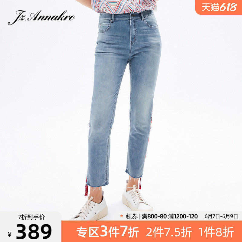玖姿2021夏季新款安娜蔻系列水洗蓝色撞色织带拼接九分裤女牛仔裤