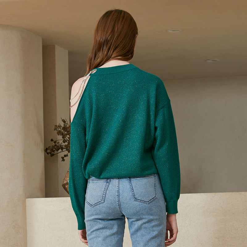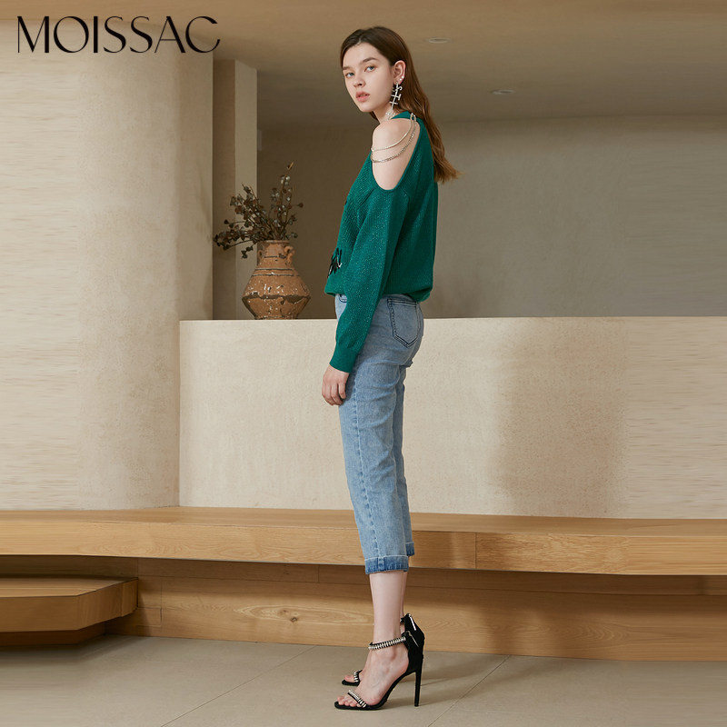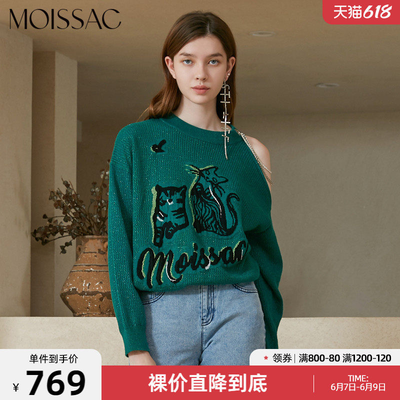 MOISSAC/摩萨克2021春季商场同款墨绿色辣妹露肩宽松女套头针织衫