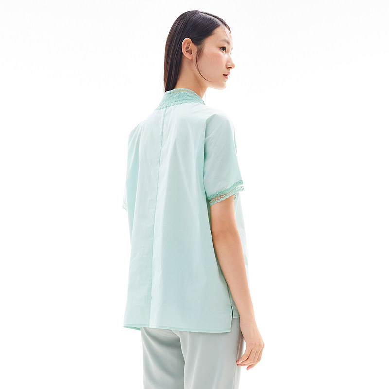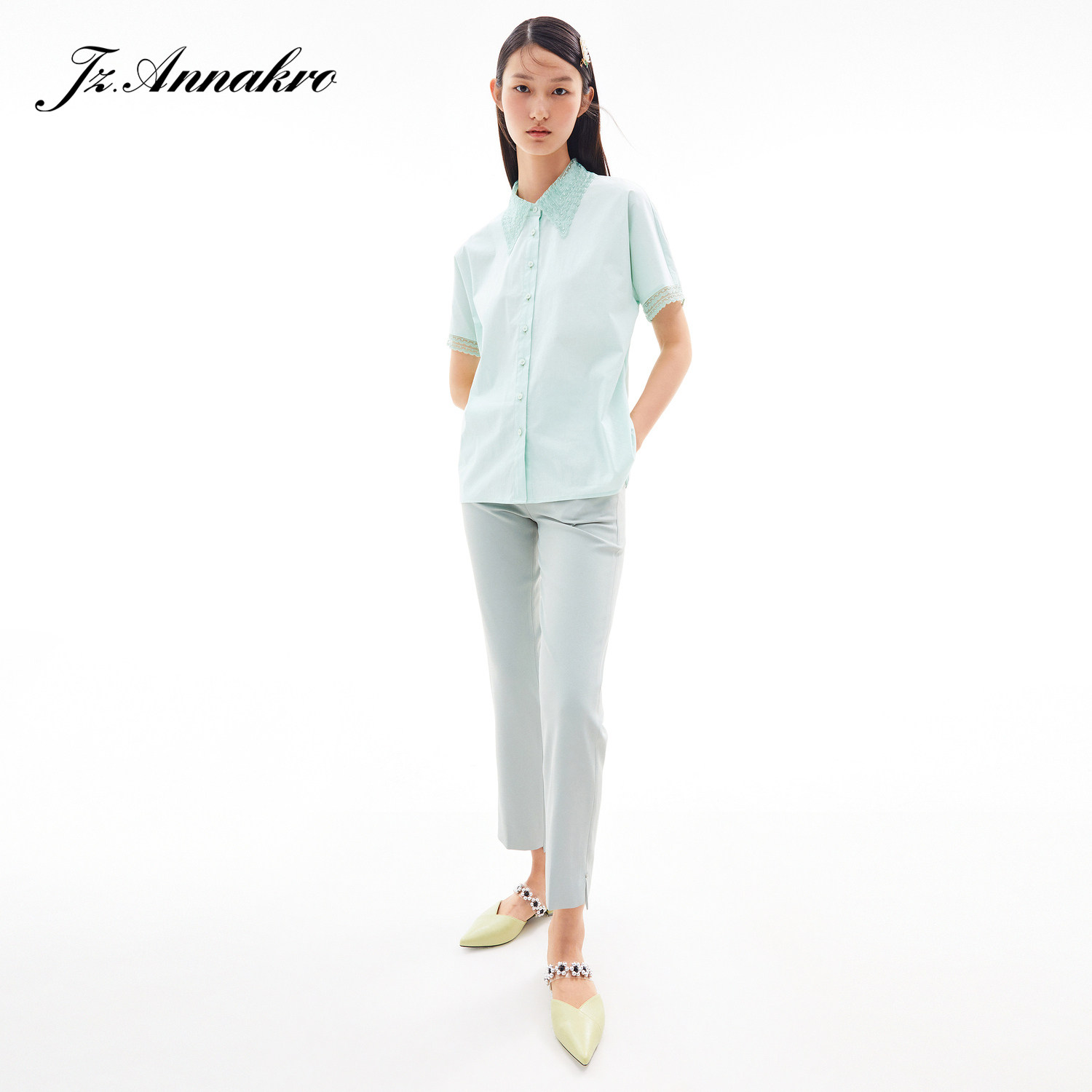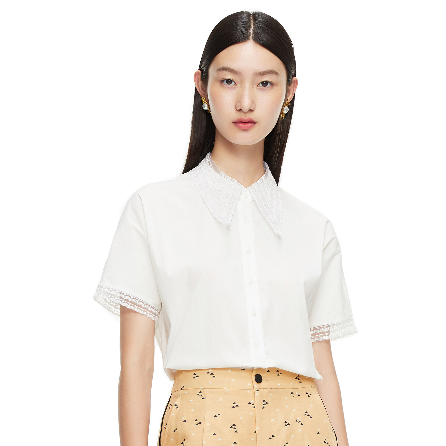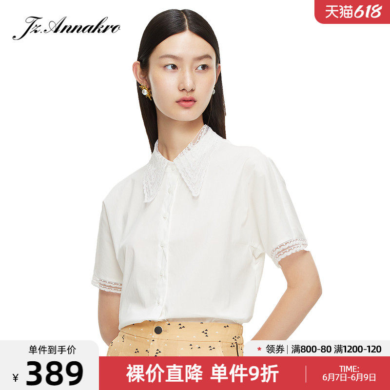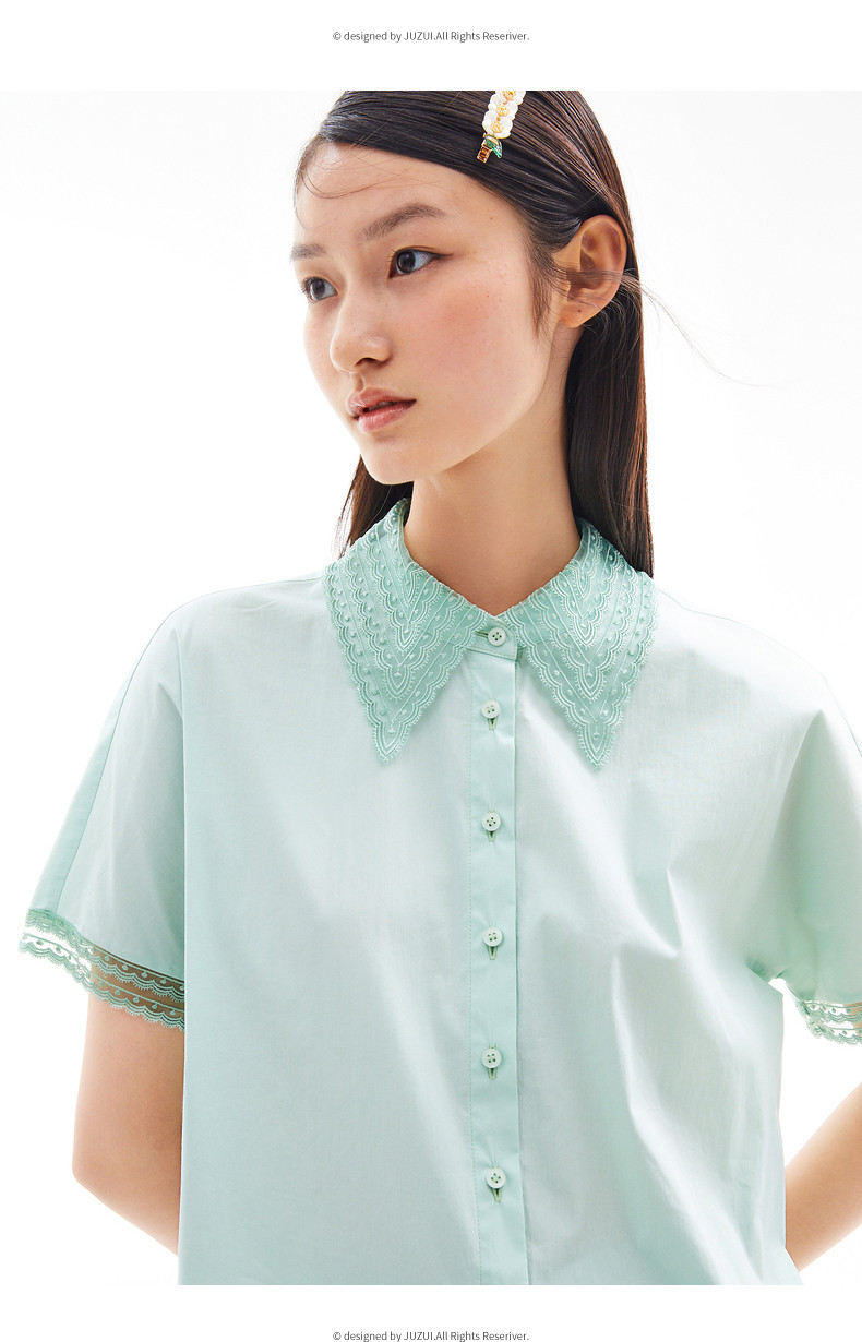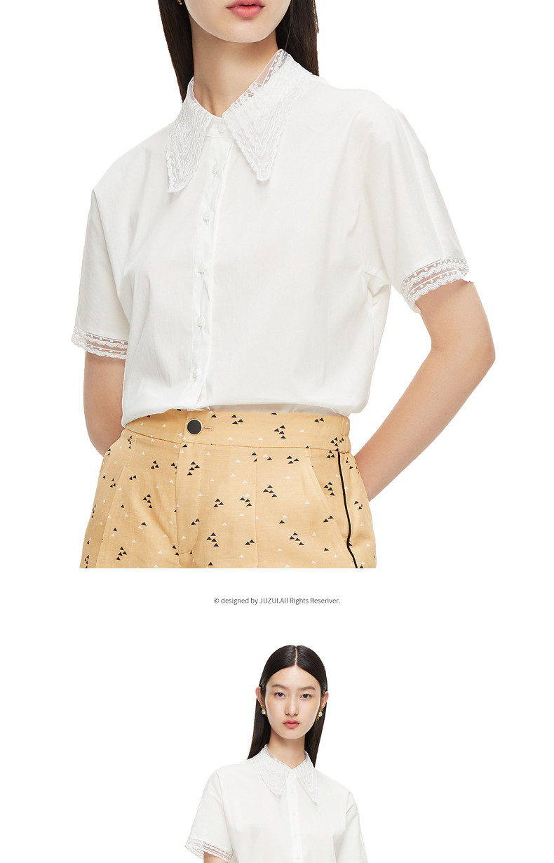 玖姿2021夏季新款安娜蔻系列纯色绣花拼接短袖时尚休闲都市女衬衫