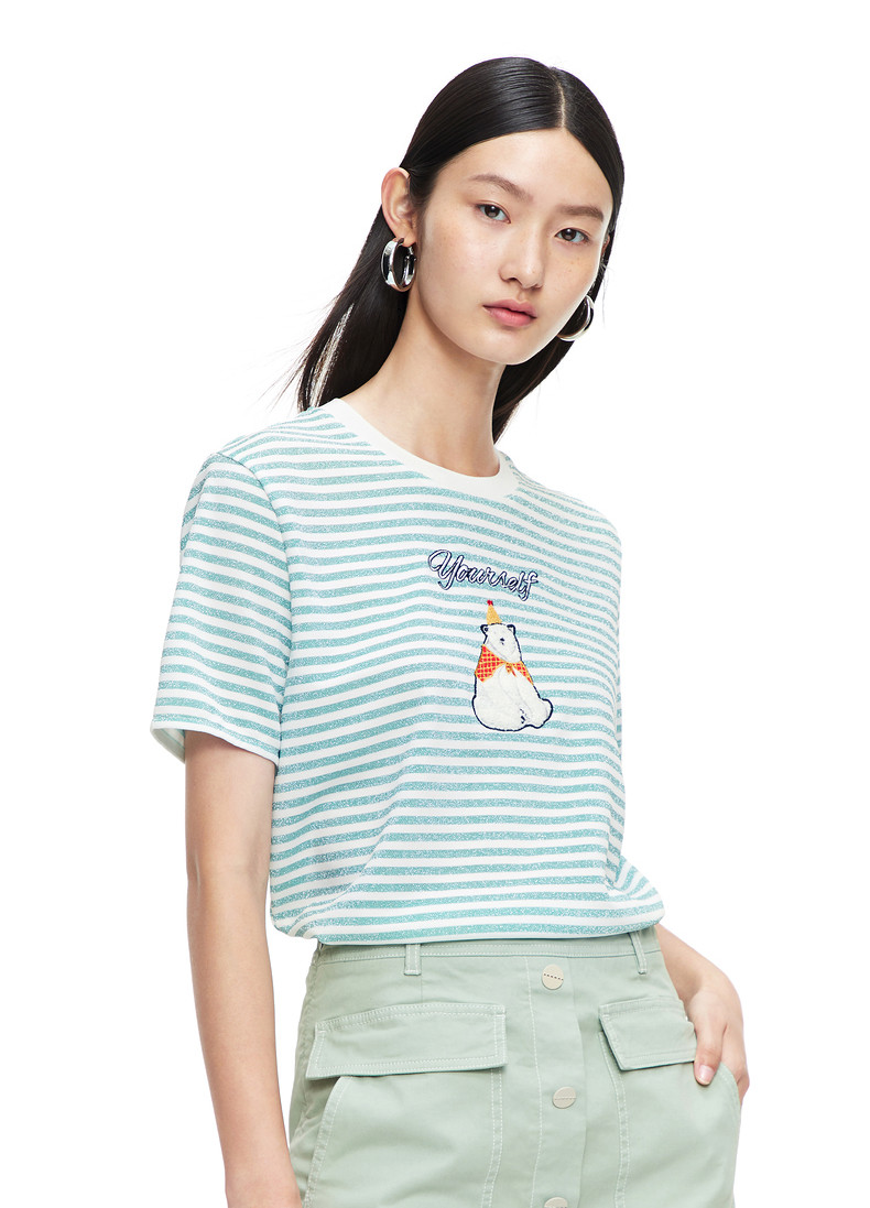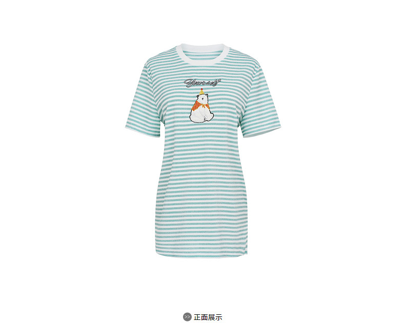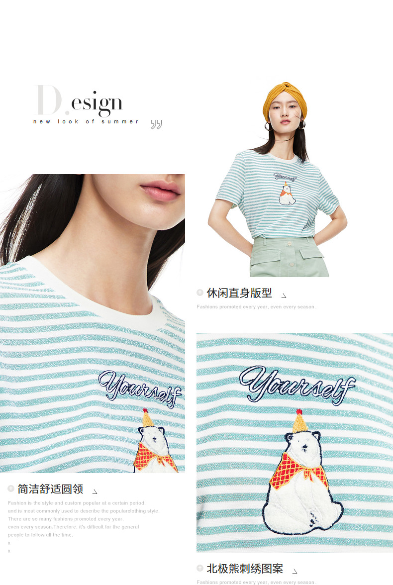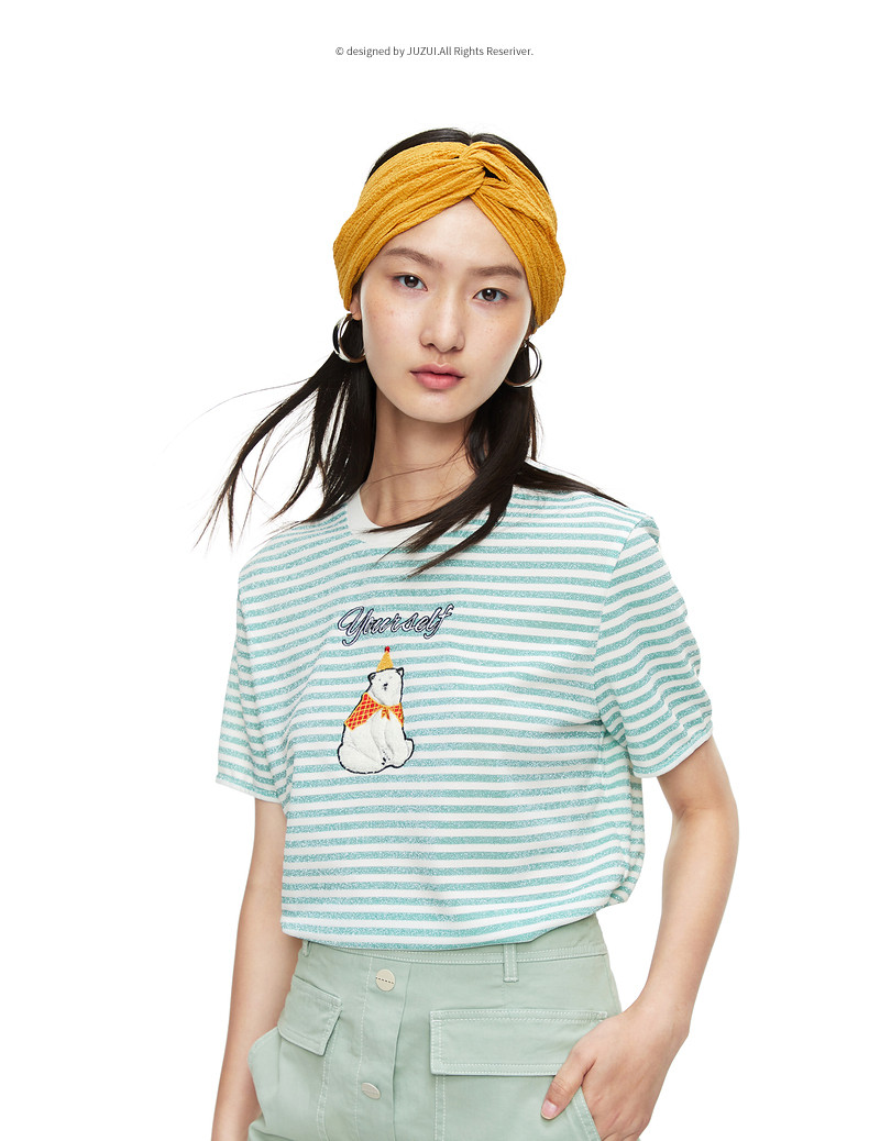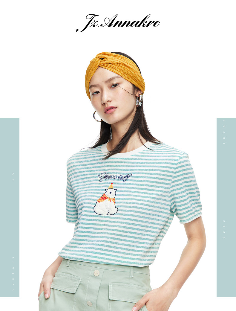 首页 > 玖姿专区 > 玖姿服饰 > 玖姿2021夏季新款安娜蔻系列条纹圆领时尚刺绣北极熊趣味女T恤衫