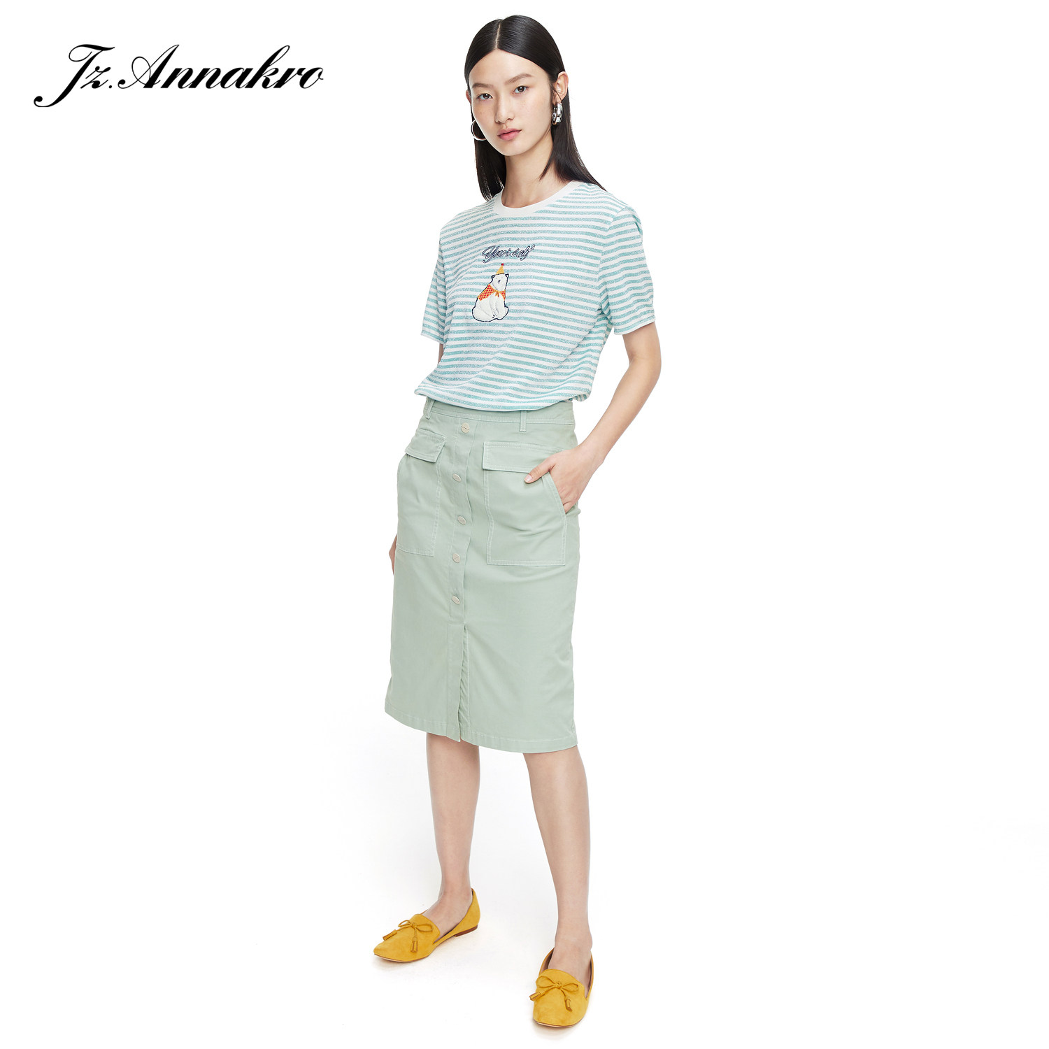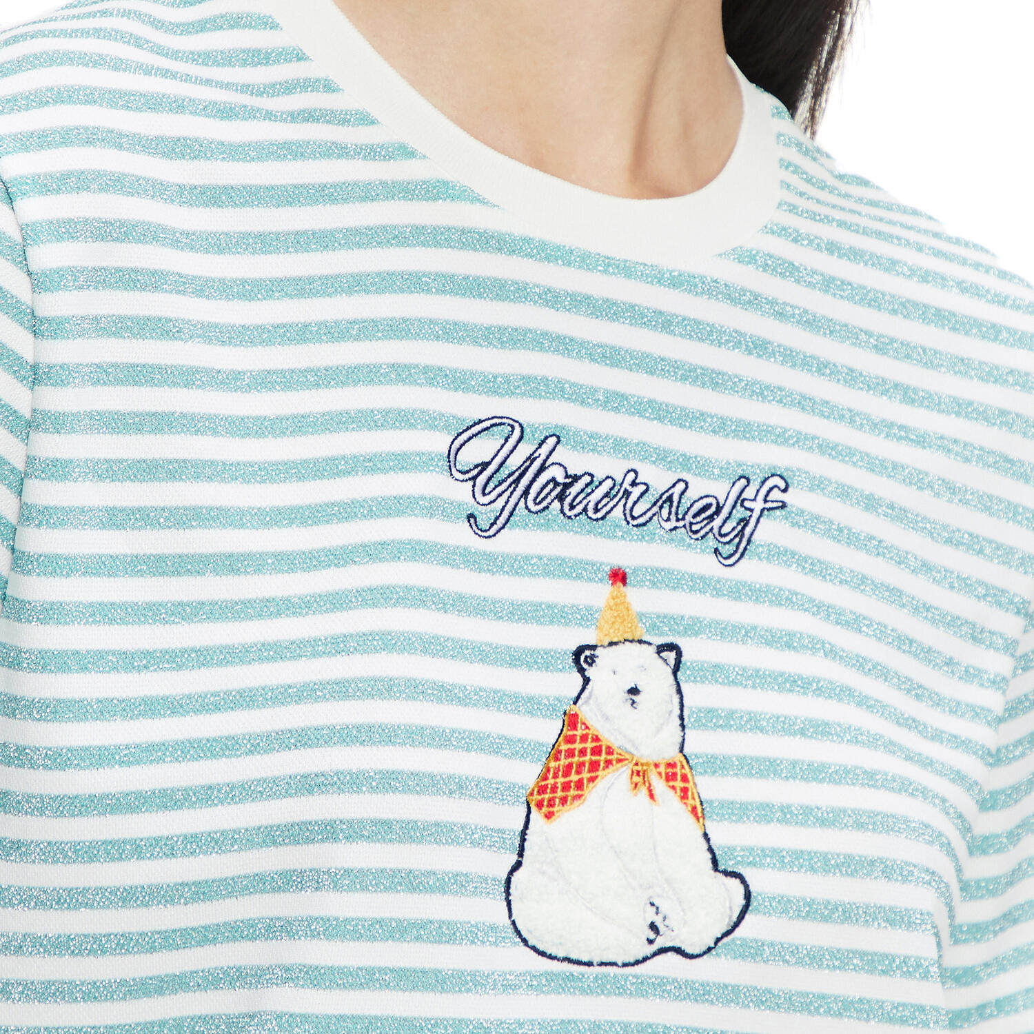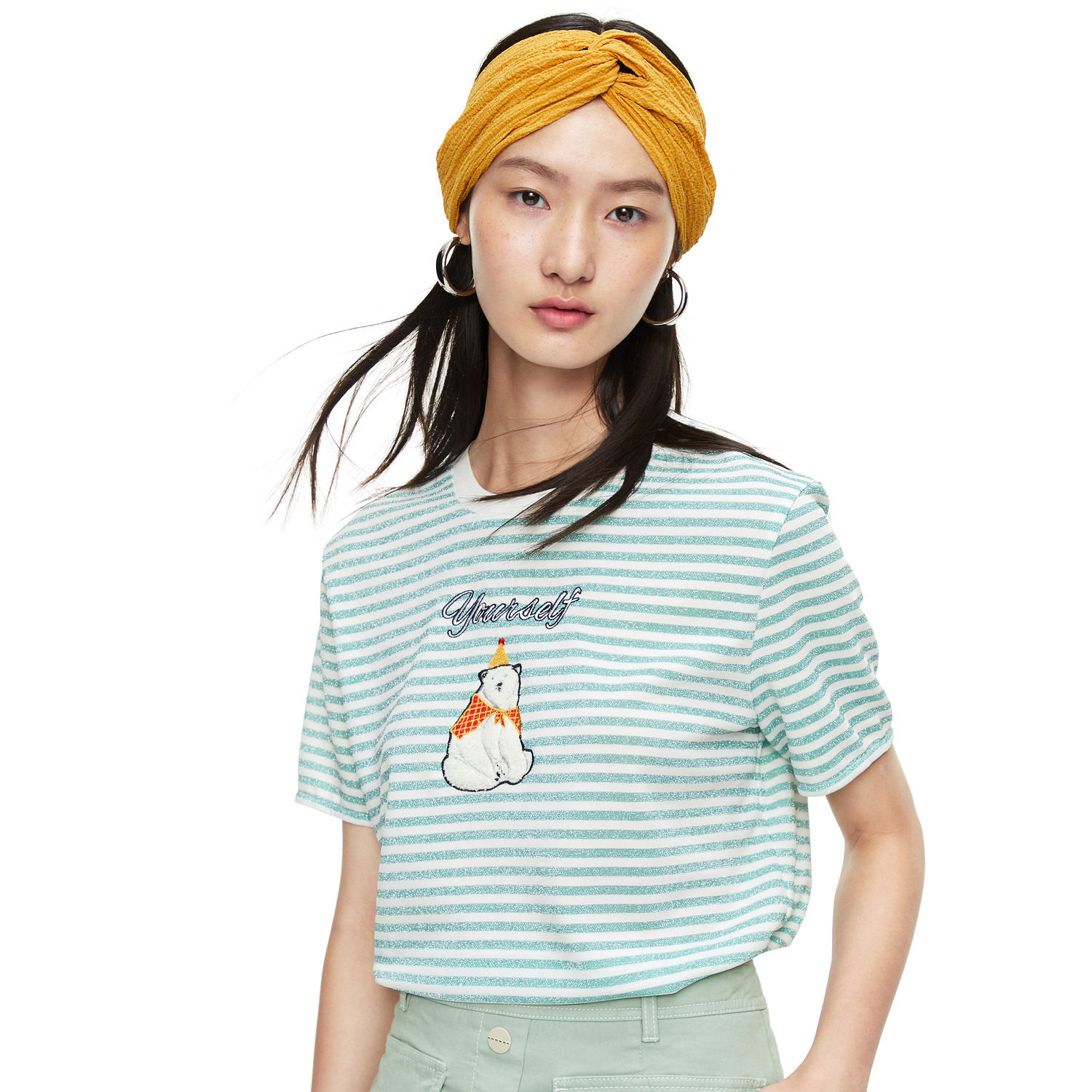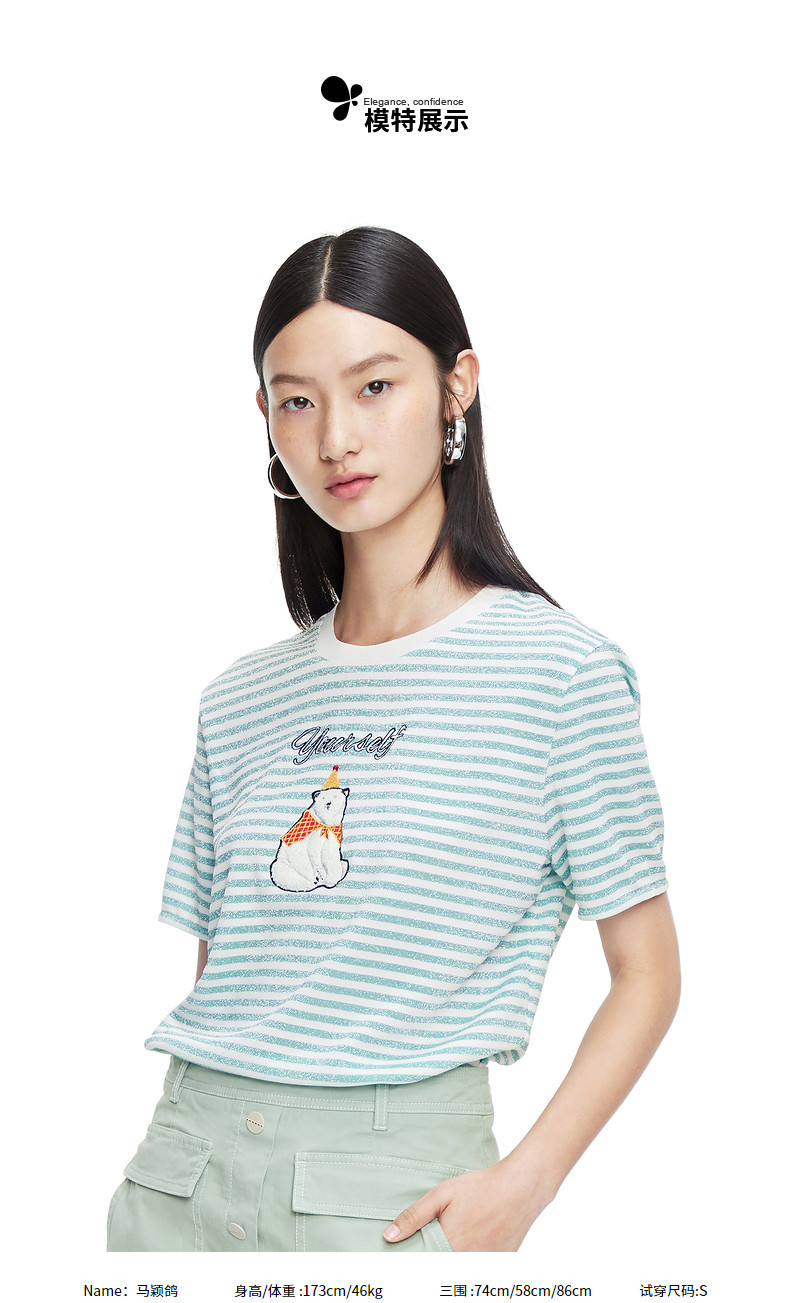 首页 > 玖姿专区 > 玖姿服饰 > 玖姿2021夏季新款安娜蔻系列条纹圆领时尚刺绣北极熊趣味女T恤衫