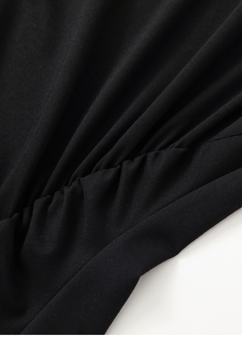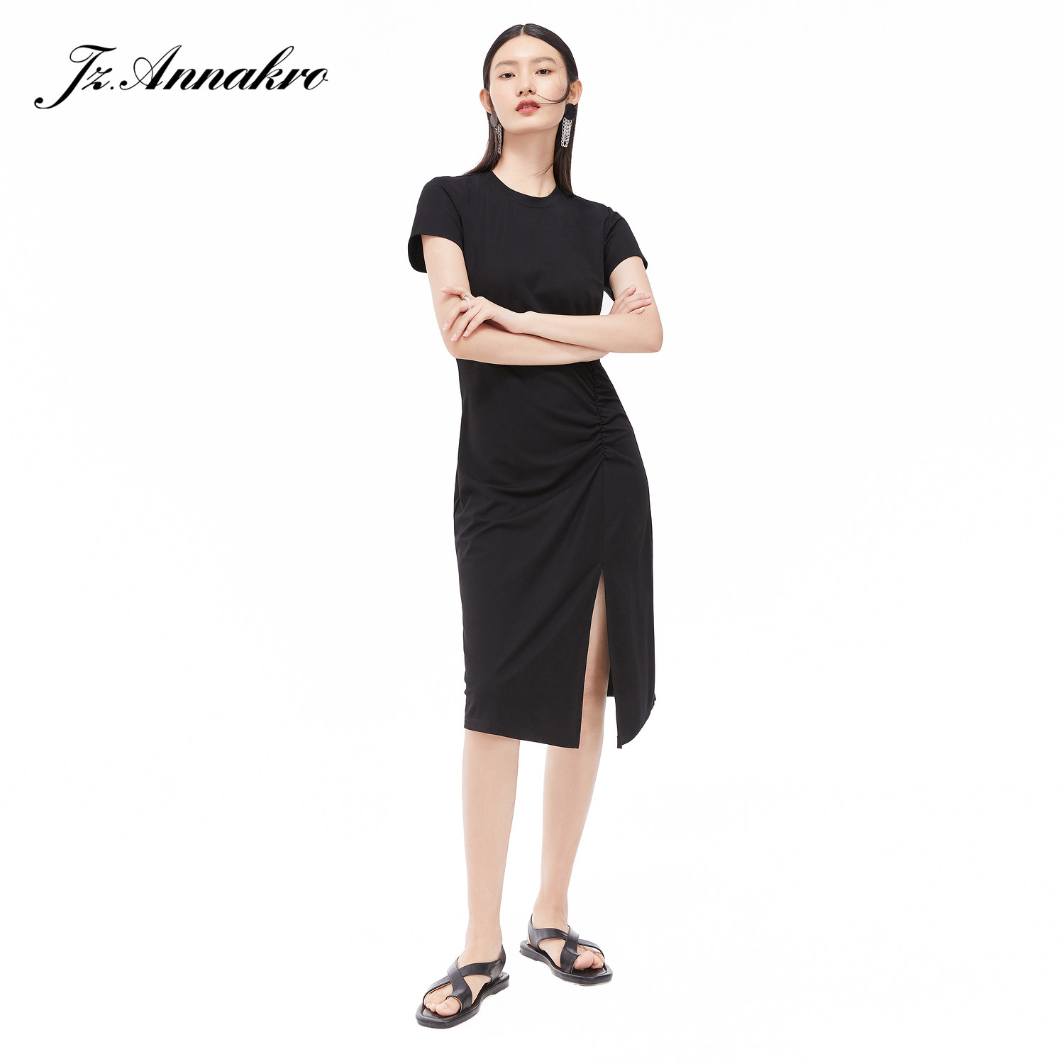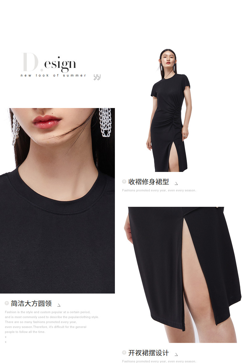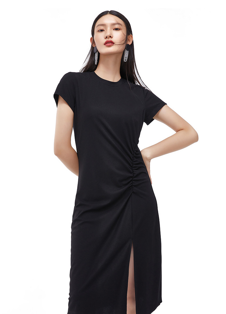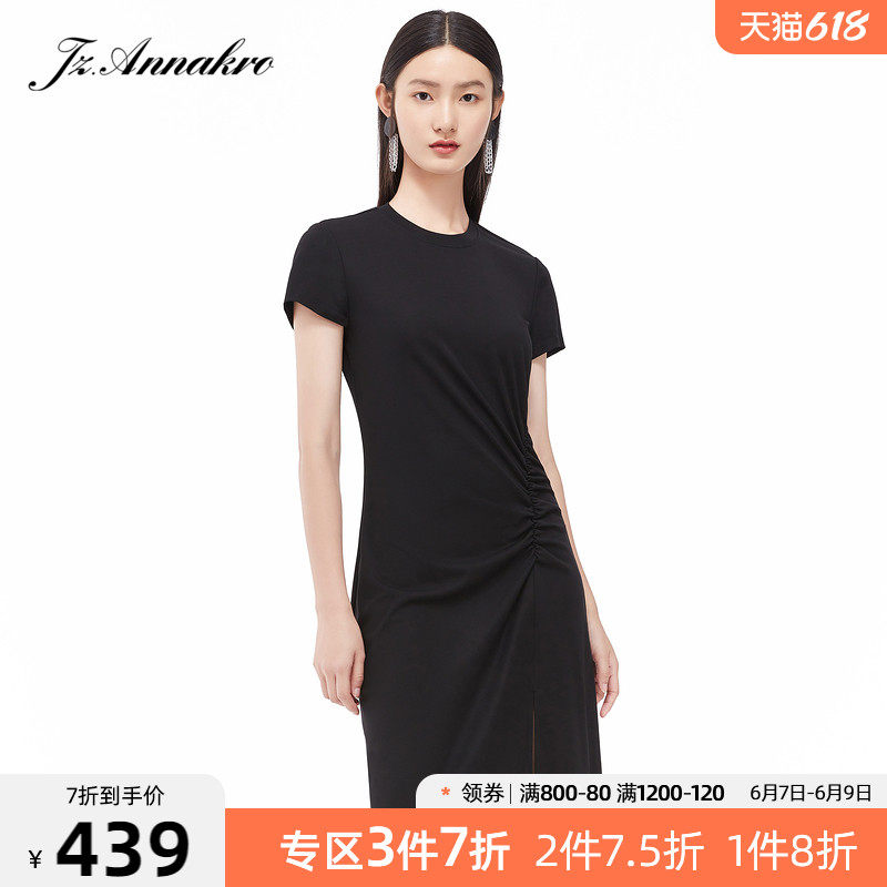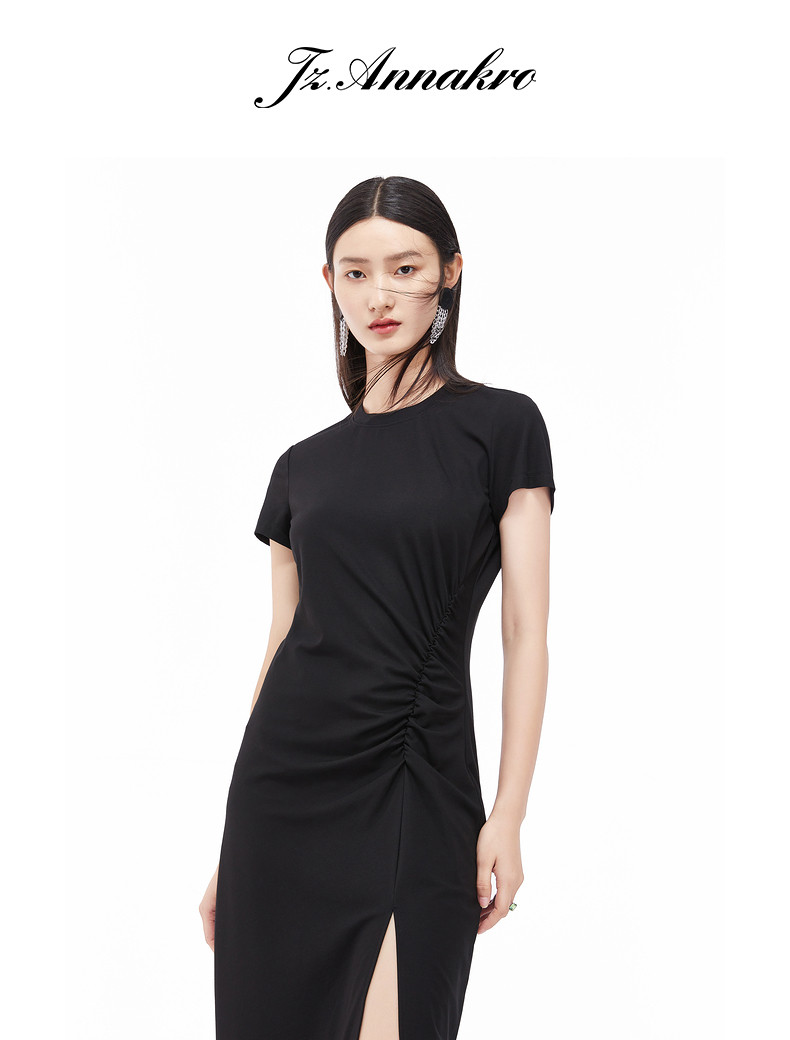 玖姿2021夏季新款安娜蔻系列黑色修身高开叉时尚收褶长款女连衣裙
