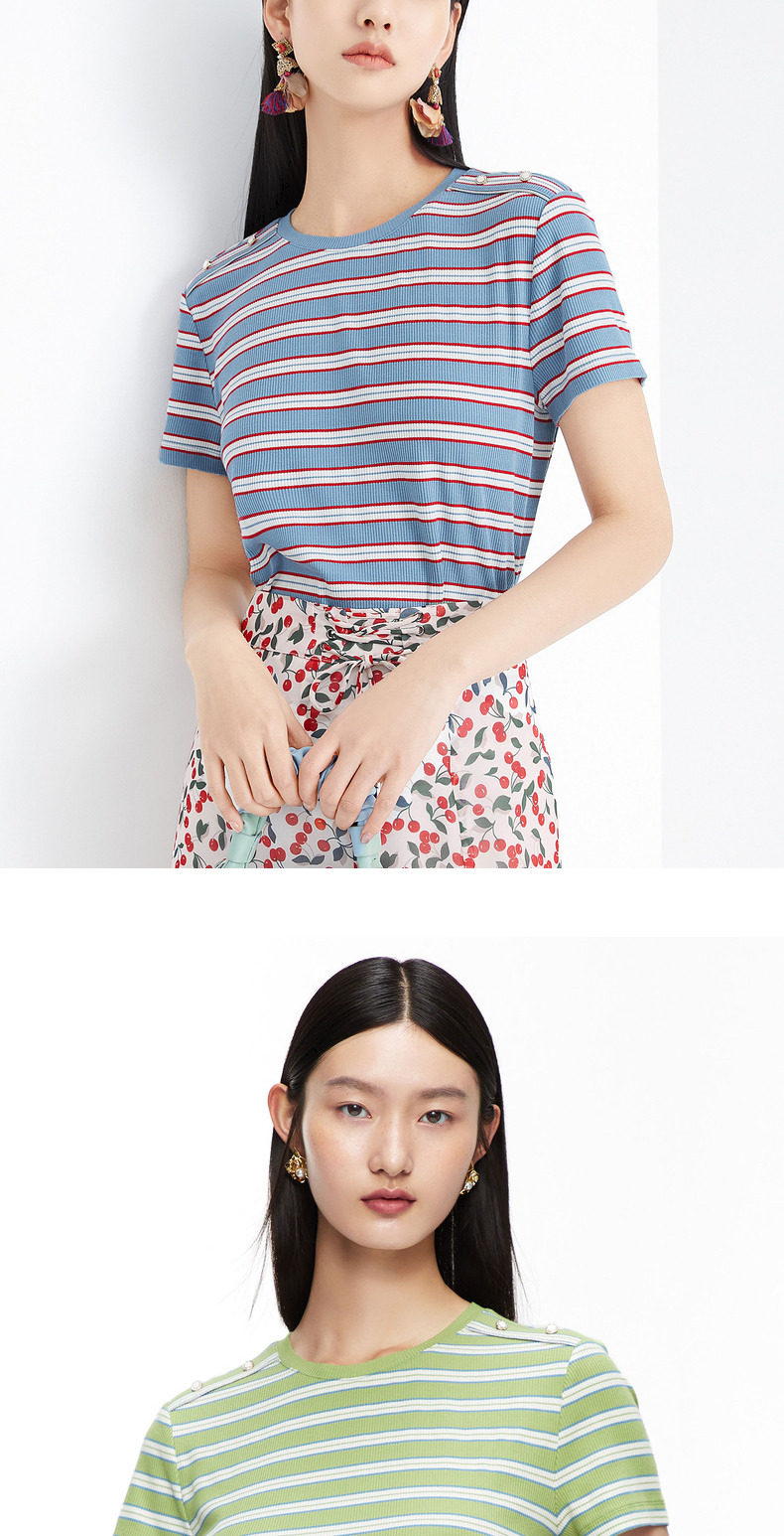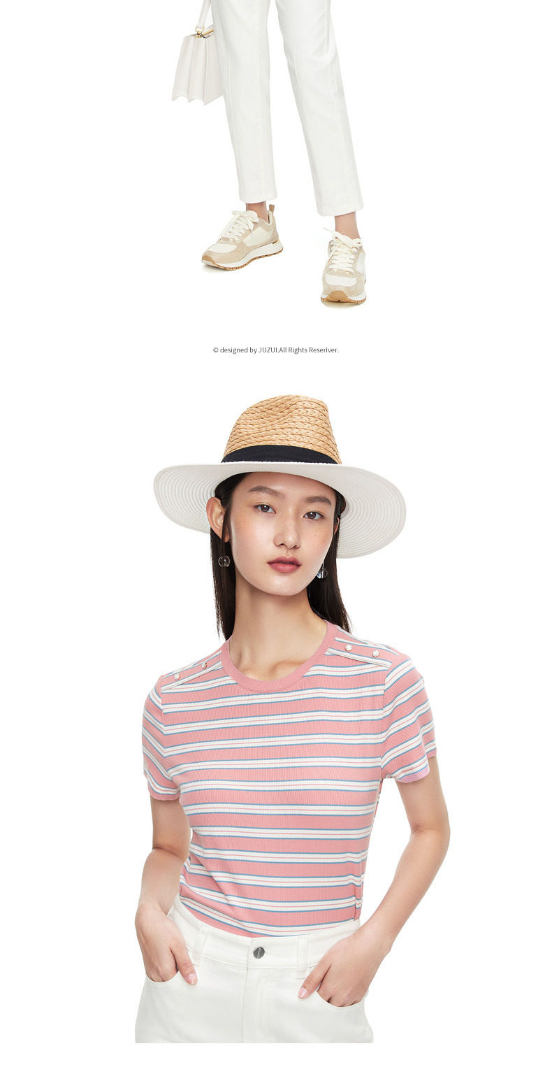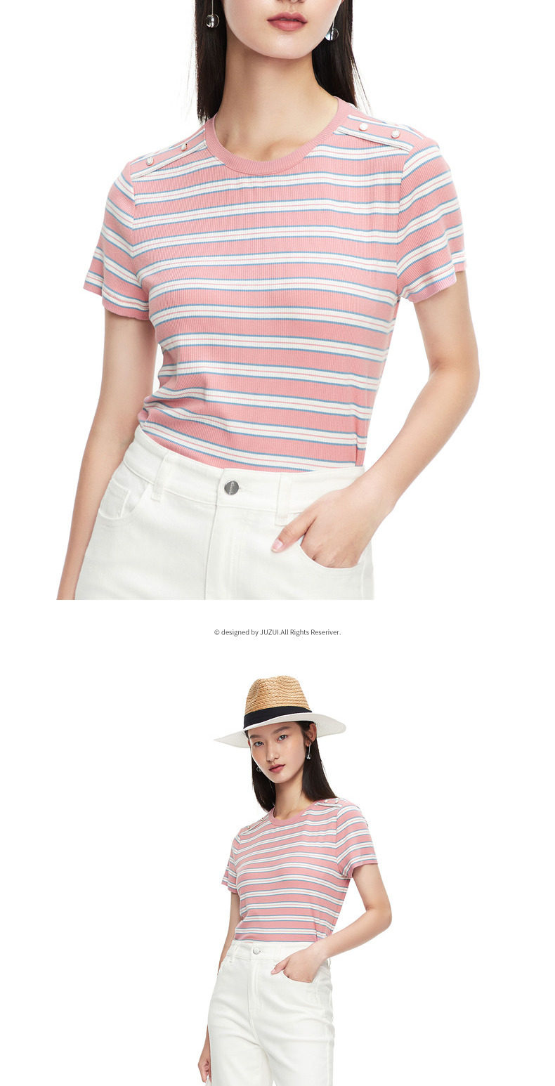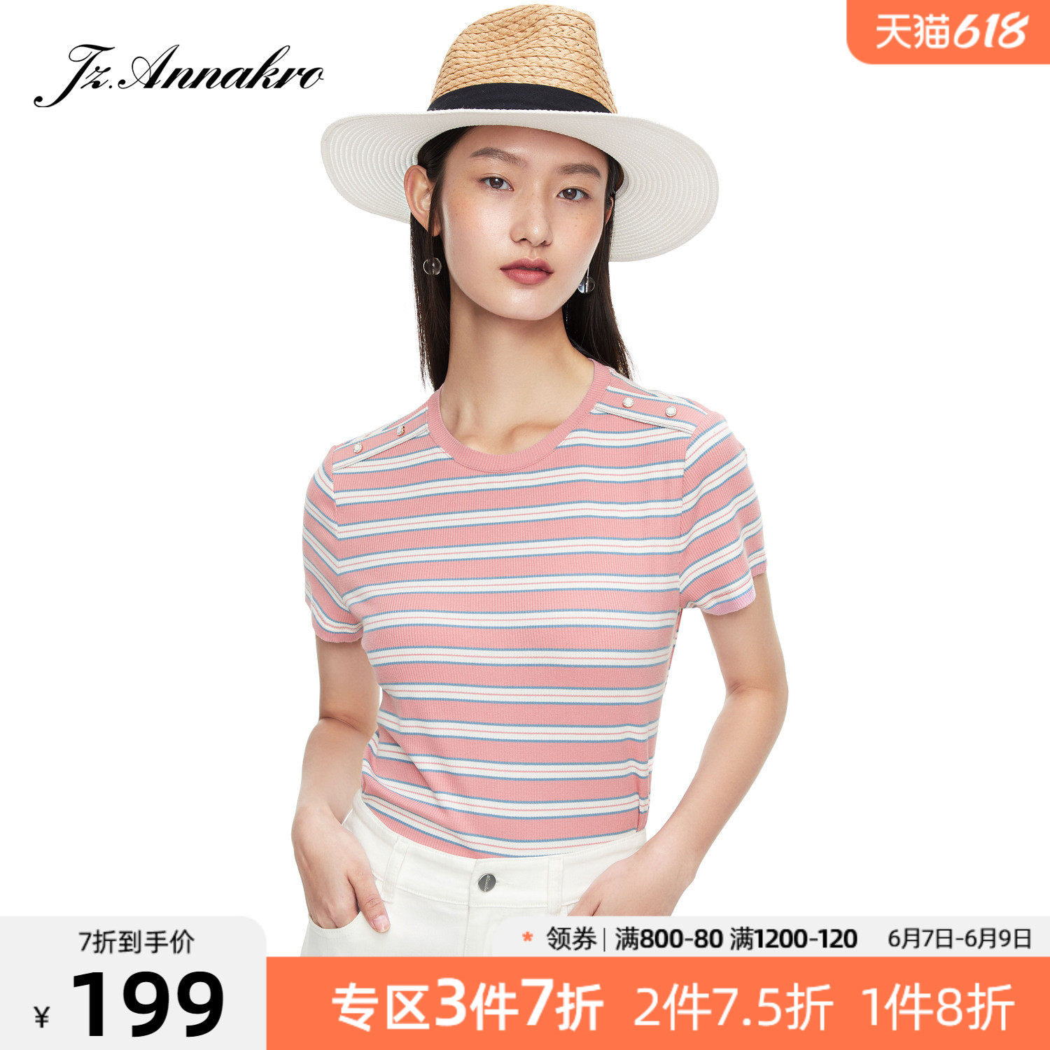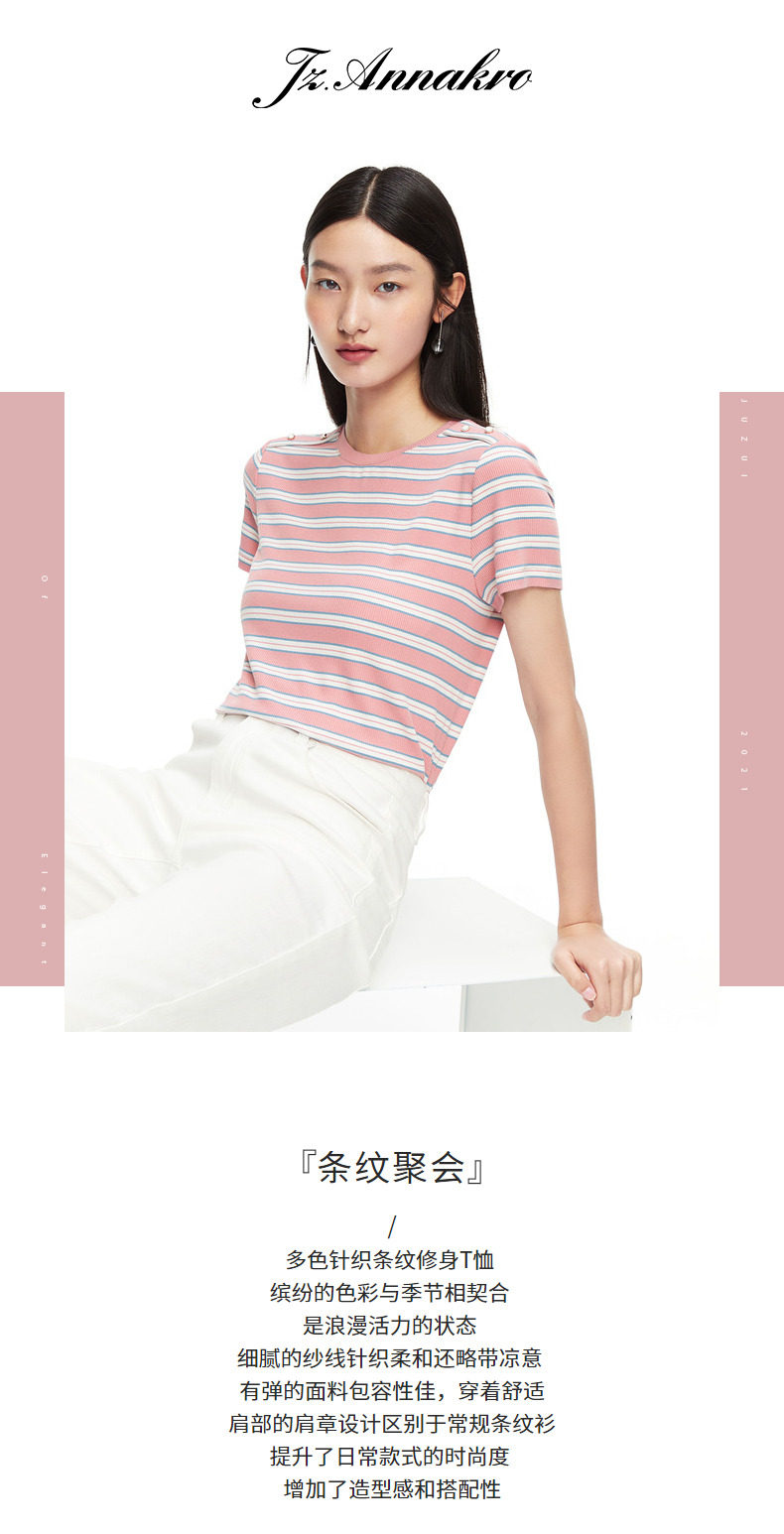 首页 > 玖姿专区 > 玖姿服饰 > 玖姿2021夏季新款安娜蔻系列时尚修身显瘦撞色条纹圆领针织女T恤