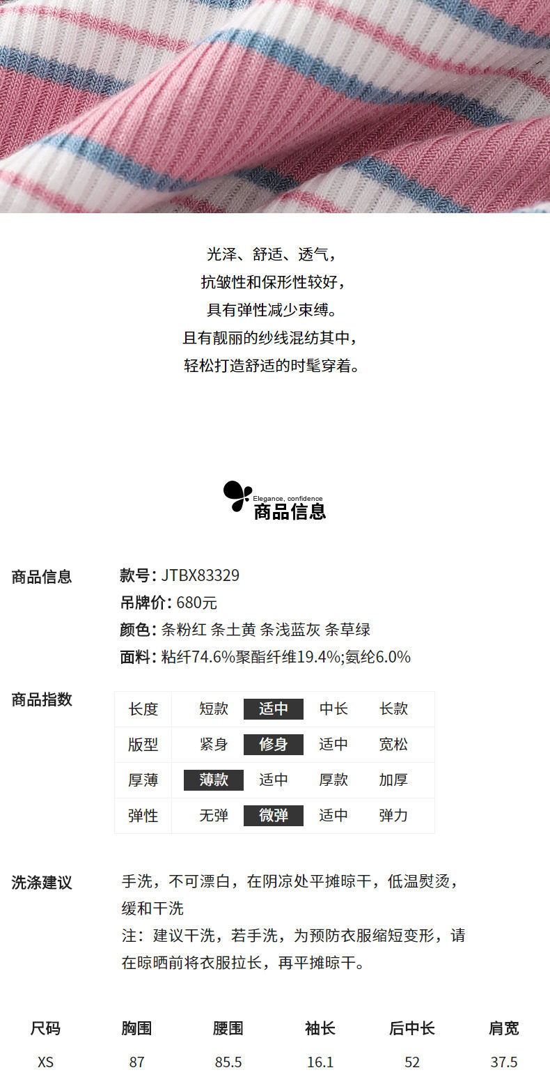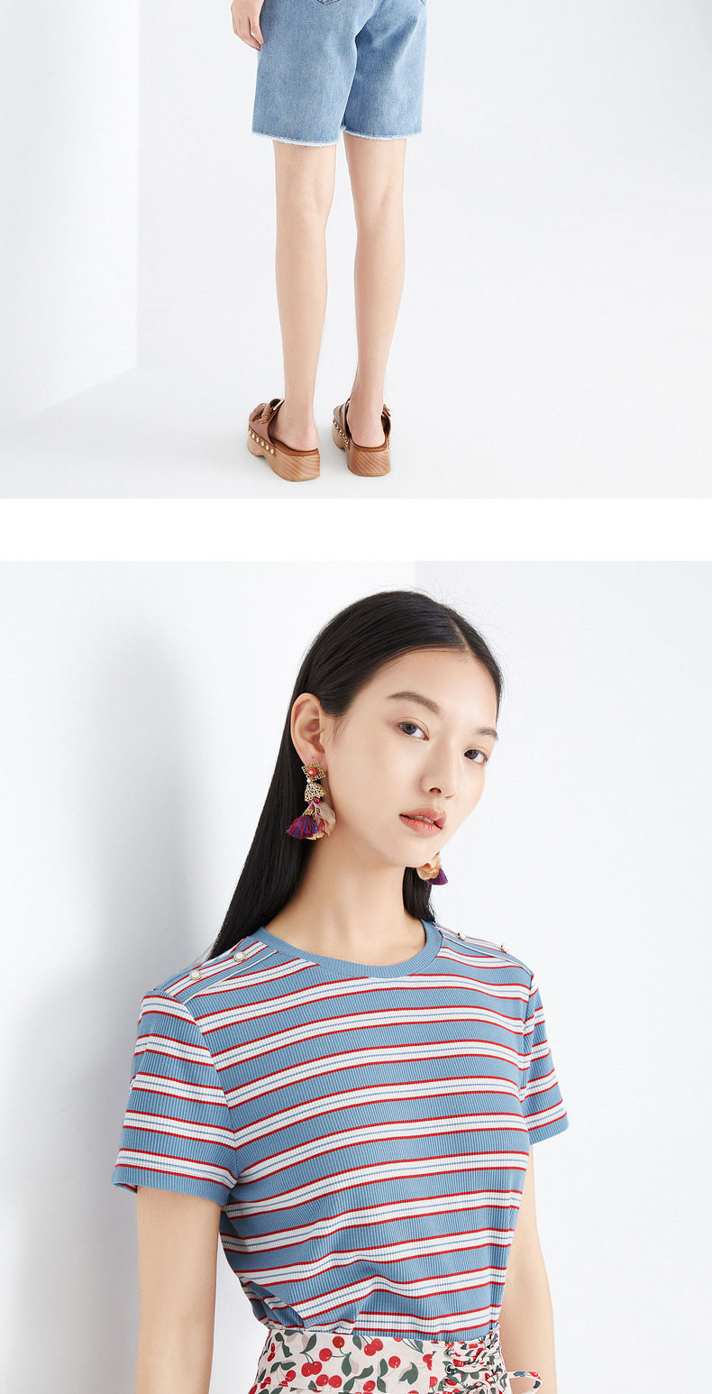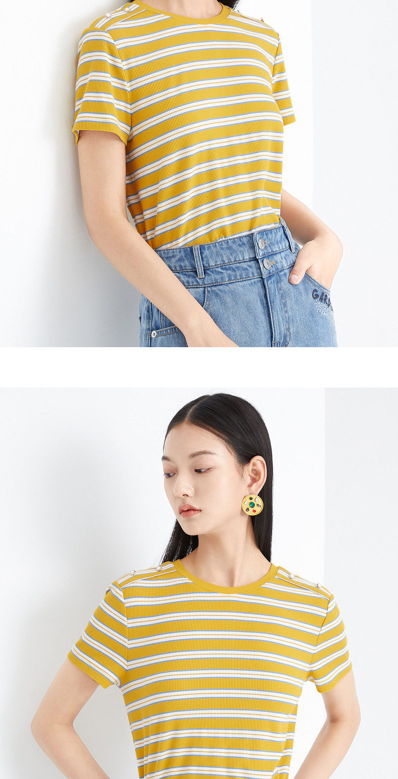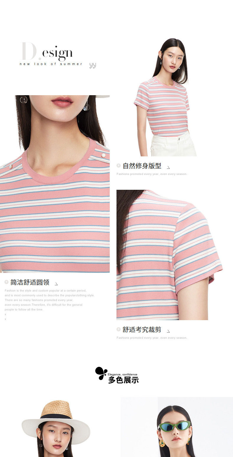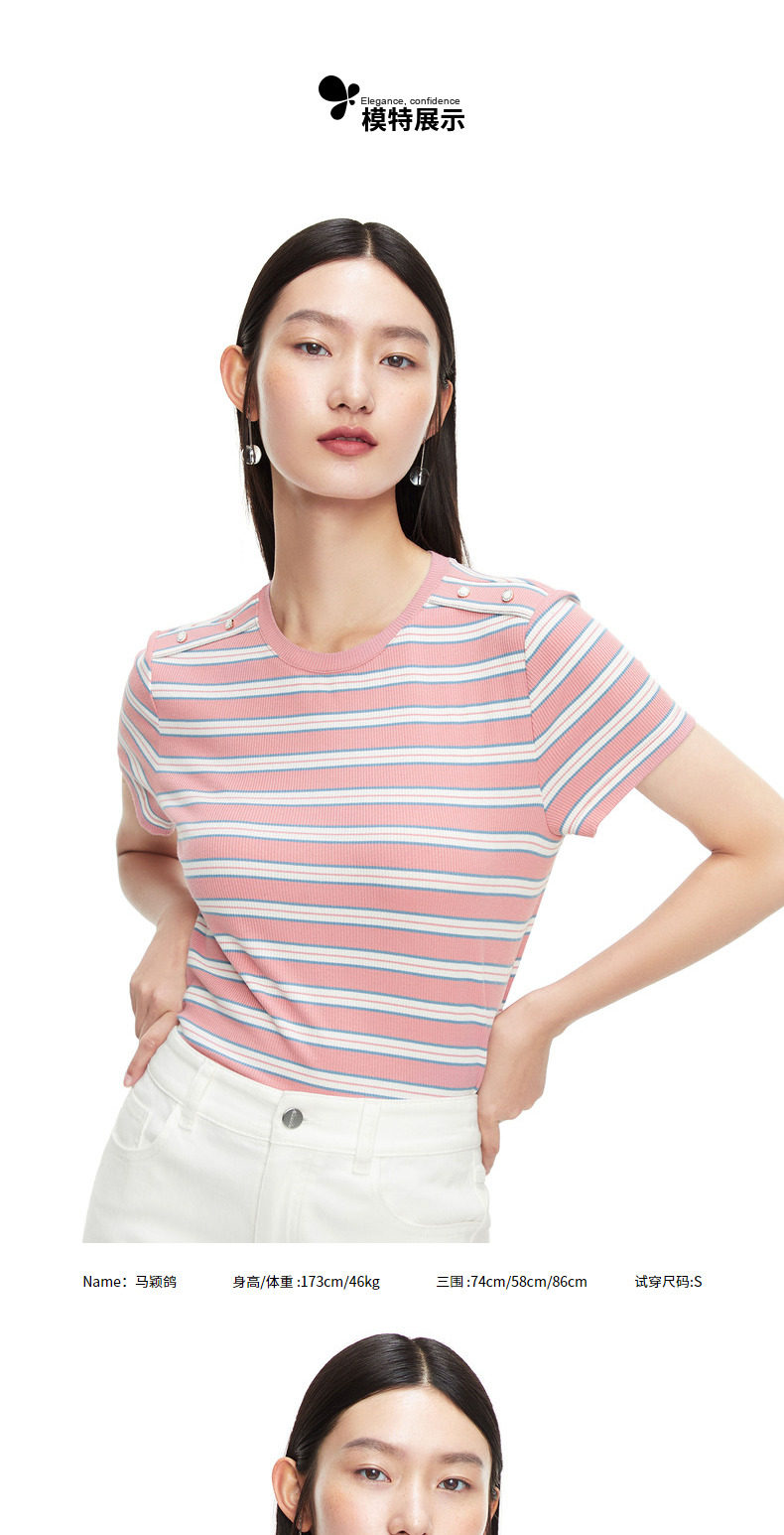 首页 > 玖姿专区 > 玖姿服饰 > 玖姿2021夏季新款安娜蔻系列时尚修身显瘦撞色条纹圆领针织女T恤