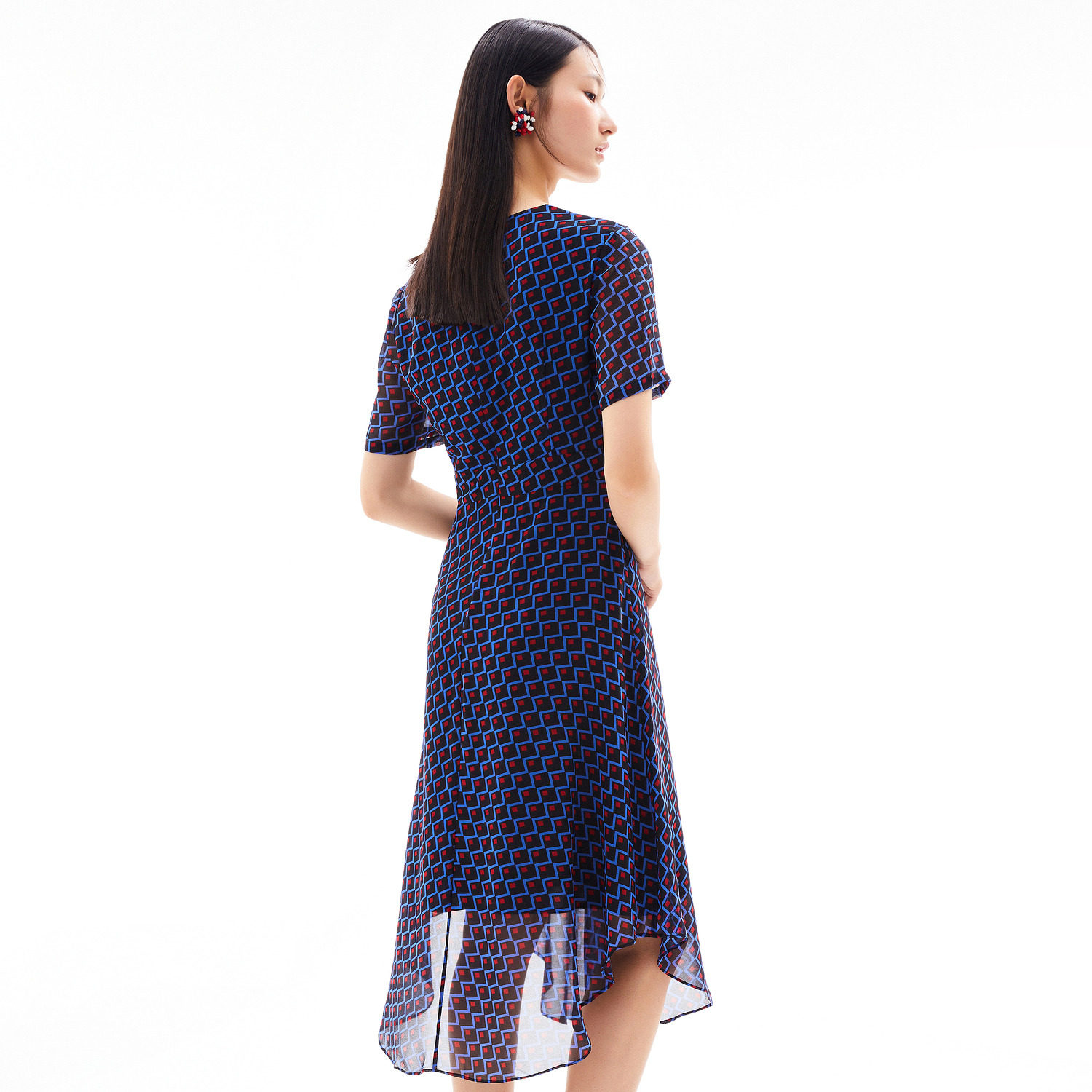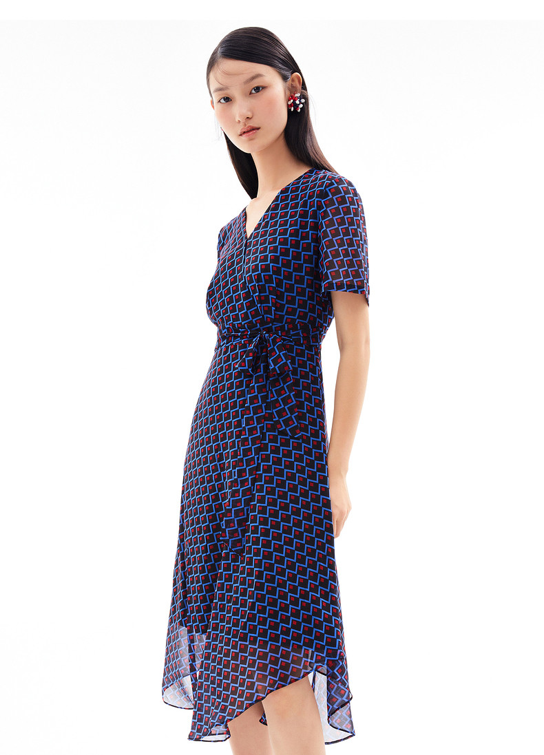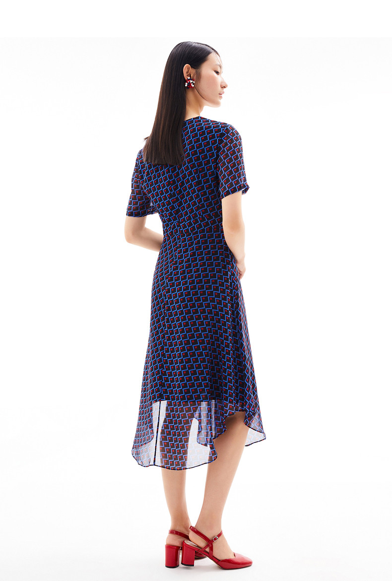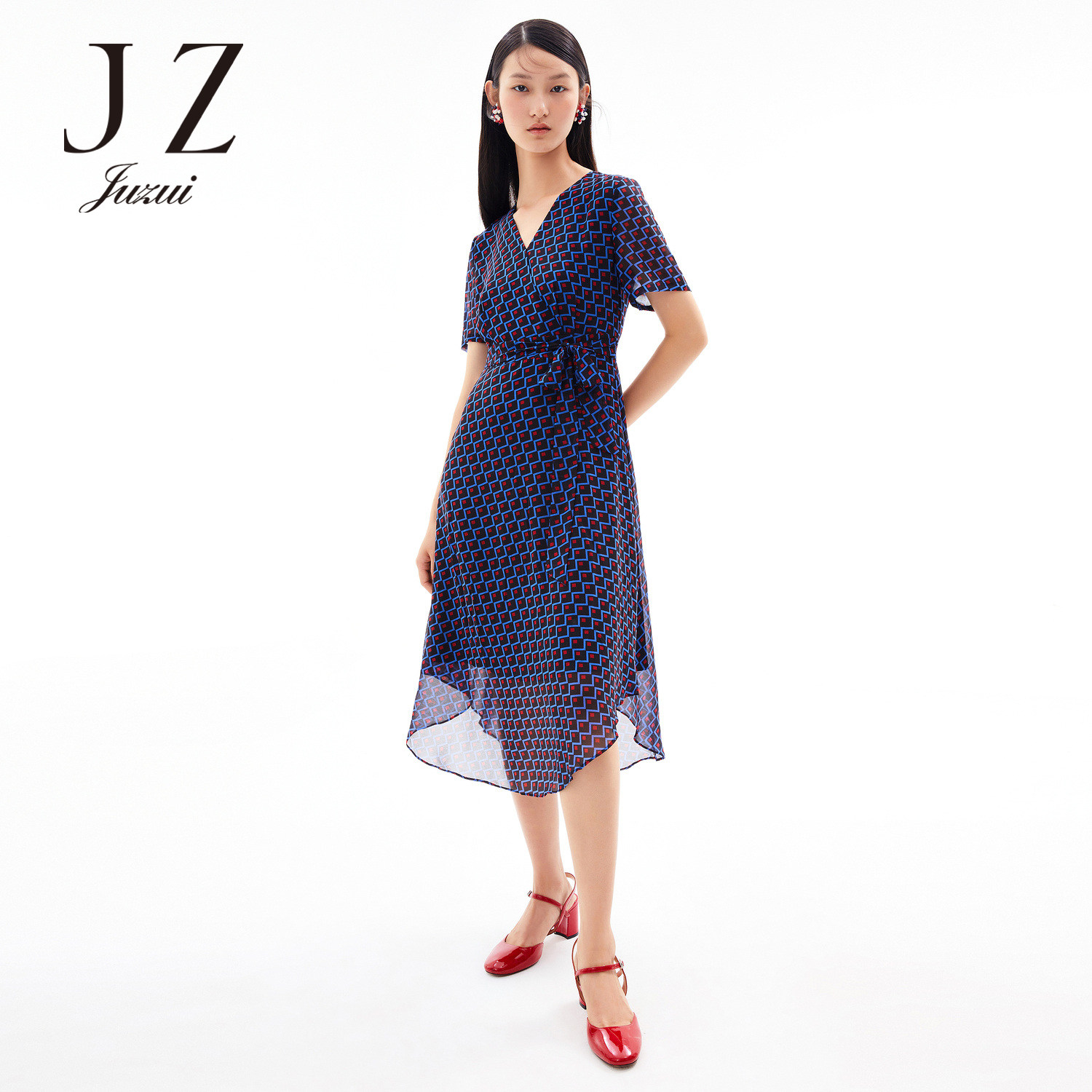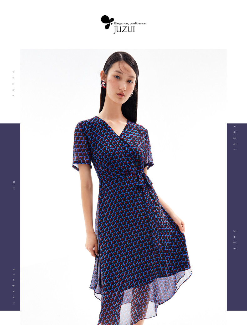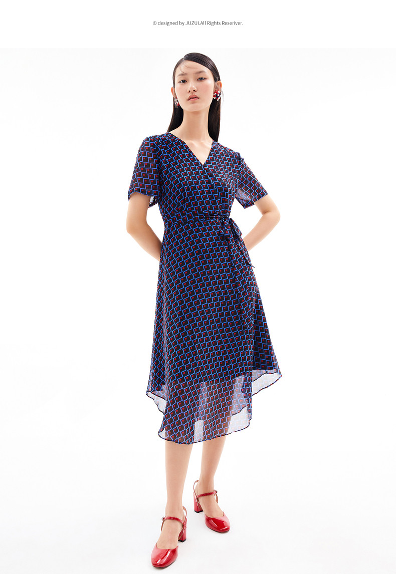 JUZUI/玖姿官方旗舰店2021夏季新款时尚几何收腰长款女雪纺连衣裙
