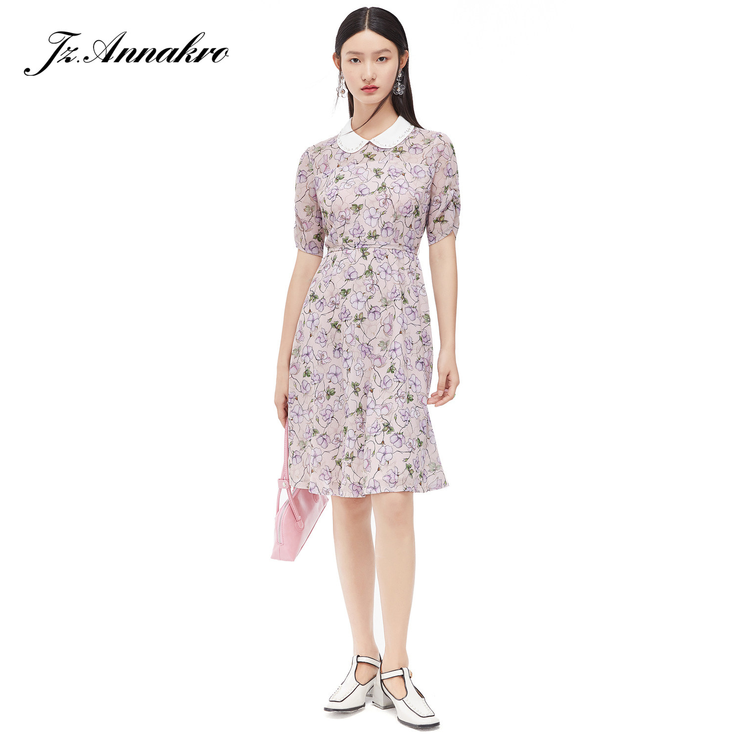 JUZUI/玖姿官方旗舰店2021夏季新款翻领钉珠印花中长收腰女连衣裙