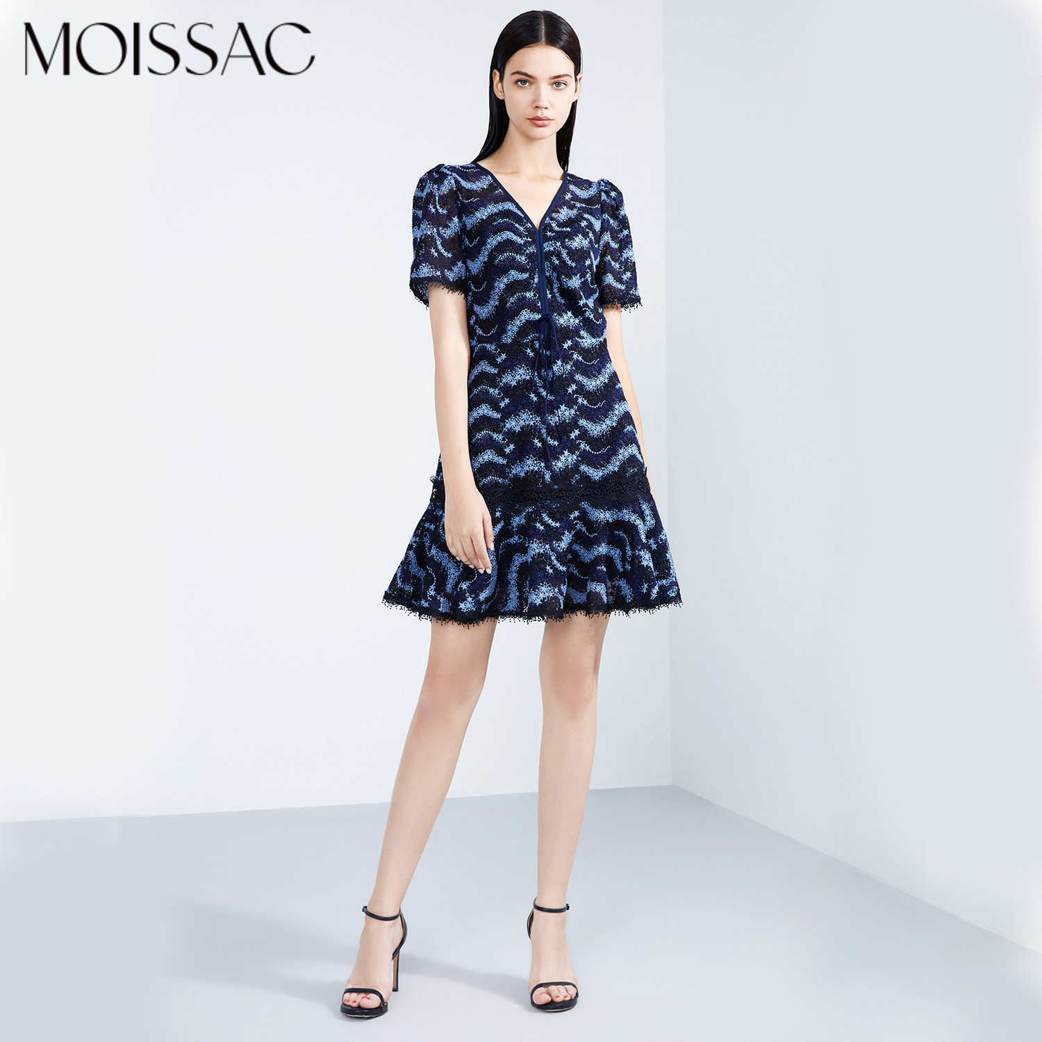 MOISSAC/摩萨克2021夏季新款条纹蕾丝星星气质收腰中长款女连衣裙