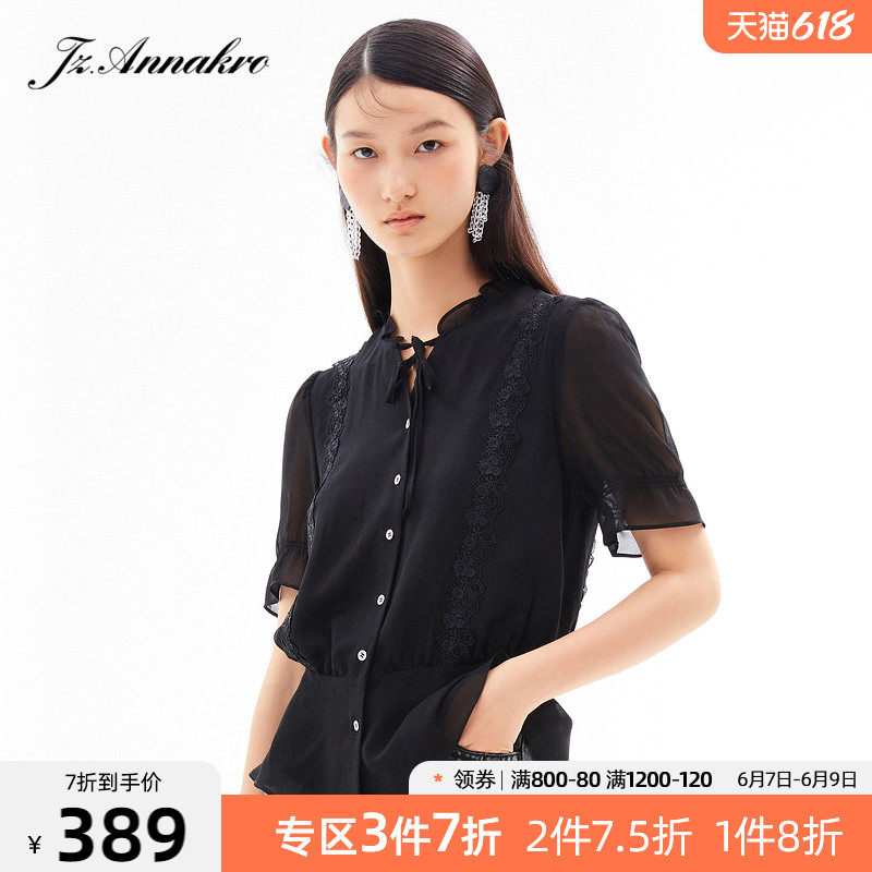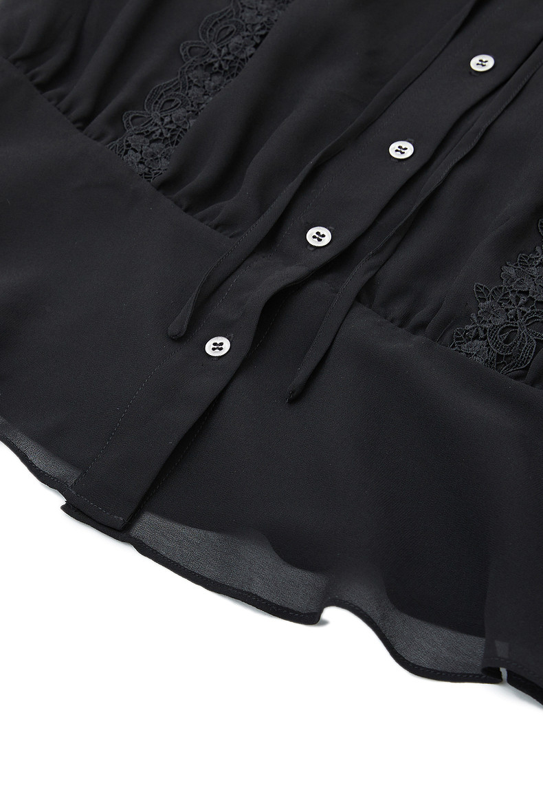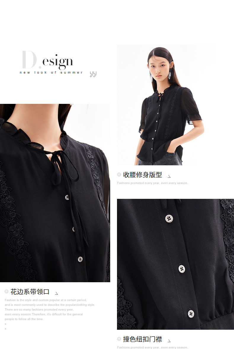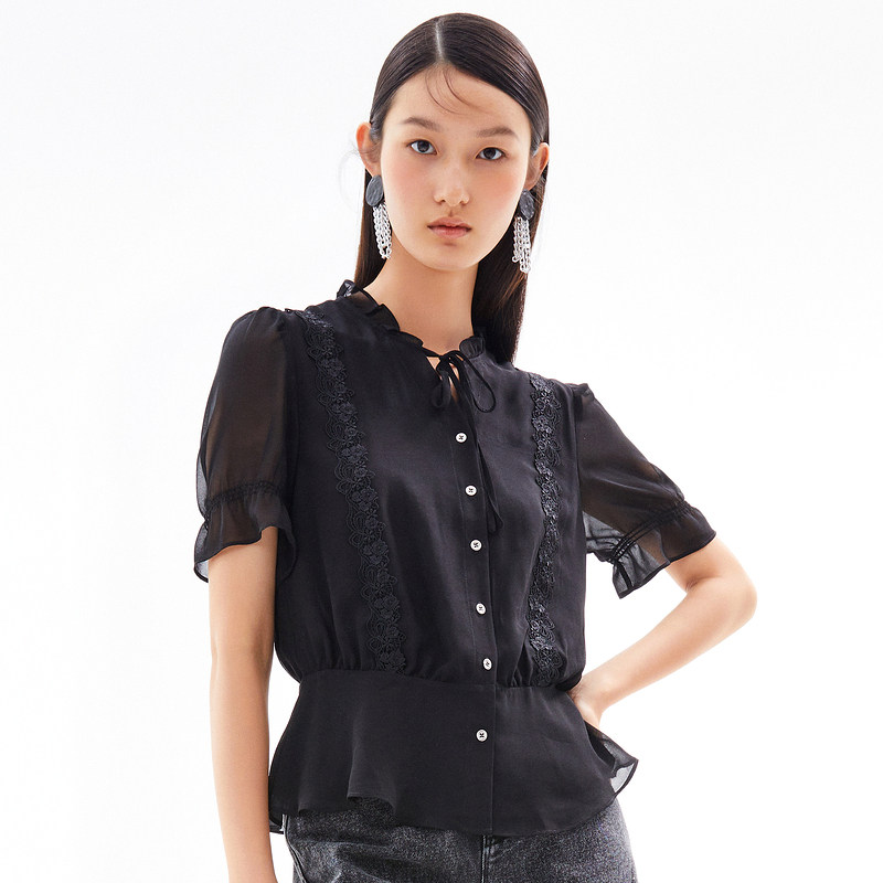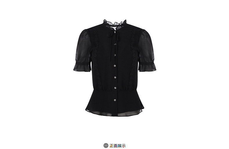 首页 > 玖姿专区 > 玖姿服饰 > 玖姿2021夏季新款安娜蔻系列黑色系带蕾丝拼接收腰女短袖雪纺衫