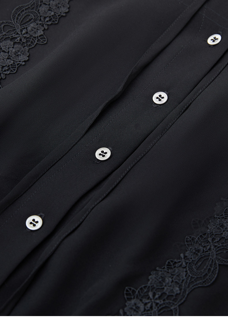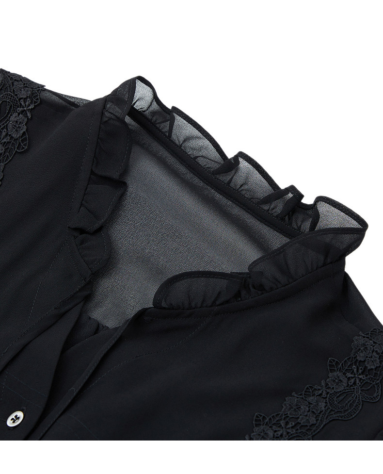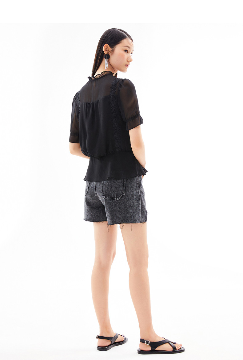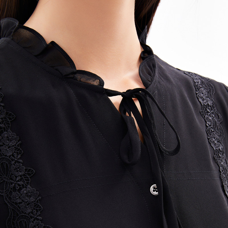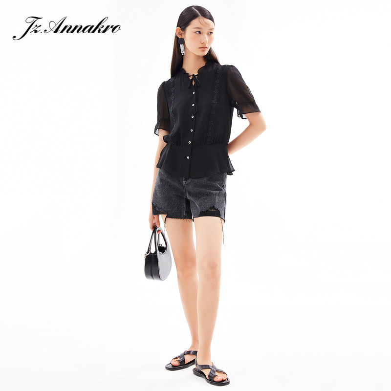 首页 > 玖姿专区 > 玖姿服饰 > 玖姿2021夏季新款安娜蔻系列黑色系带蕾丝拼接收腰女短袖雪纺衫