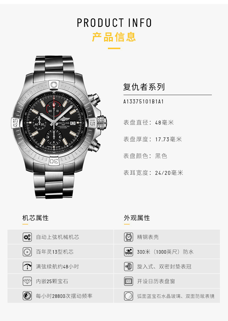 首页 > 手表专区 > 百年灵超级复仇者计时腕表新款48男女款瑞士机械腕表