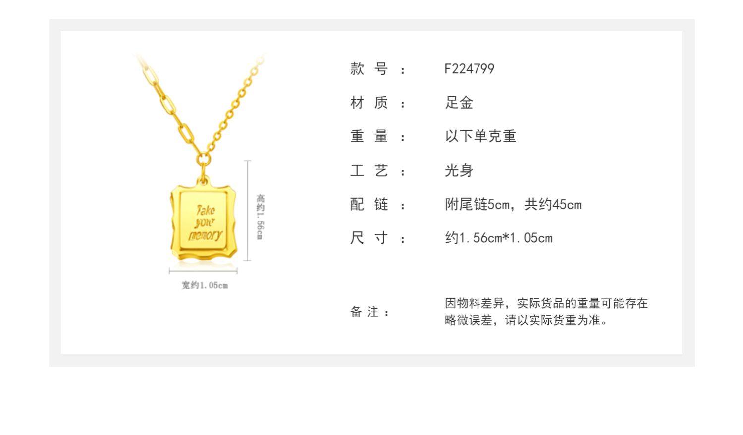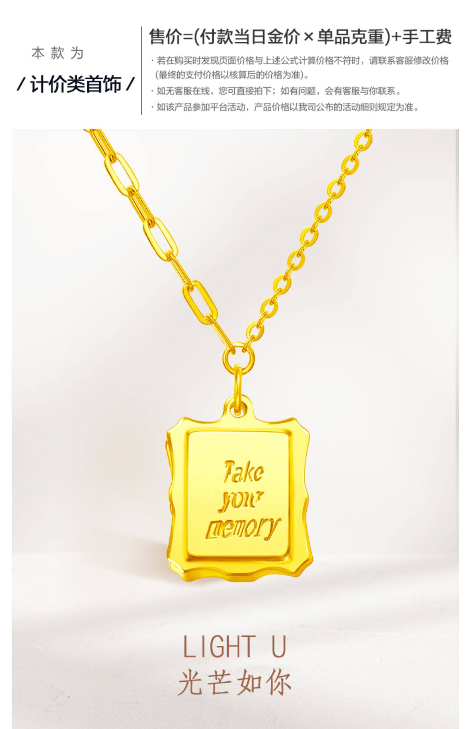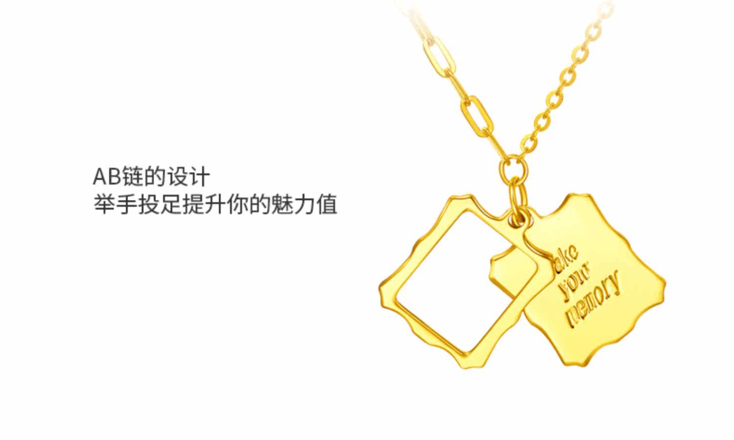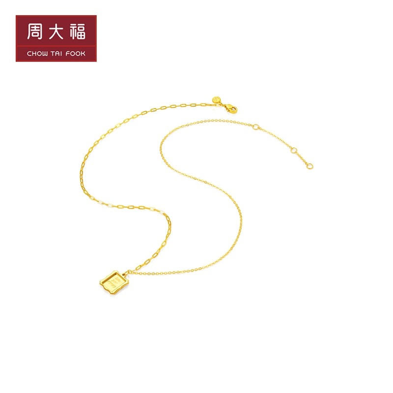 新款 周大福珠宝首饰方牌字母足金黄金项链吊坠计价F224799