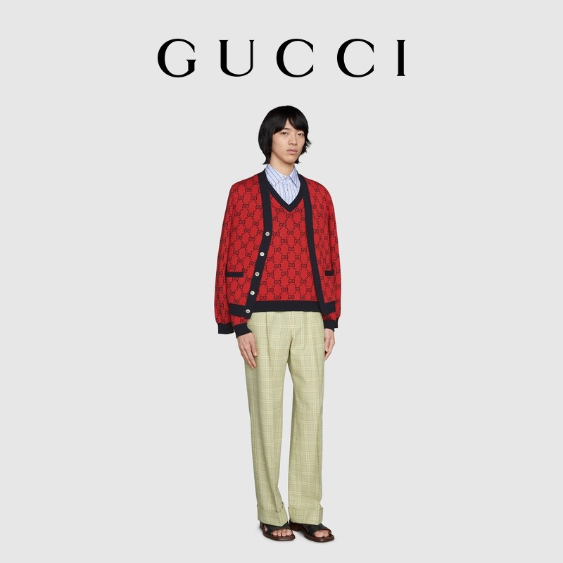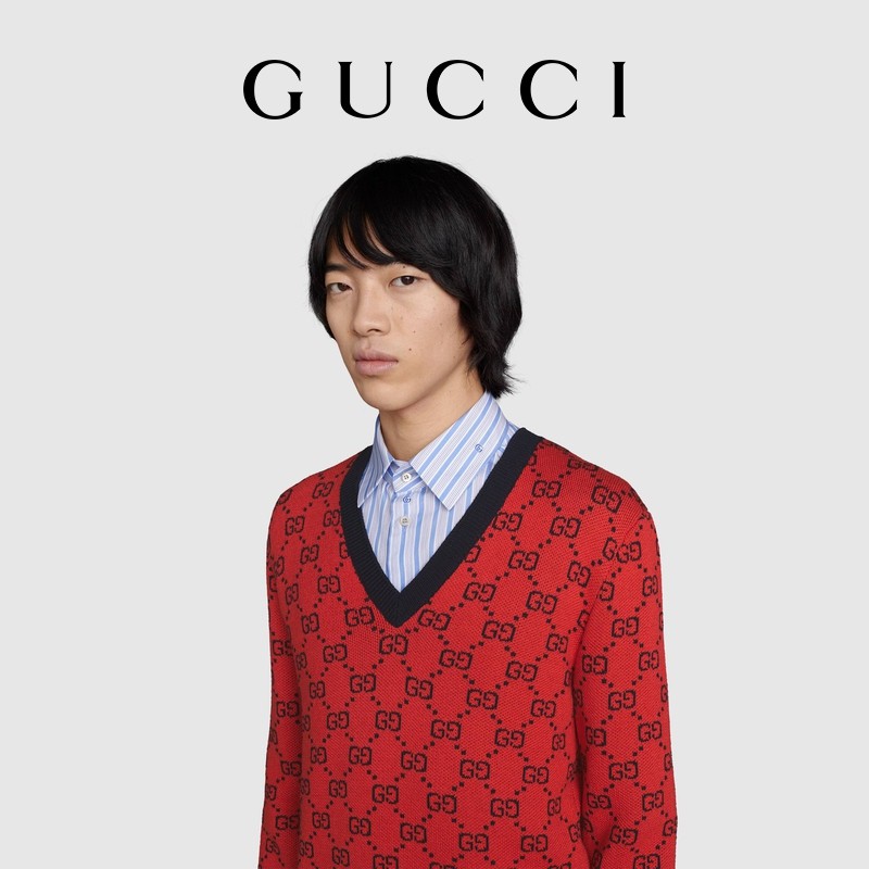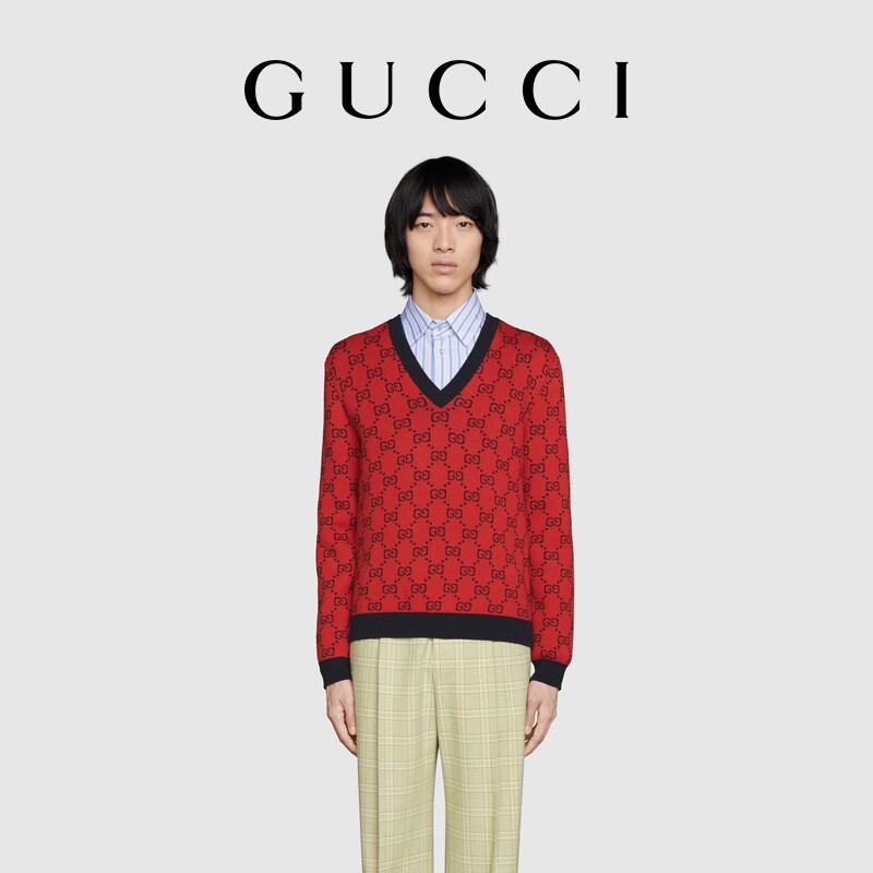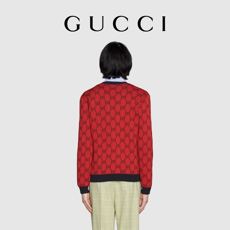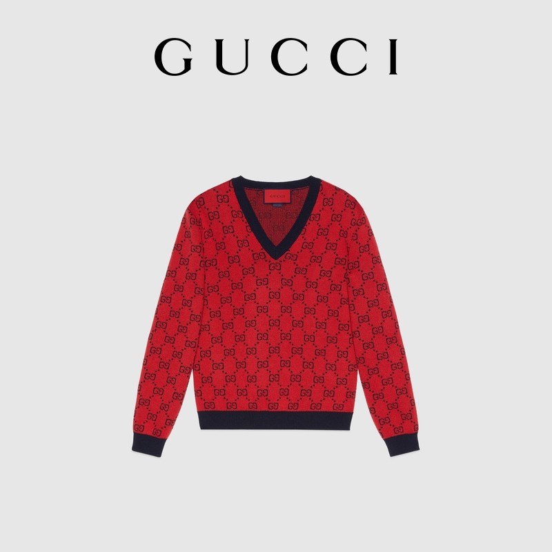 [新品]GUCCI古驰520特别系列GG提花棉毛混纺V领毛衣
