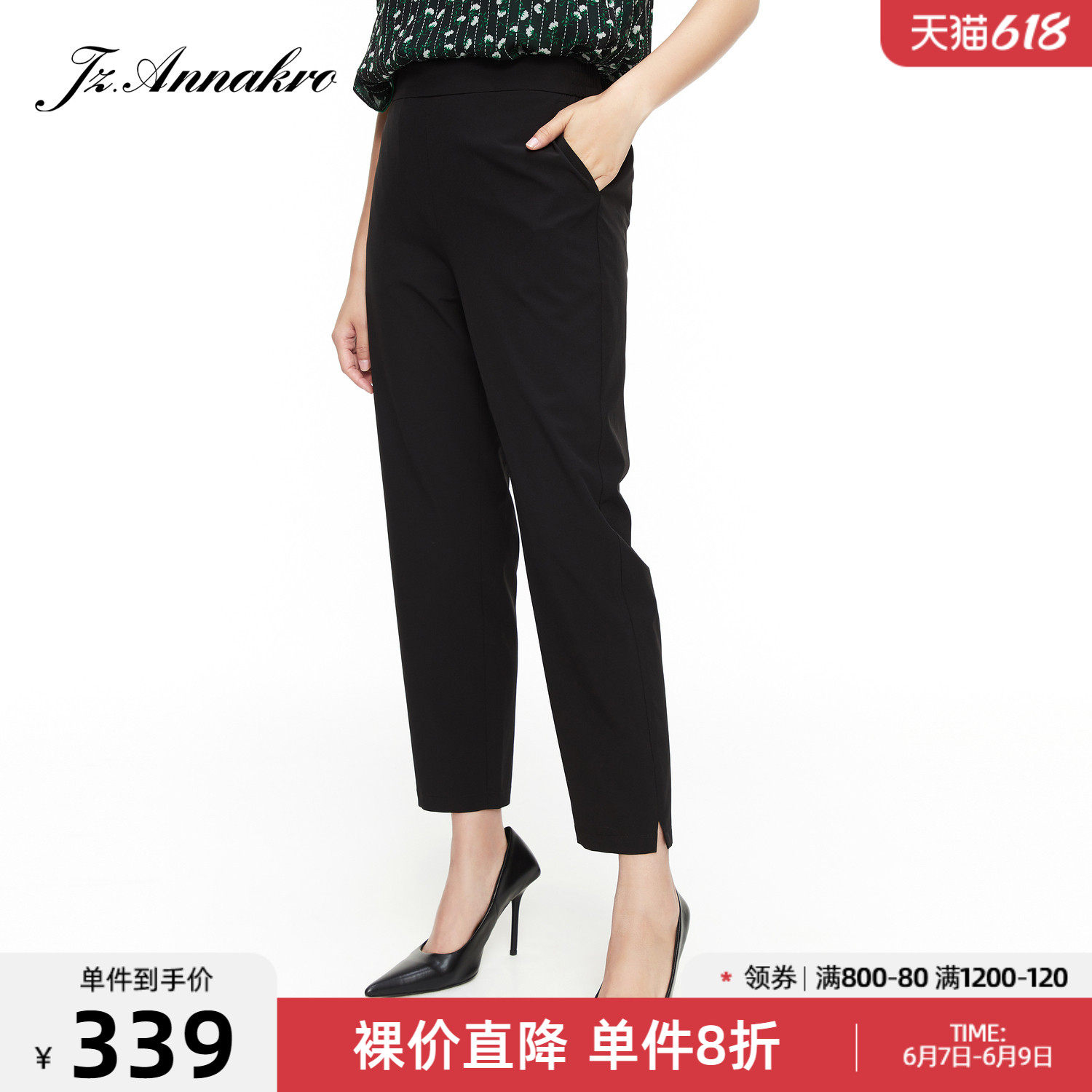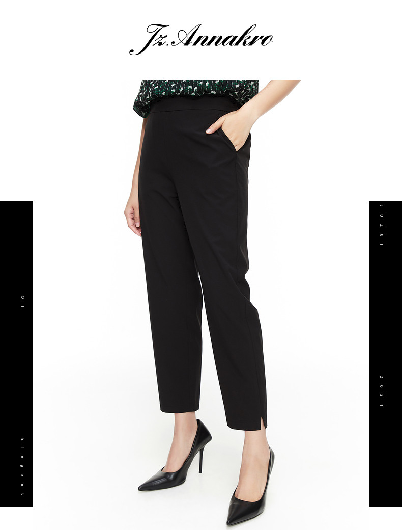 玖姿2021夏季新款安娜蔻系列黑色通勤时尚款显瘦哈伦女休闲裤