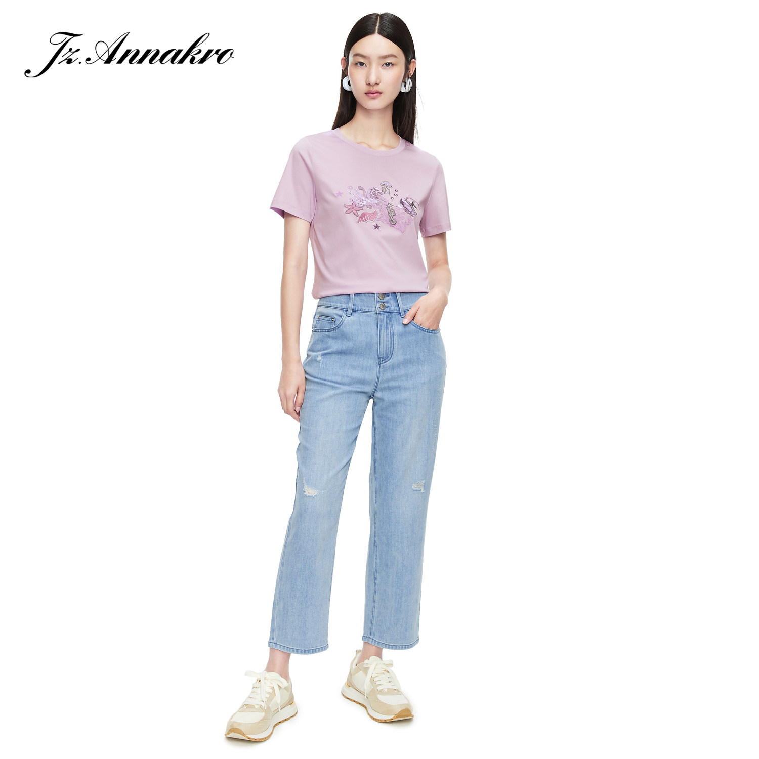 玖姿2021夏季新款安娜蔻系列蓝色高腰显瘦水洗九分直筒女牛仔裤