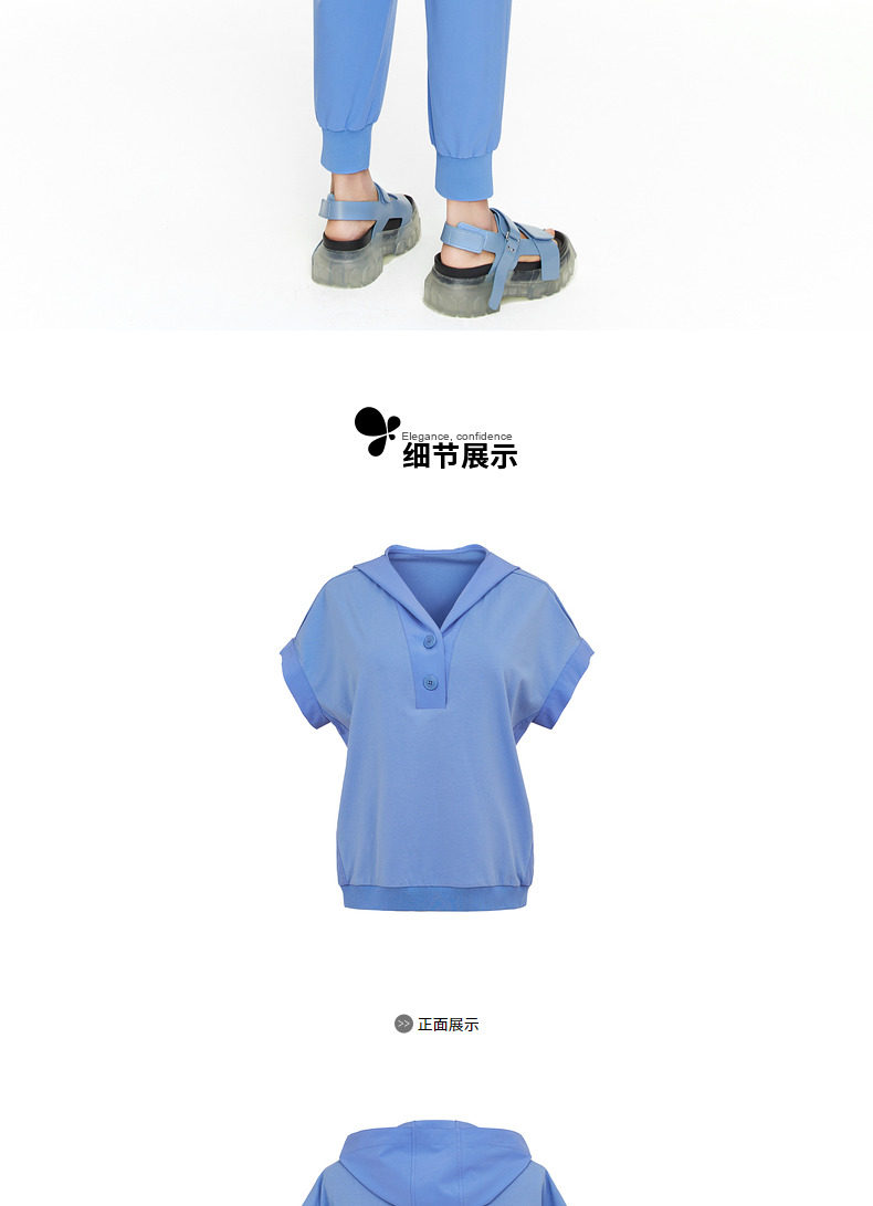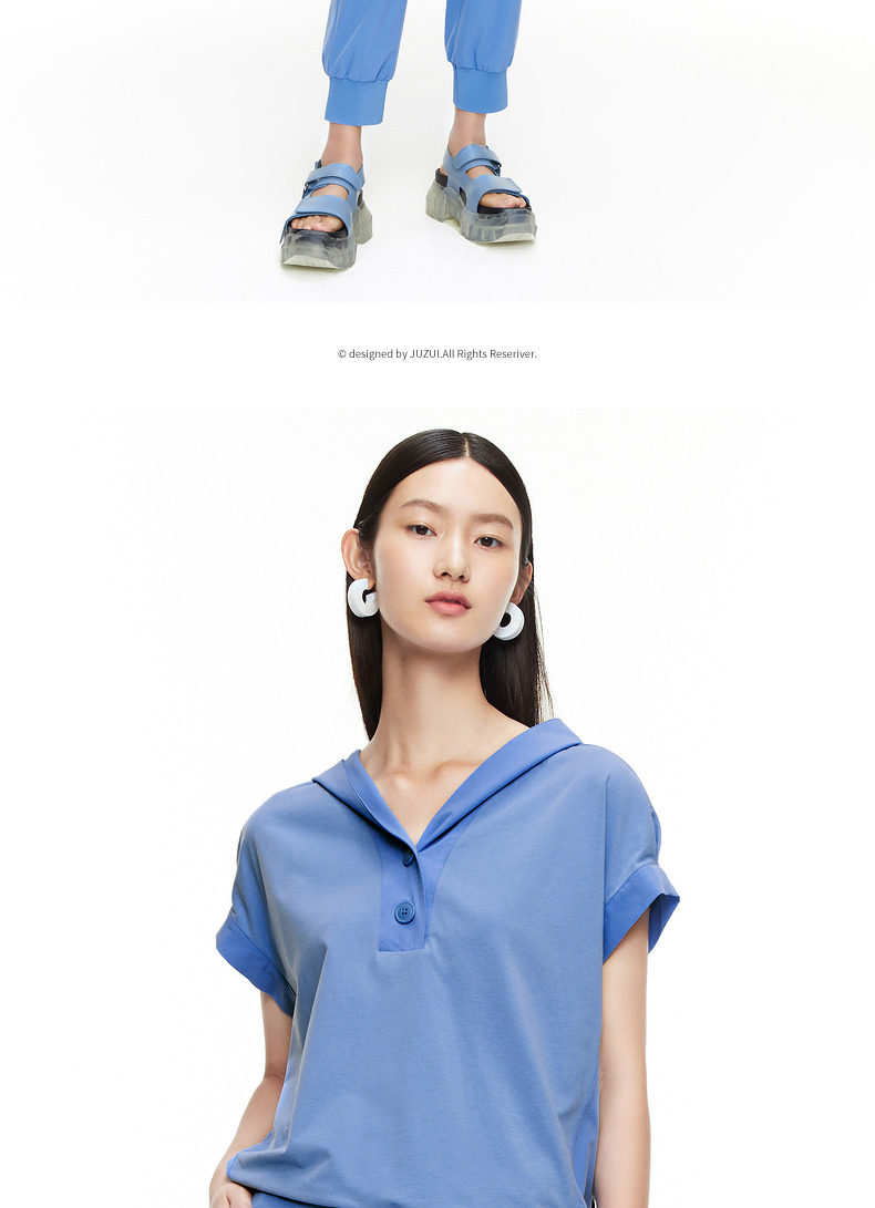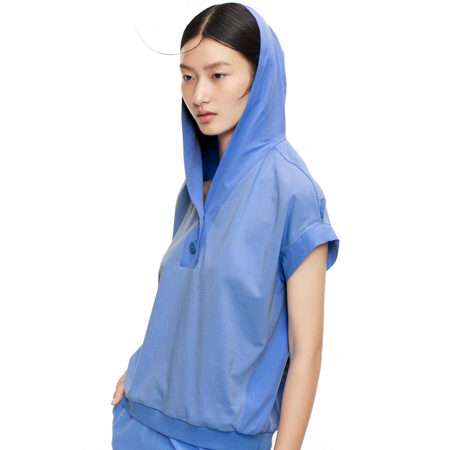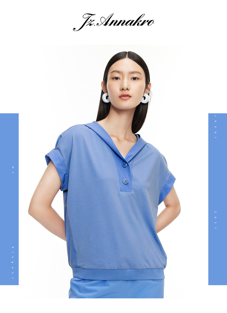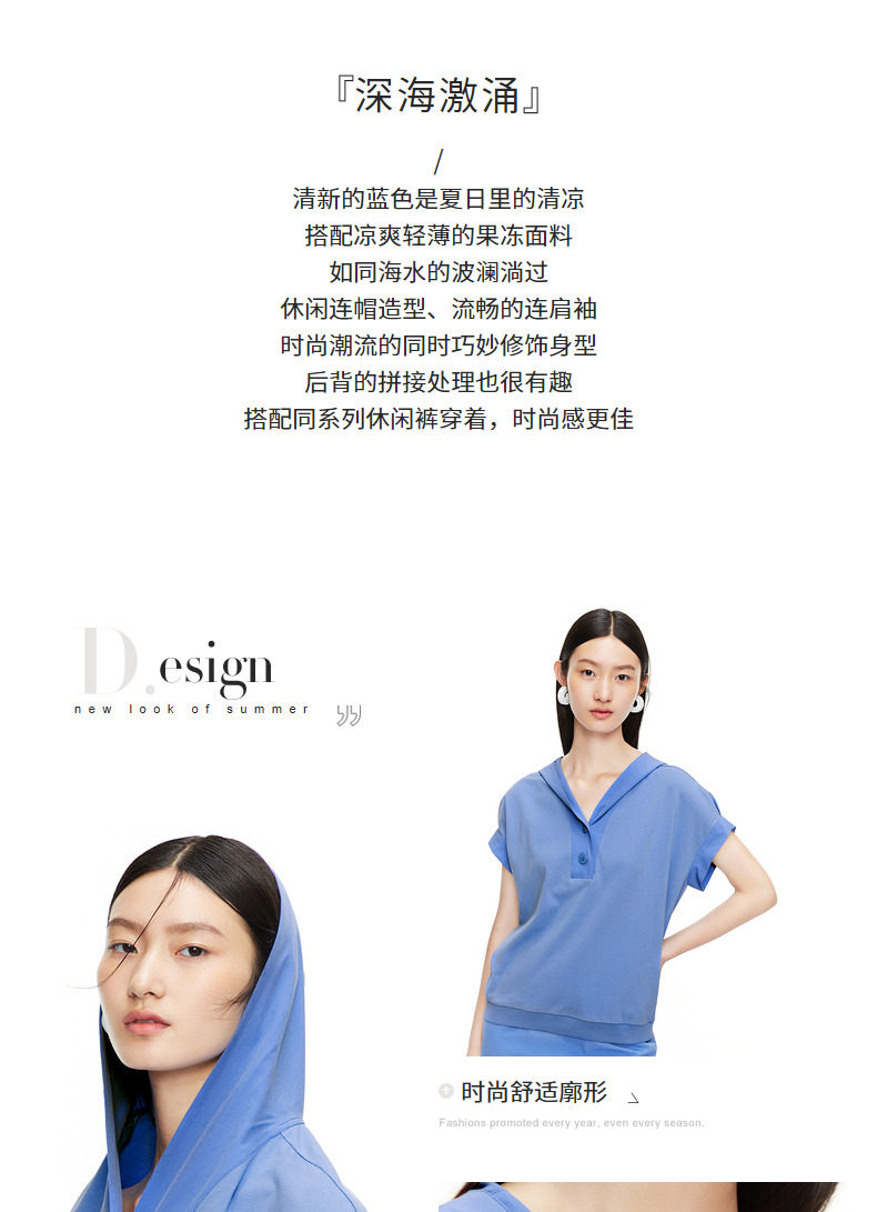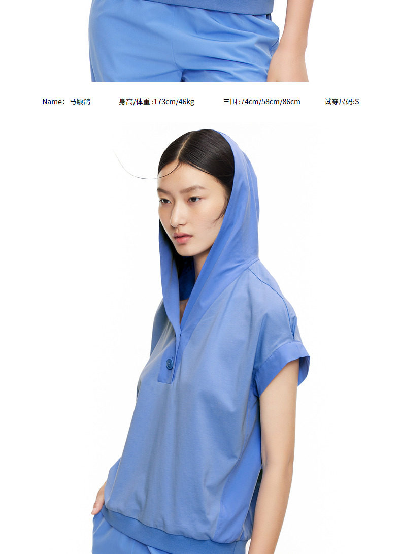 首页 > 玖姿专区 > 玖姿服饰 > 玖姿2021夏季新款安娜蔻系列蓝色连帽宽松廓形运动休闲凉爽女T恤