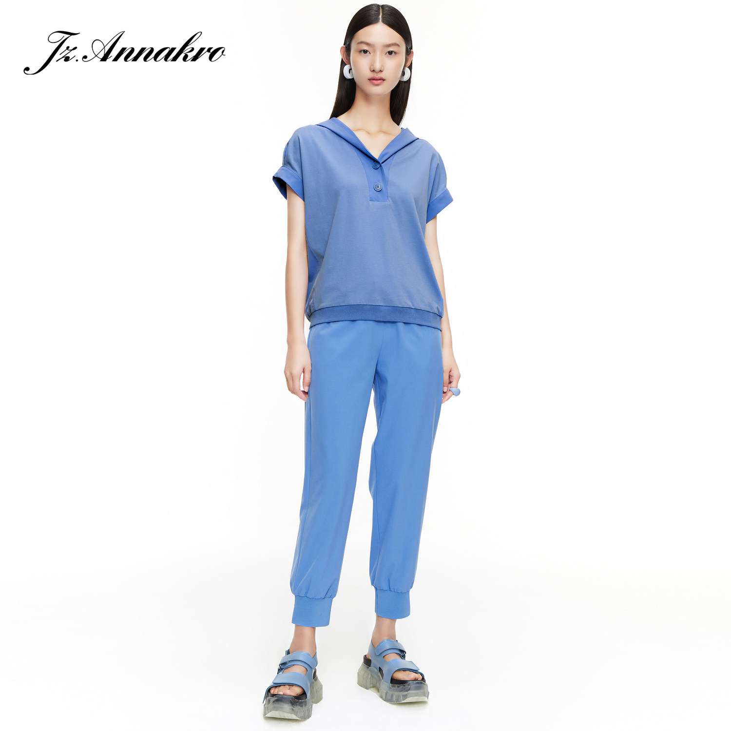 玖姿2021夏季新款安娜蔻系列蓝色连帽宽松廓形运动休闲凉爽女T恤